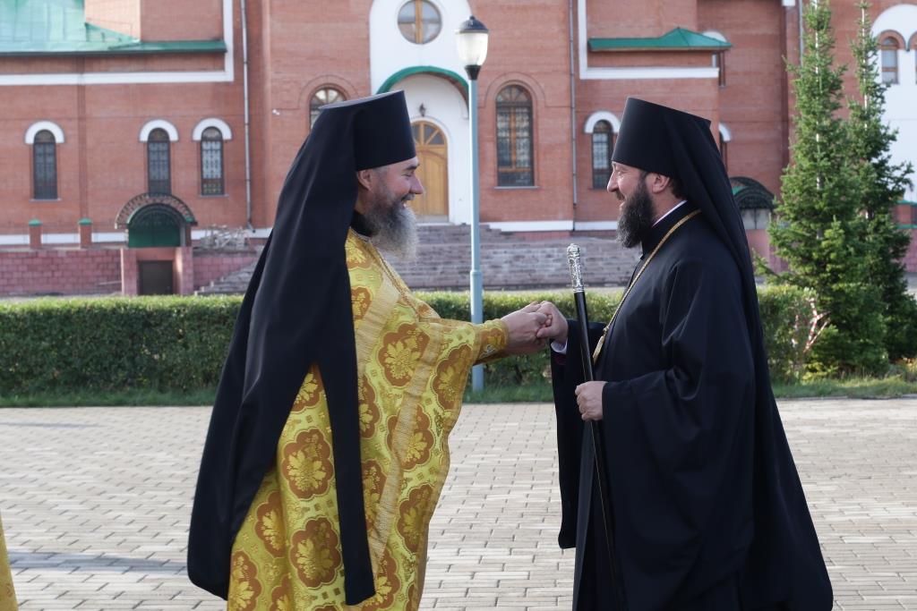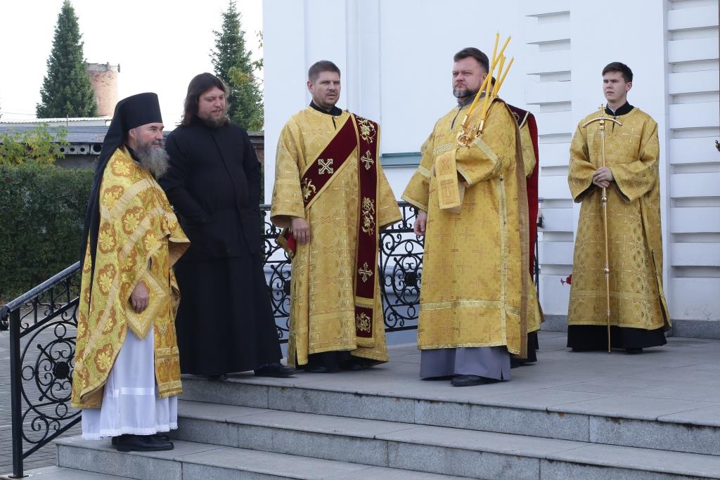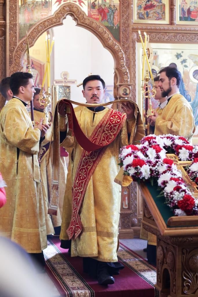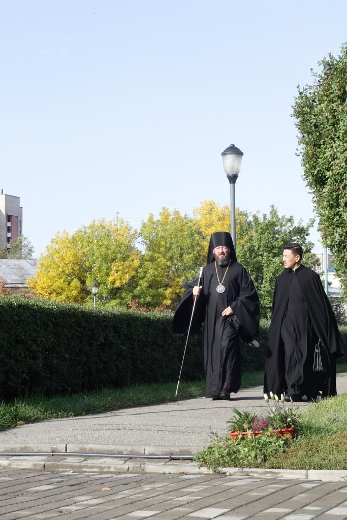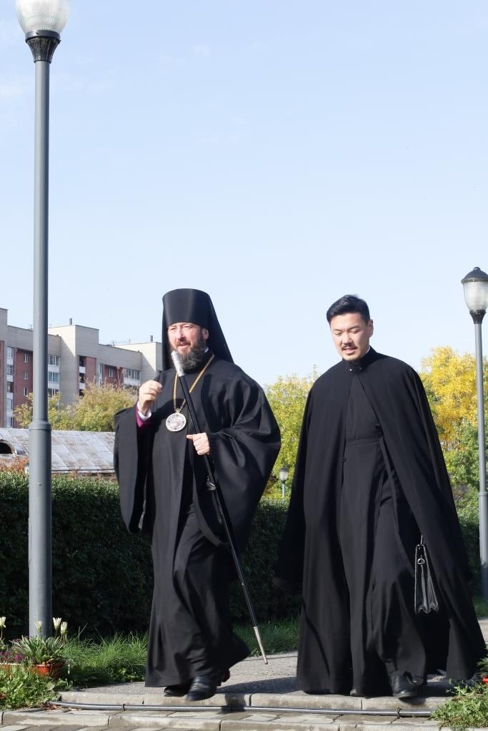Его Преосвященству сослужили: духовник епархии архимандрит Спиридон (Теплухин), ключарь Андреевского кафедрального собора иеромонах Никодим (Авдеев), заведующий канцелярией епархии иерей Константин Дьяков, секретарь епархии диакон Илия Кван, протодиакон Георгий Засыпкин, протодиакон Андрей Дудник, диакон Владимир Лаврешин.