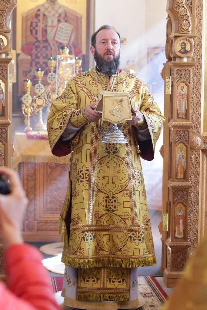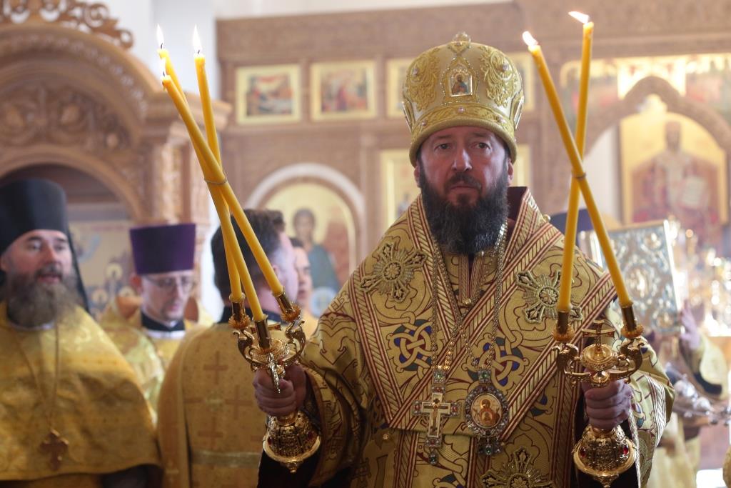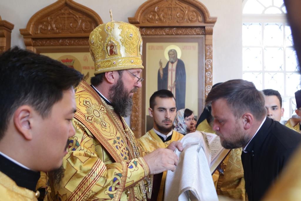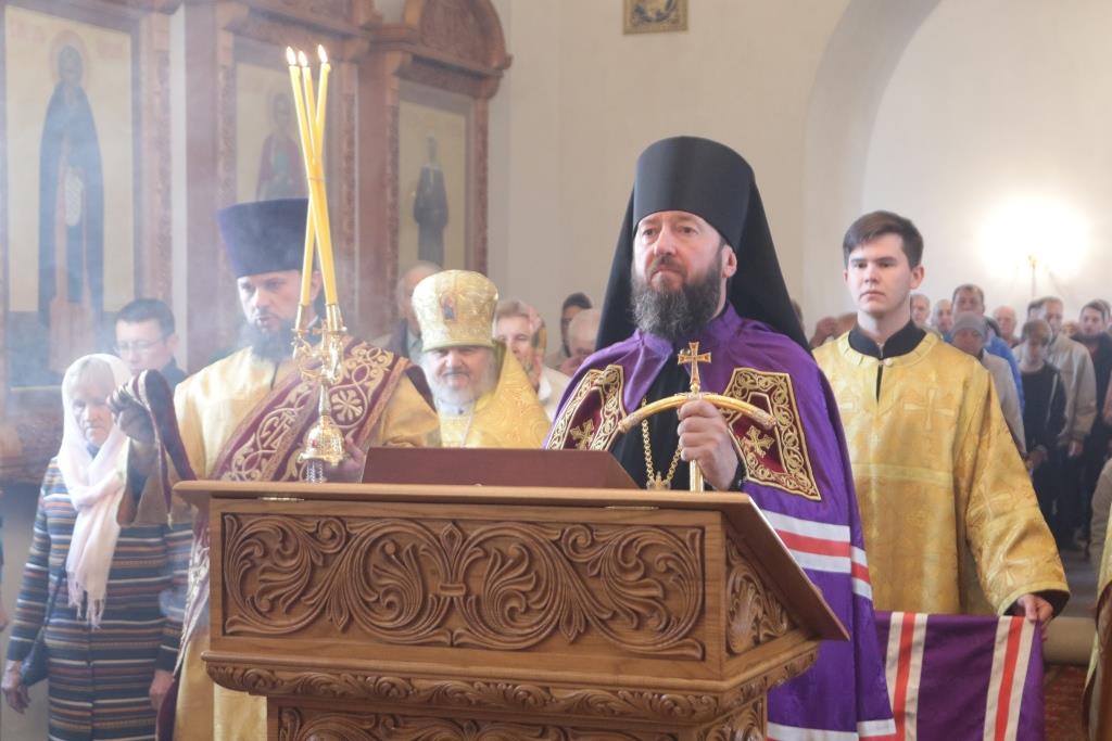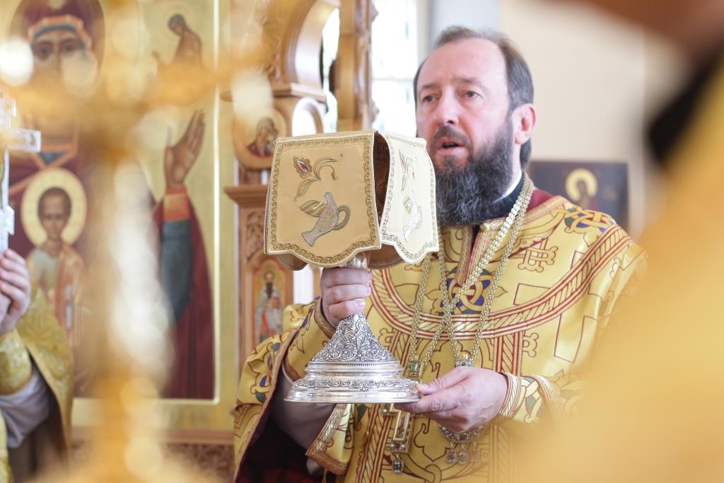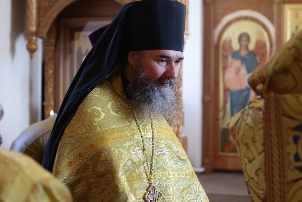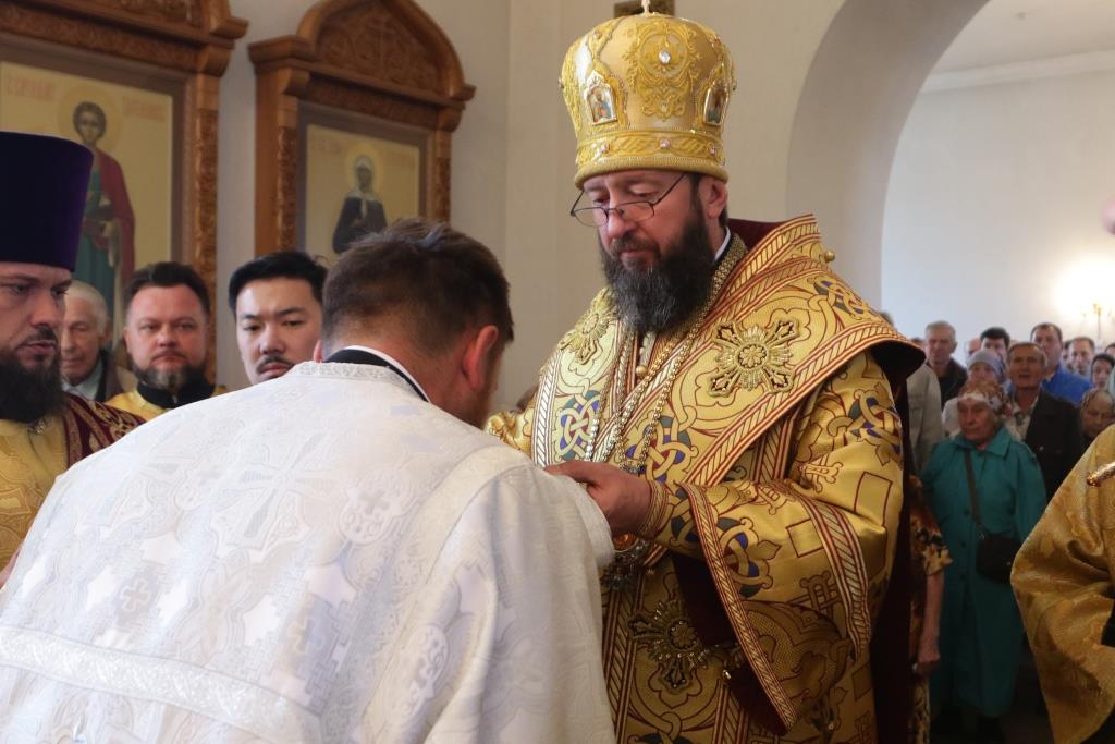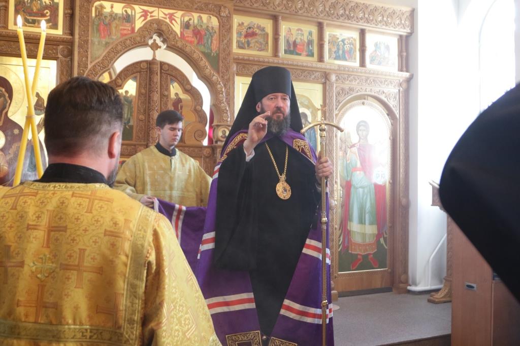 Его Преосвященству сослужили: духовник епархии архимандрит Спиридон (Теплухин), ключарь Андреевского кафедрального собора иеромонах Никодим (Авдеев), заведующий канцелярией епархии иерей Константин Дьяков, секретарь епархии диакон Илия Кван, протодиакон Андрей Дудник, диакон Владимир Лаврешин.