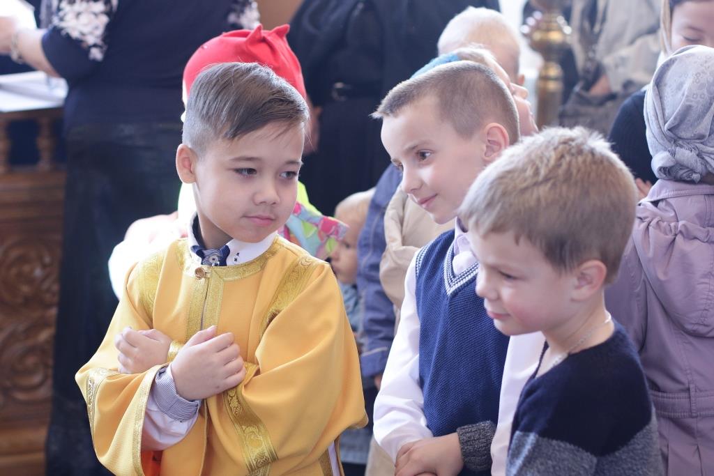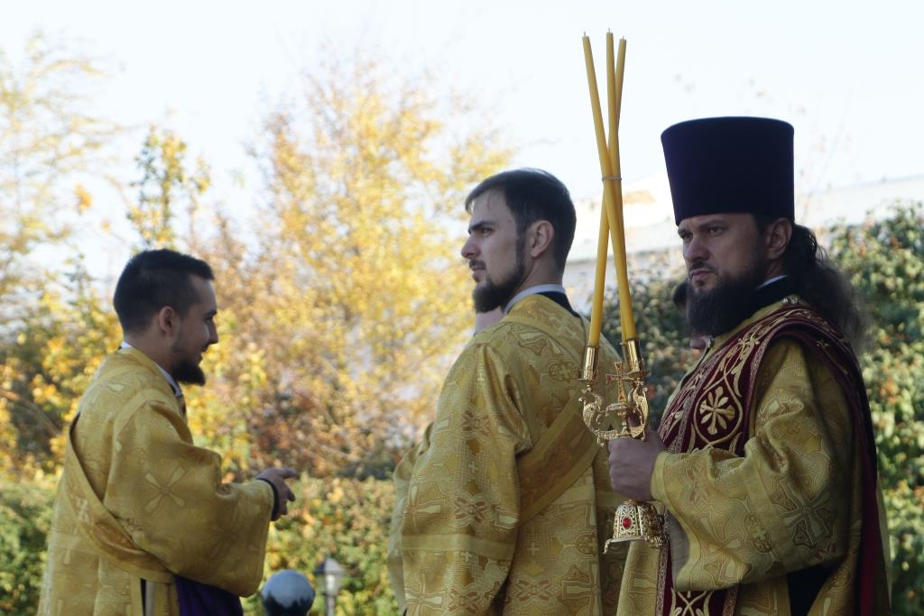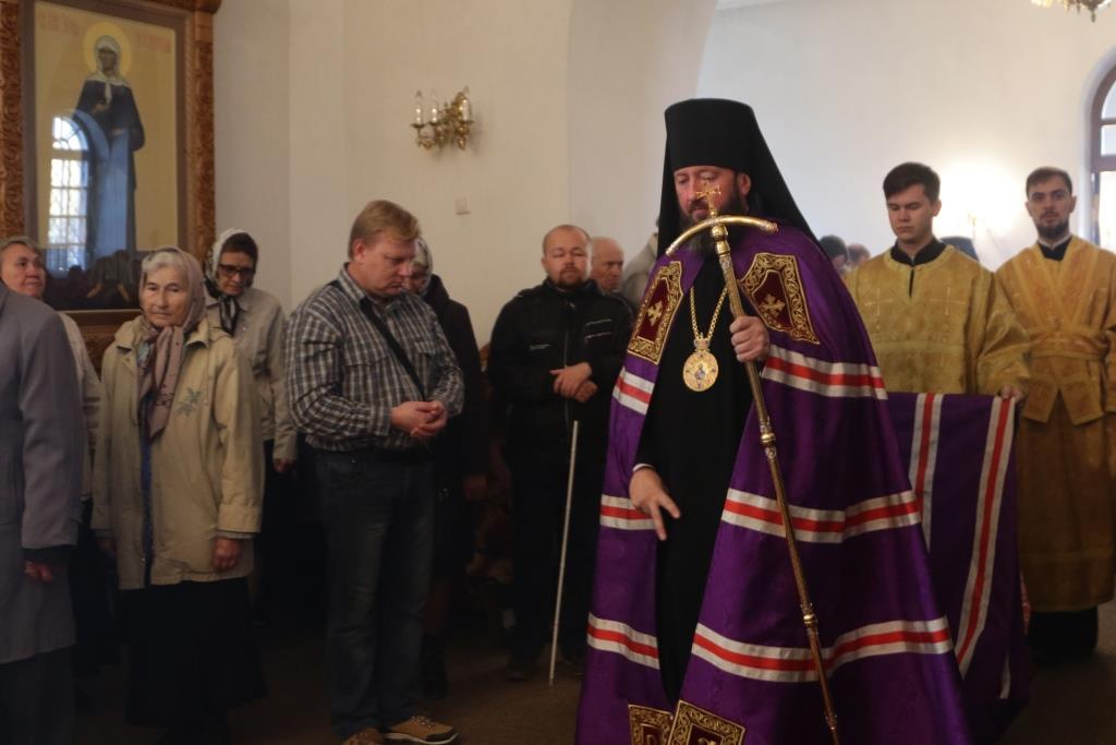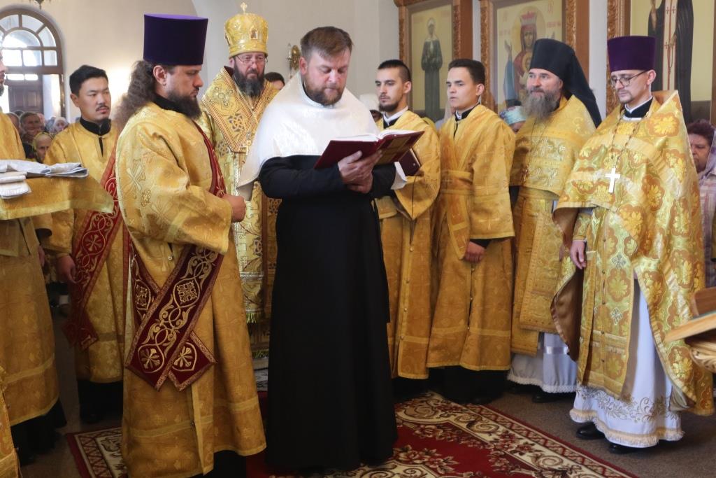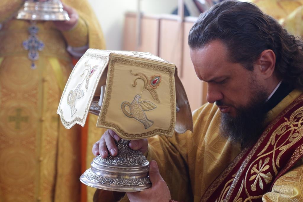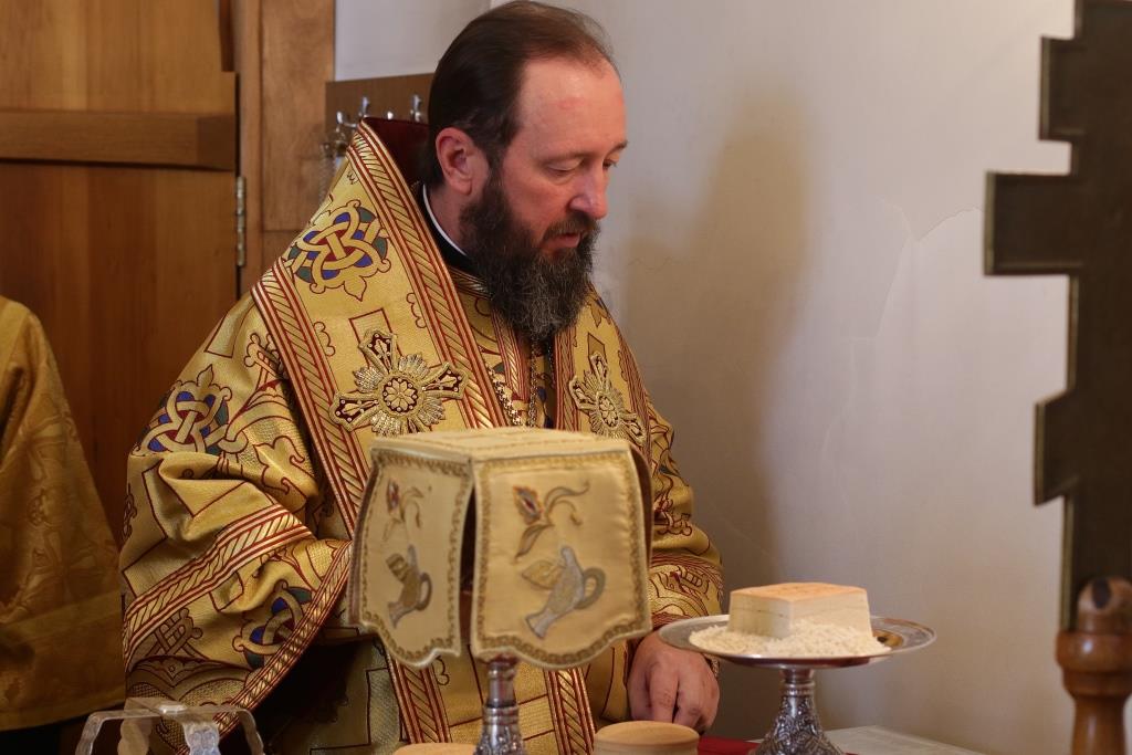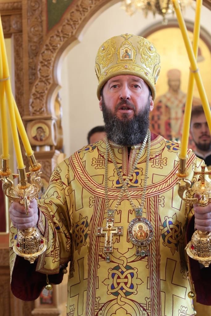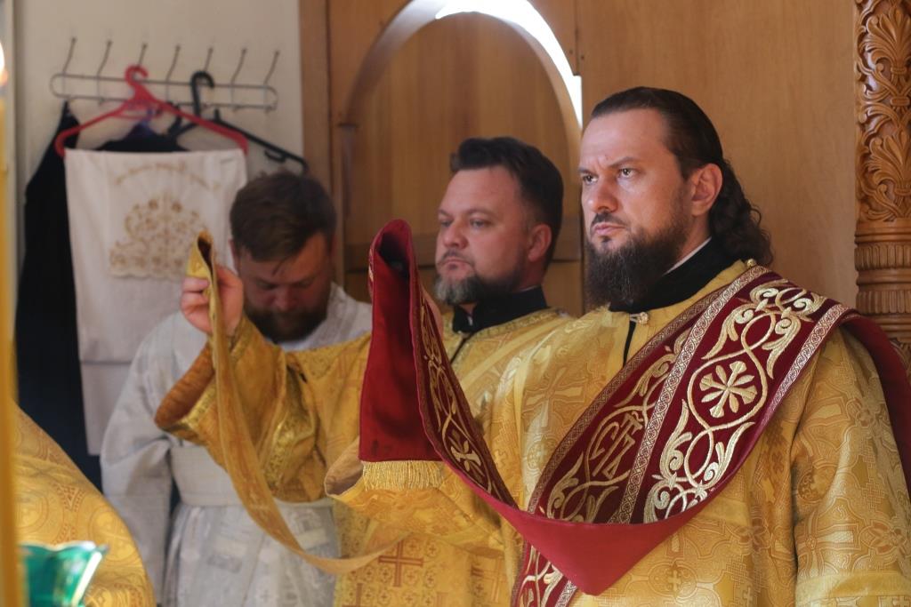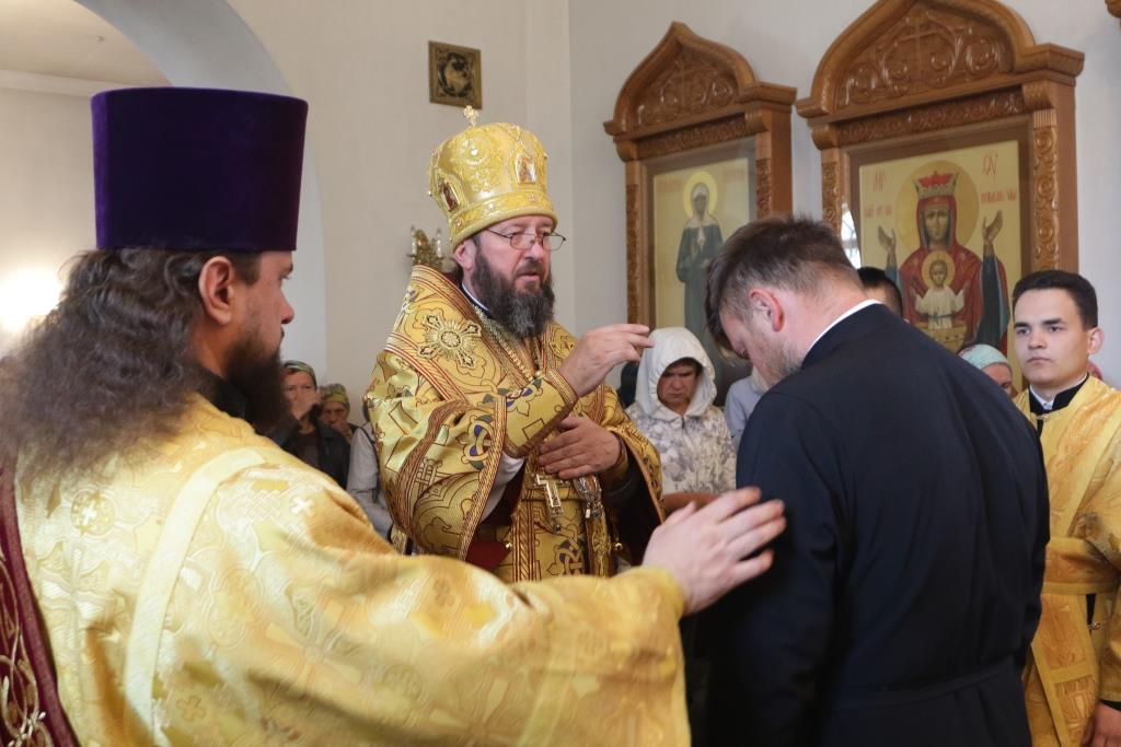 Его Преосвященству сослужили: духовник епархии архимандрит Спиридон (Теплухин), ключарь Андреевского кафедрального собора иеромонах Никодим (Авдеев), заведующий канцелярией епархии иерей Константин Дьяков, секретарь епархии диакон Илия Кван, протодиакон Андрей Дудник, диакон Владимир Лаврешин.