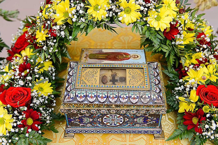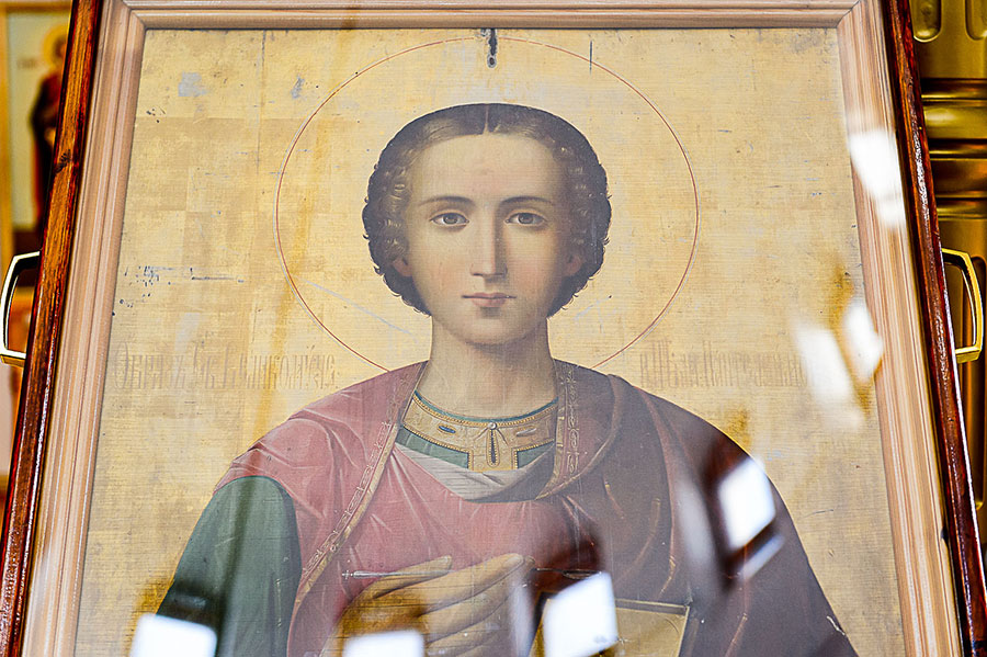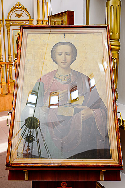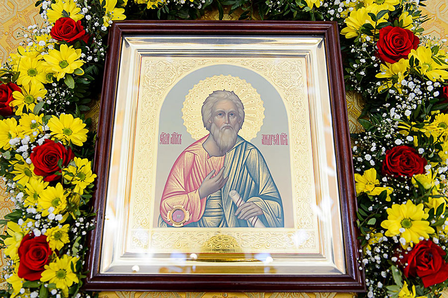 В центре храма на аналое находилась икона апостола Андрея Первозванного с частицей его святых мощей и ковчег с частью главы великомученика Пантелеимона, доставленный из Никольского собора Южной столицы.