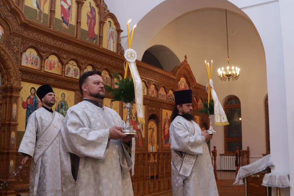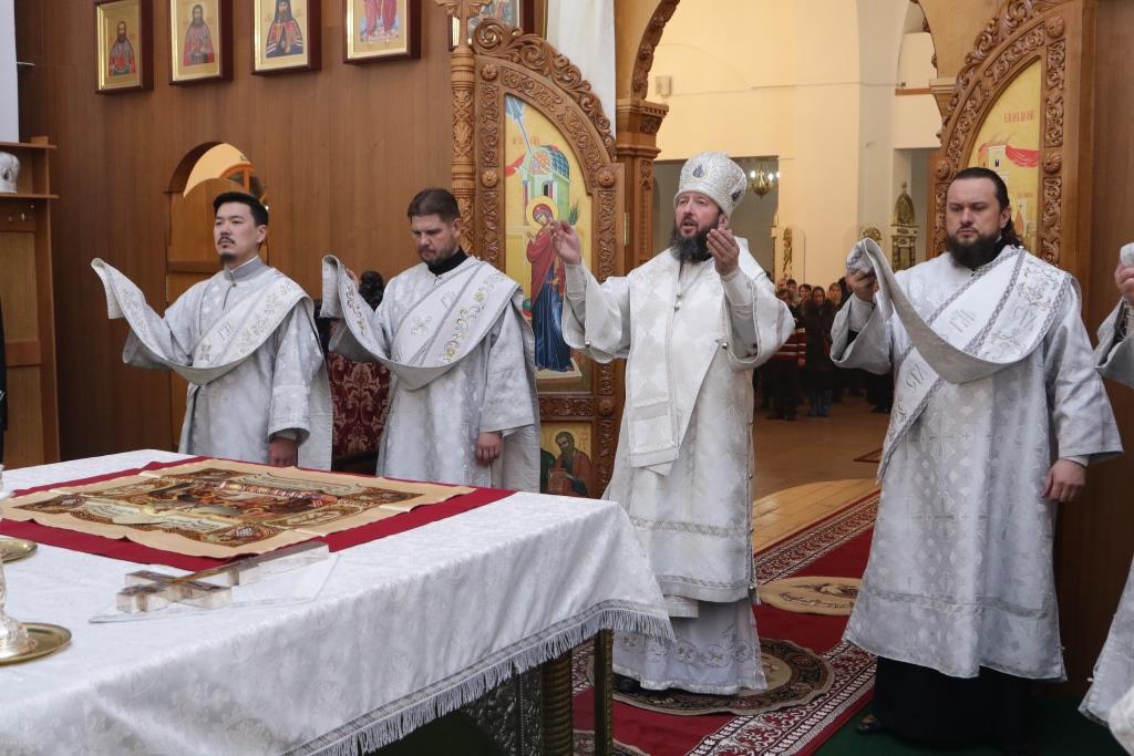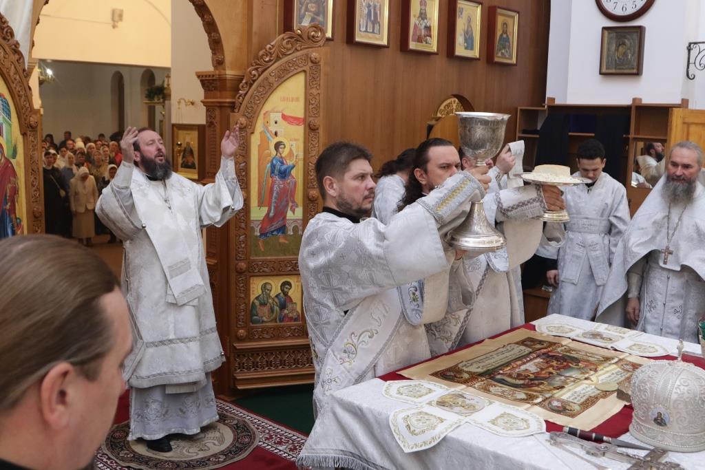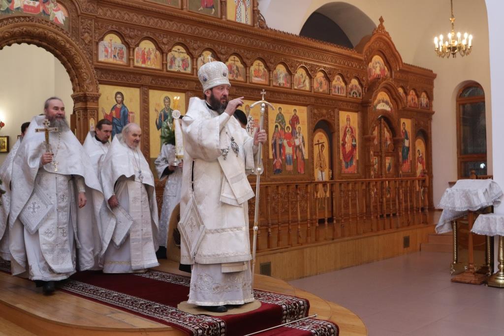 Владыке епископу сослужили духовник епархии архимандрит Спиридон (Теплухин), ключарь Андреевского собора иеромонах Никодим (Авдеев), клирик собора иерей Алексий Клепиков, секретарь Управляющего епархией иеромонах Силуан (Магилев), иеромонах Назарий (Шелыгин), секретарь епархии диакон Илия Кван, протодиакон Георгий Засыпкин, протодиакон Андрей Дудник, диакон Владимир Лаврешин.