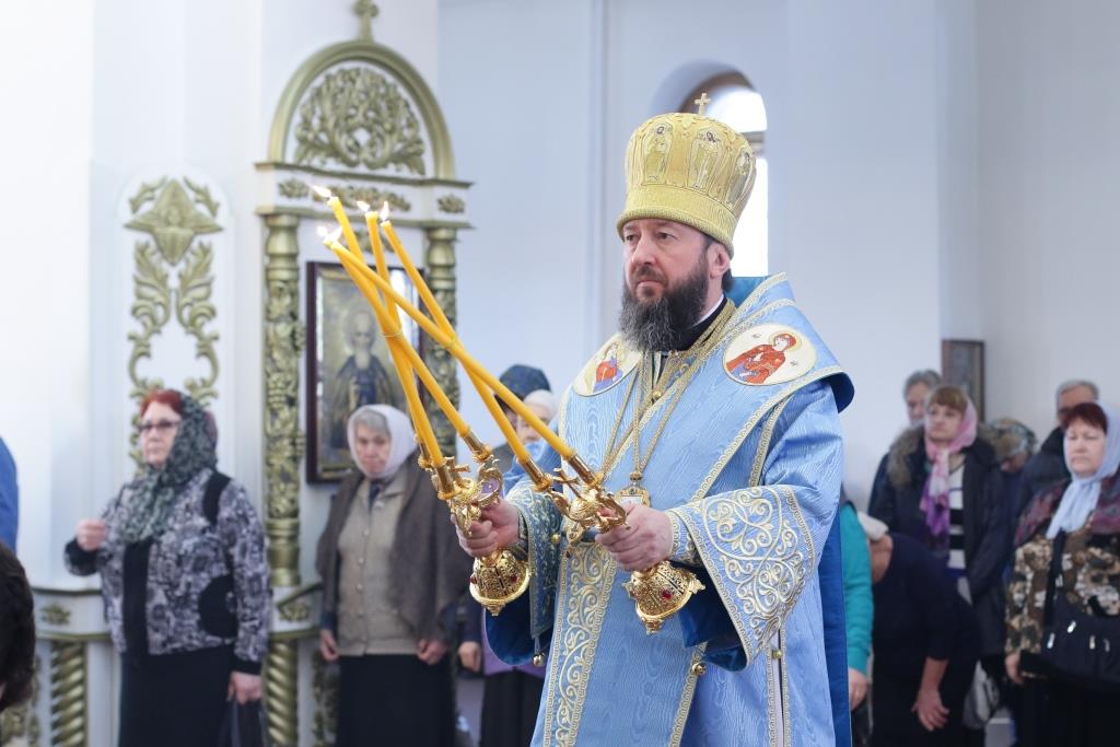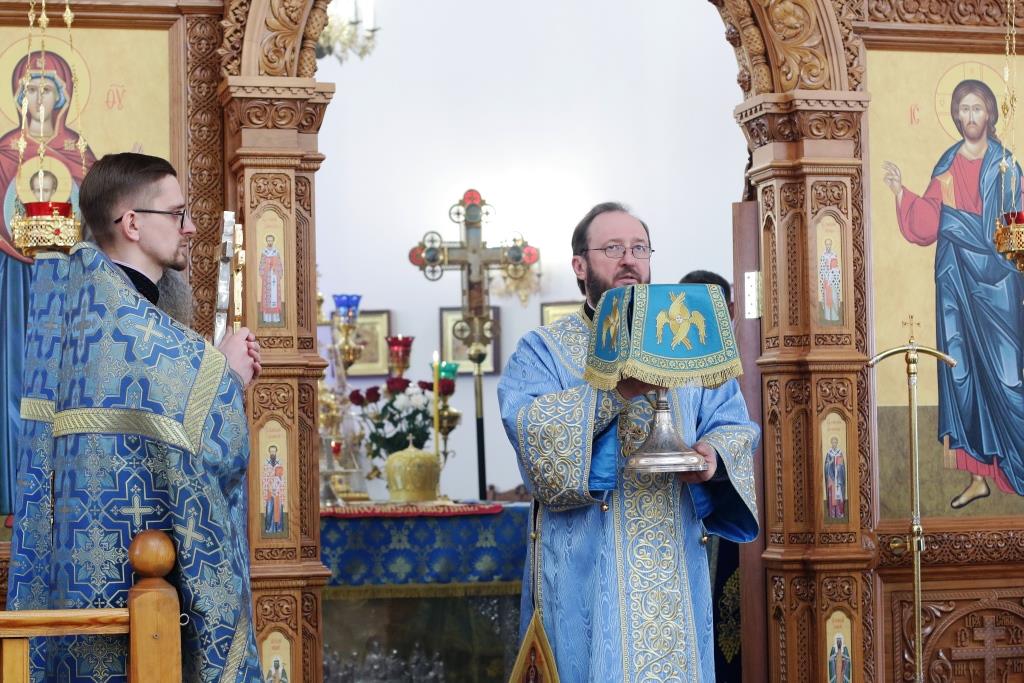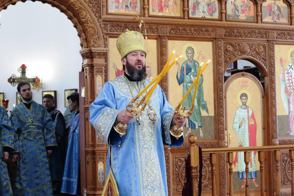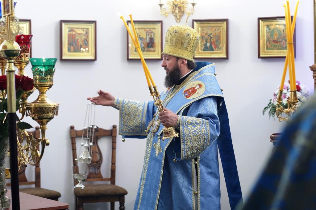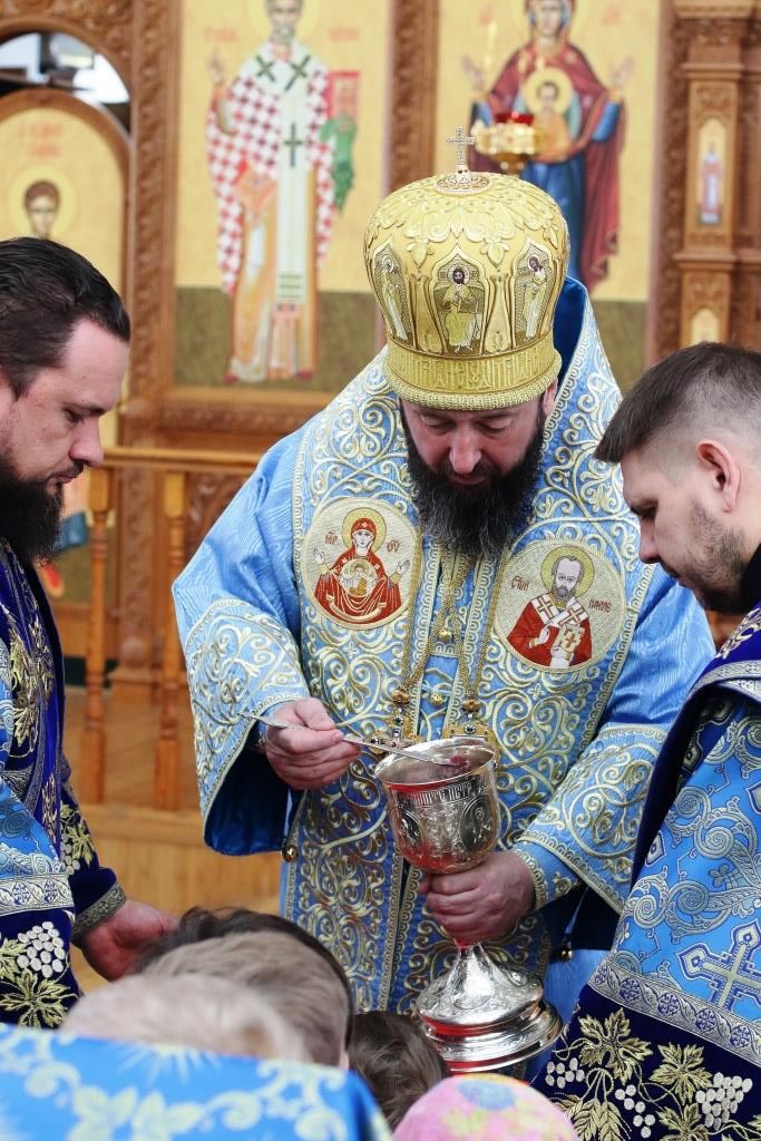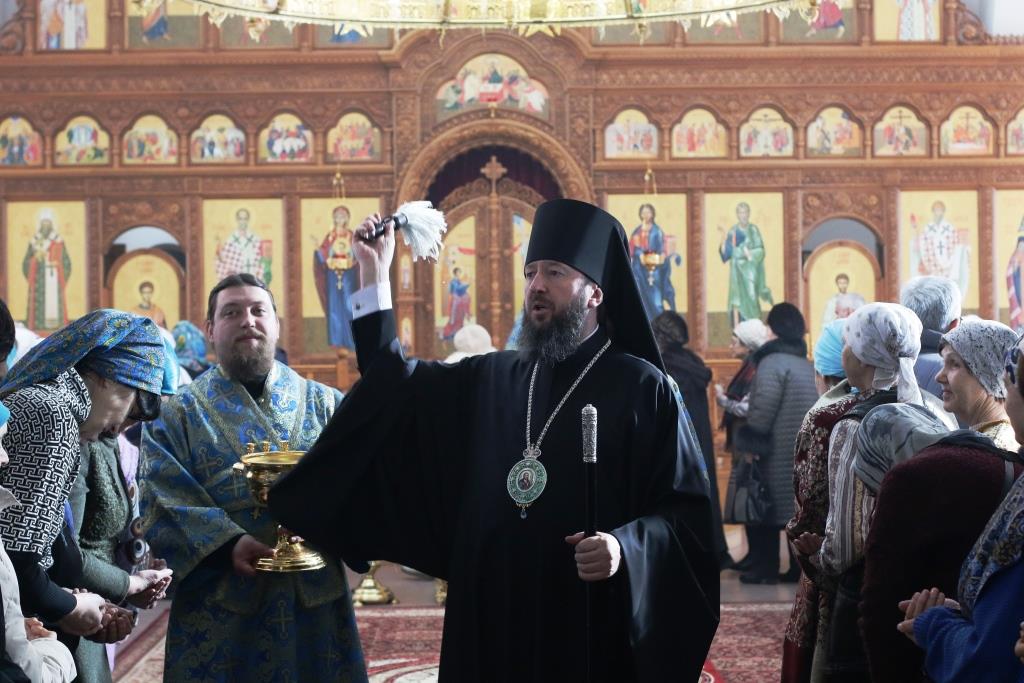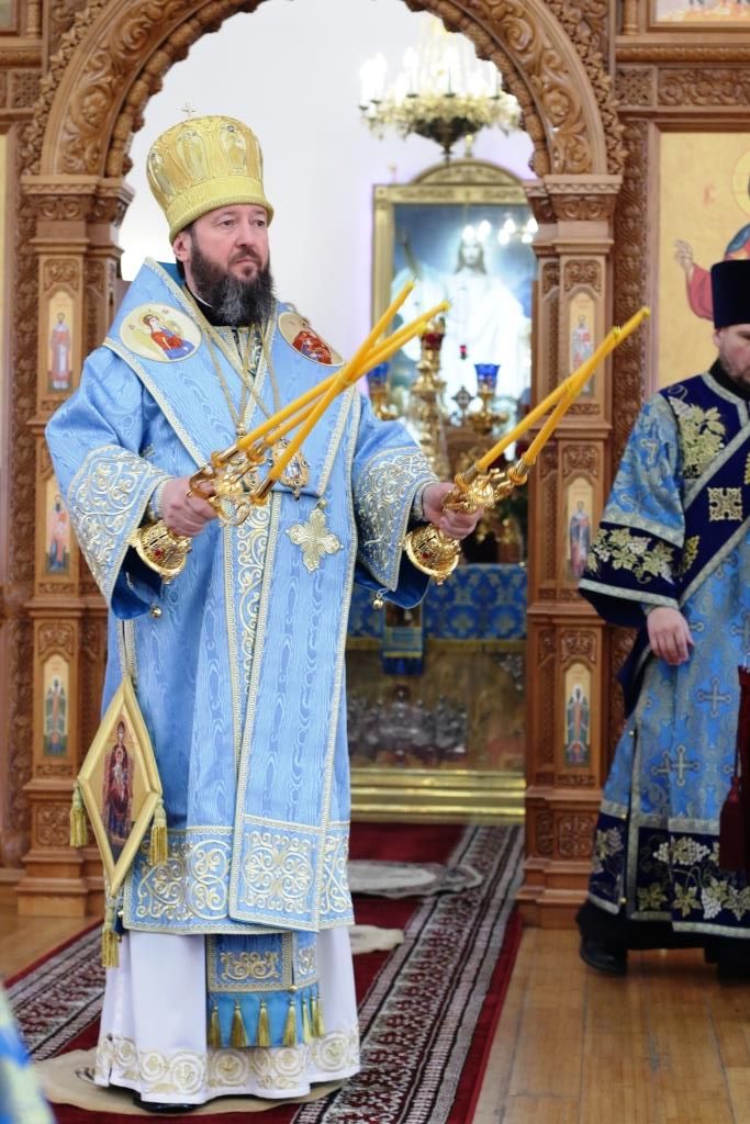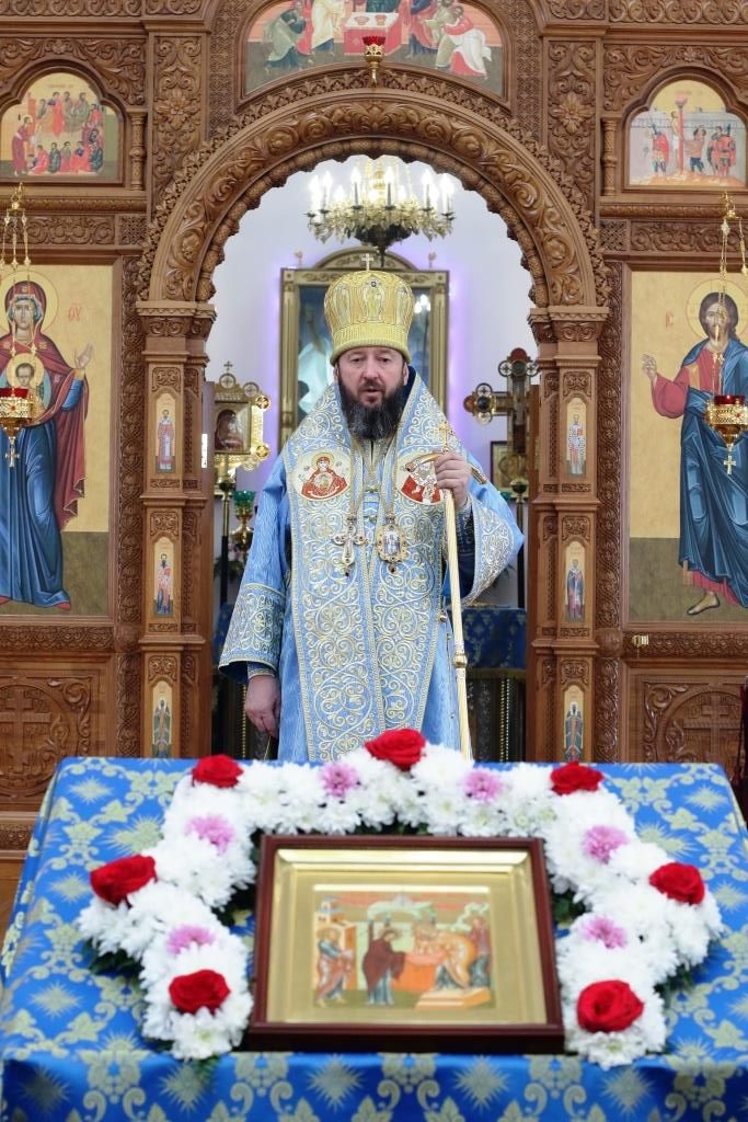 После заамвонной молитвы было совершено славление Господу Иисусу и Его Пречистой Матери со всенародным пением «Царице моя Предлагая». В завершение праздничной Литургии Владыка епископ поздравил духовенство и мирян с праздником и обратился к народу Божию со словами наставления.
