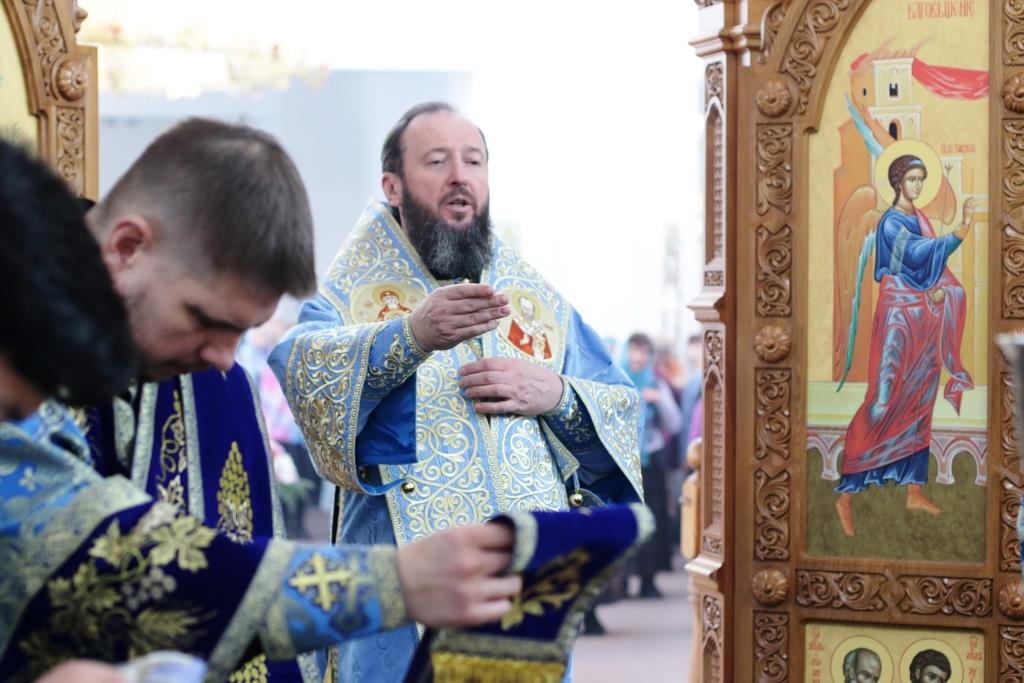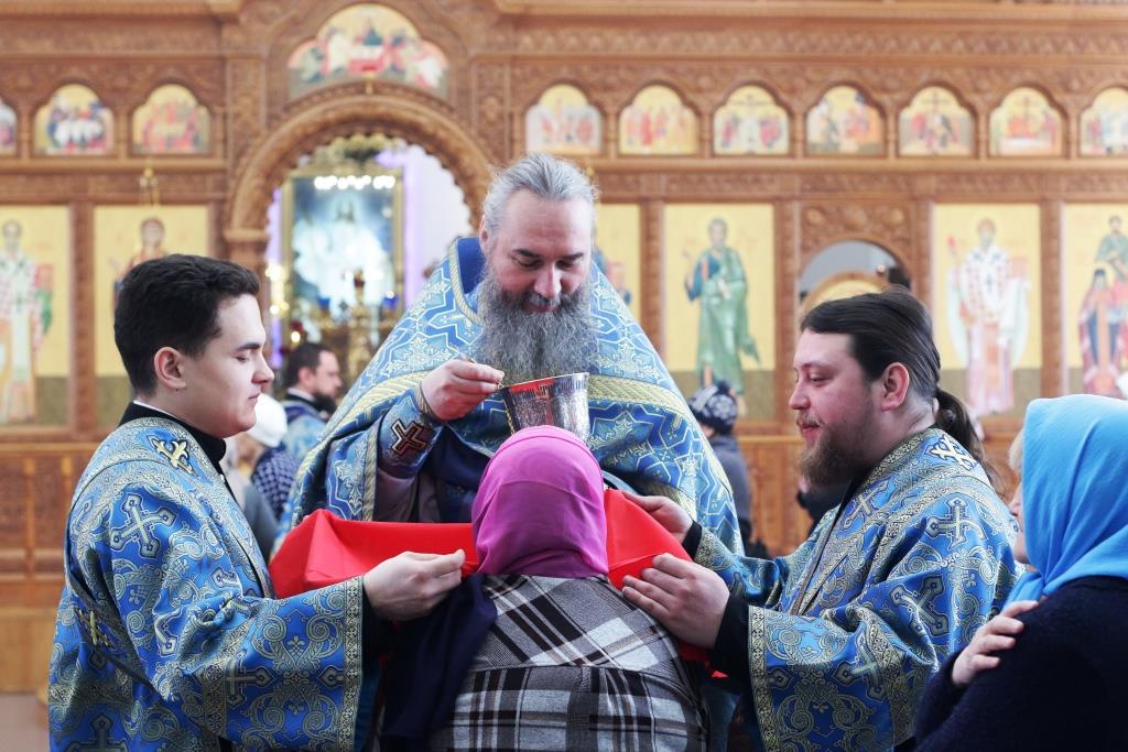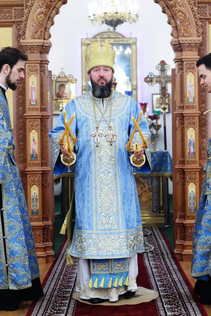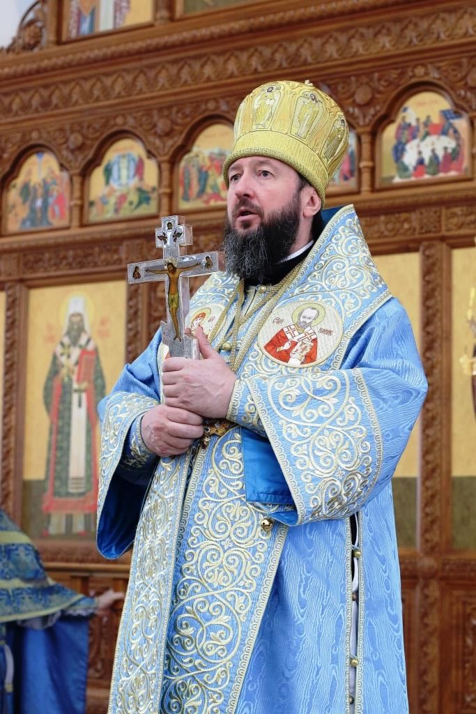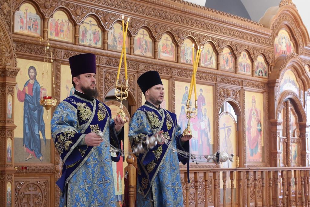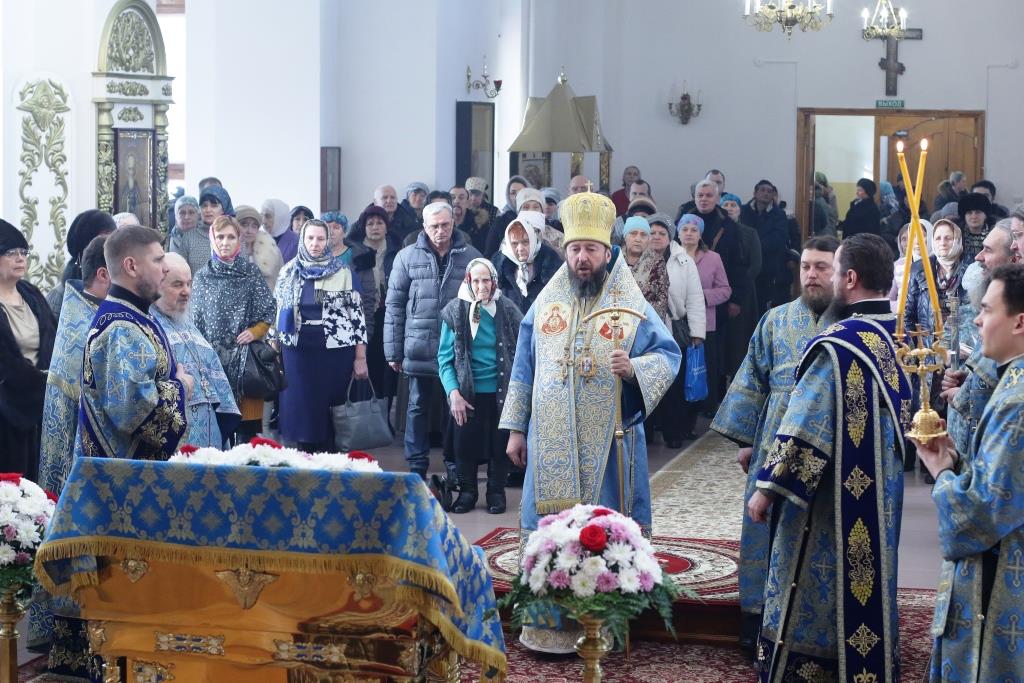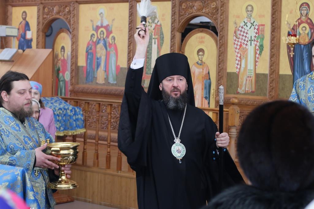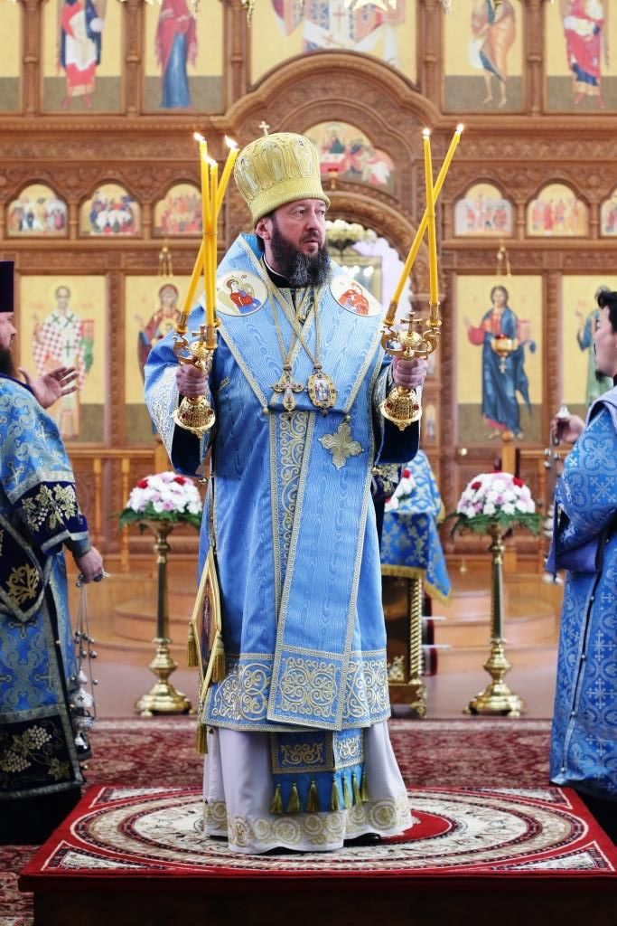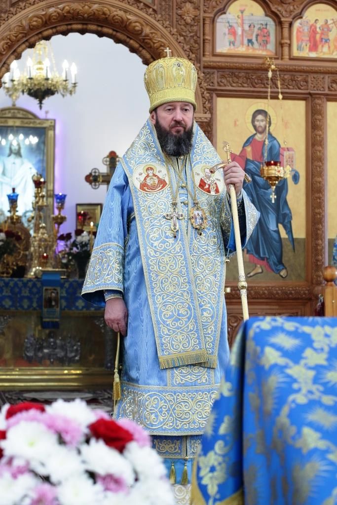 После заамвонной молитвы было совершено славление Господу Иисусу и Его Пречистой Матери со всенародным пением «Царице моя Предлагая». В завершение праздничной Литургии Владыка епископ поздравил духовенство и мирян с праздником и обратился к народу Божию со словами наставления.