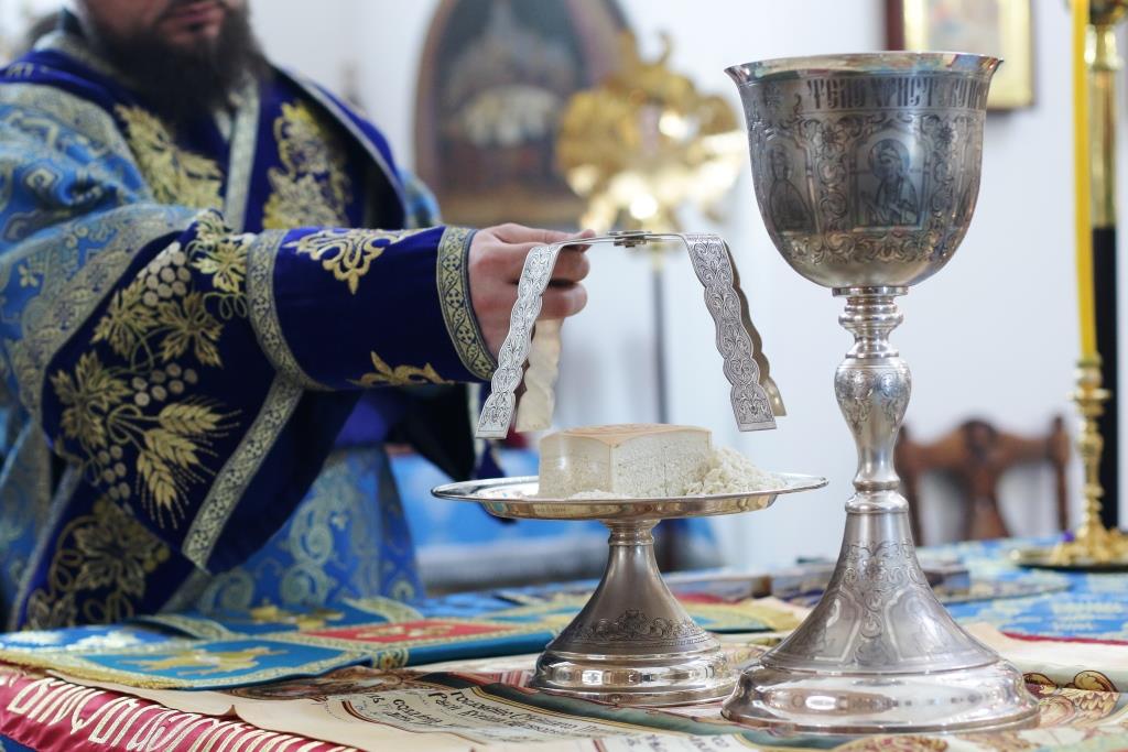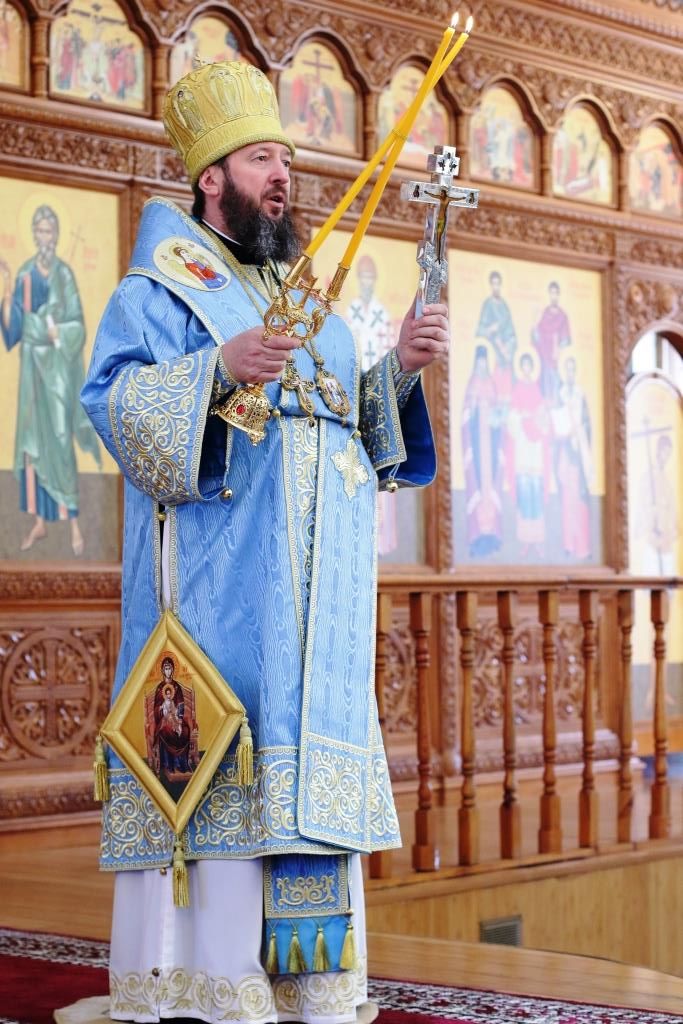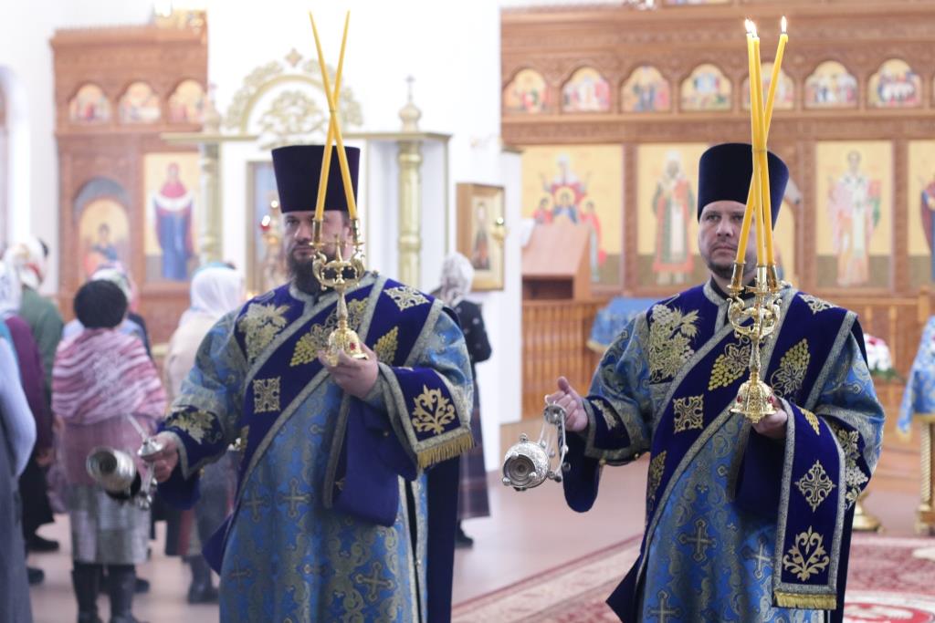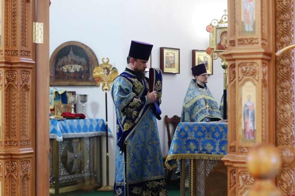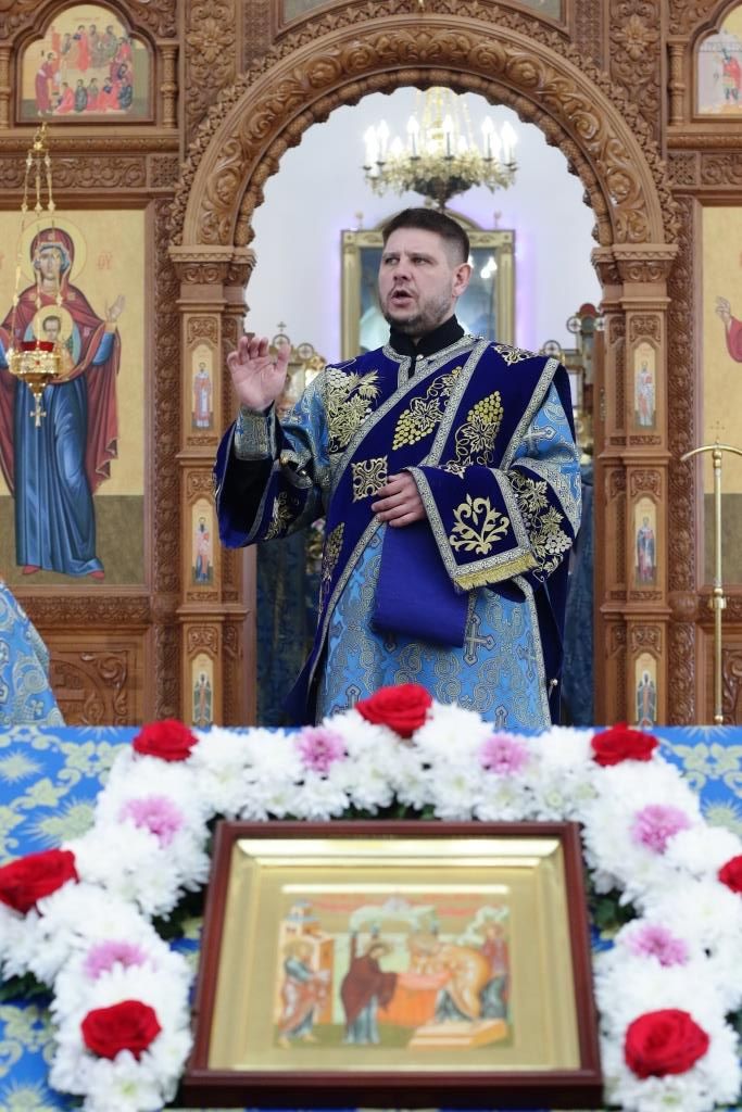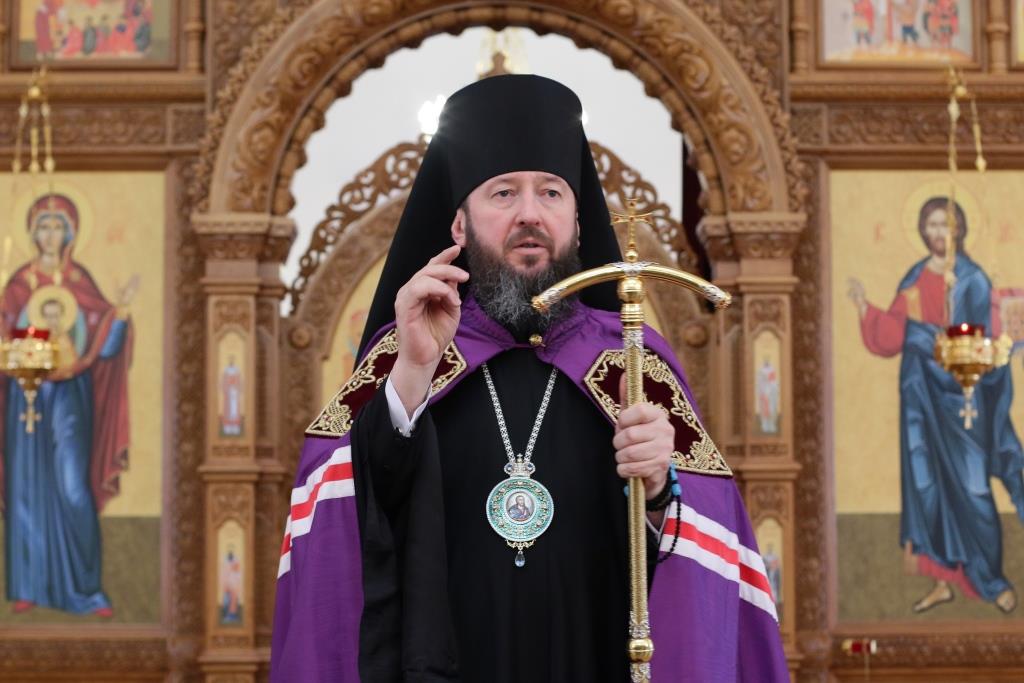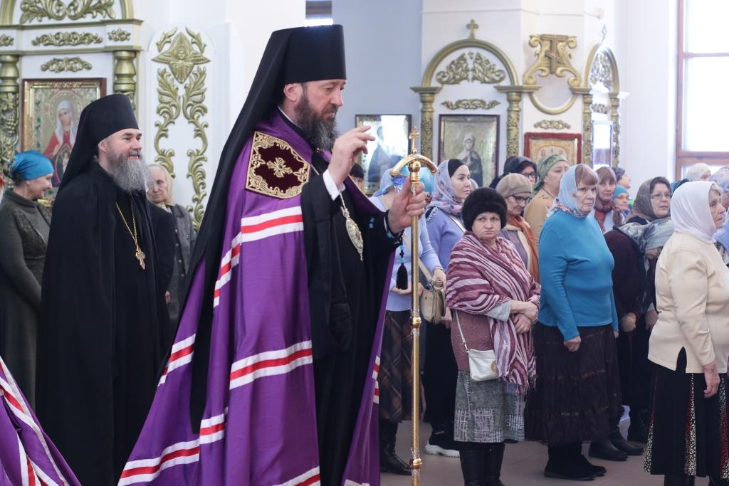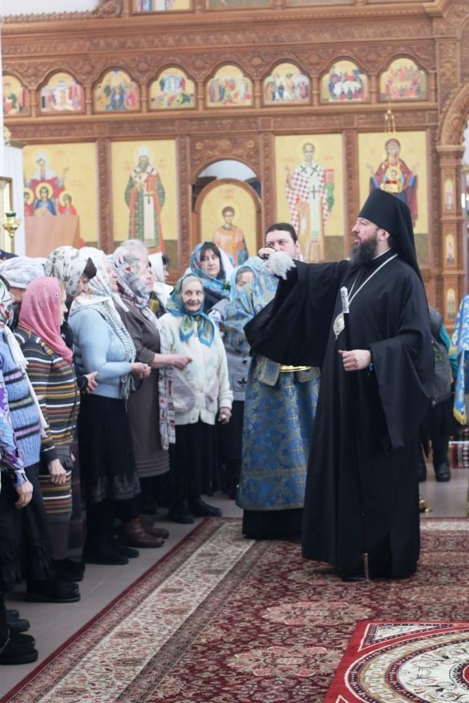 После заамвонной молитвы было совершено славление Господу Иисусу и Его Пречистой Матери со всенародным пением «Царице моя Предлагая». В завершение праздничной Литургии Владыка епископ поздравил духовенство и мирян с праздником и обратился к народу Божию со словами наставления.