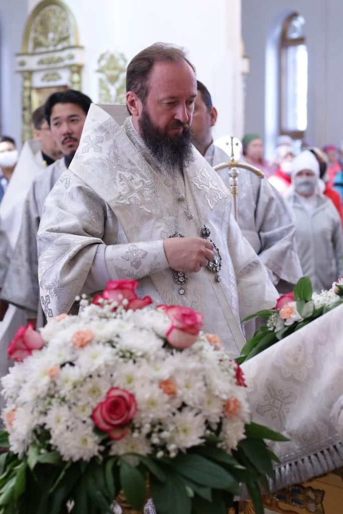 В праздничный день Преосвященнейший епископ Усть-Каменогорский и Семипалатинский Амфилохий возглавил служение Божественной Литургии святителя Иоанна Златоуста в Свято-Андреевском кафедральном соборе Усть-Каменогорска. Владыке епископу сослужили: духовник епархии архимандрит Спиридон (Теплухин), клирики собора иерей Алексий Клепиков, иеромонах Силуан (Магилев), иерей Роман Подрезов, секретарь епархии диакон Илия Кван, протодиаконы Георгий Засыпкин и Андрей Дудник, диакон Владимир Лаврешин.