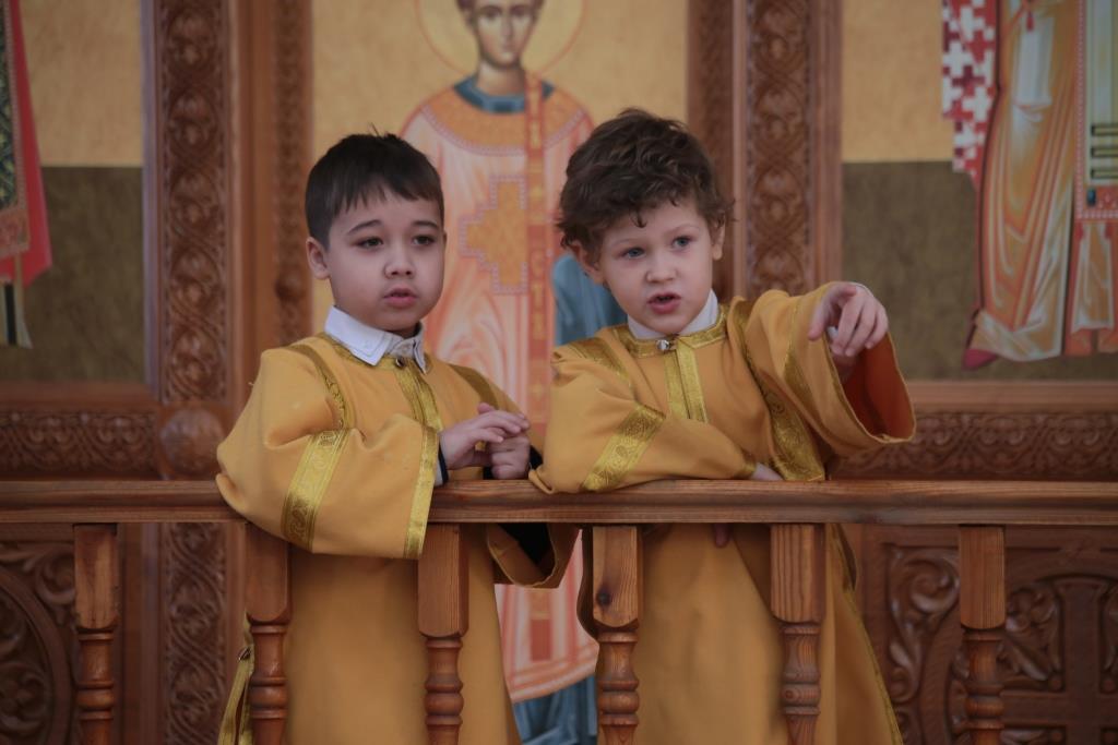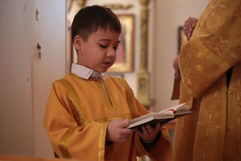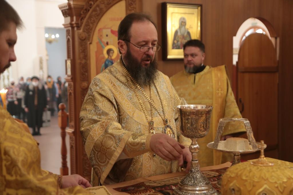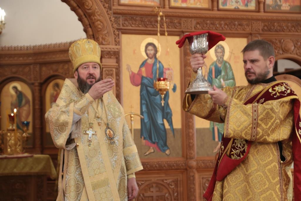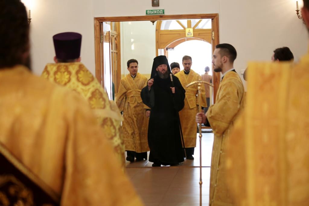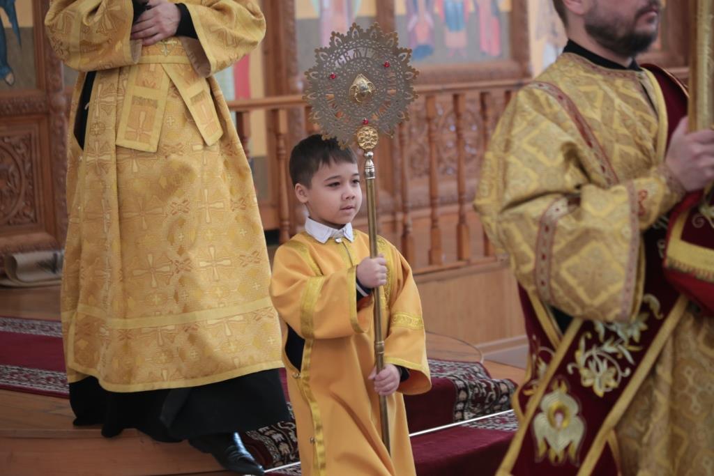 Песнопения воскресной Литургии исполнял хор под управлением регента Н. Романцовой. За богослужением молились сотрудники епархиального управления, насельники Свято-Троицкого мужского монастыря города Усть-каменогорска и прихожане кафедрального собора. Перед причастием мирян проповедовал священник Константин Дьяков.