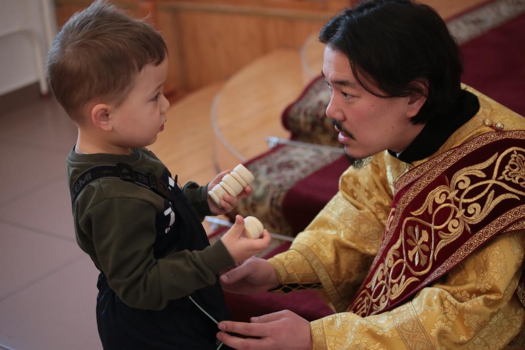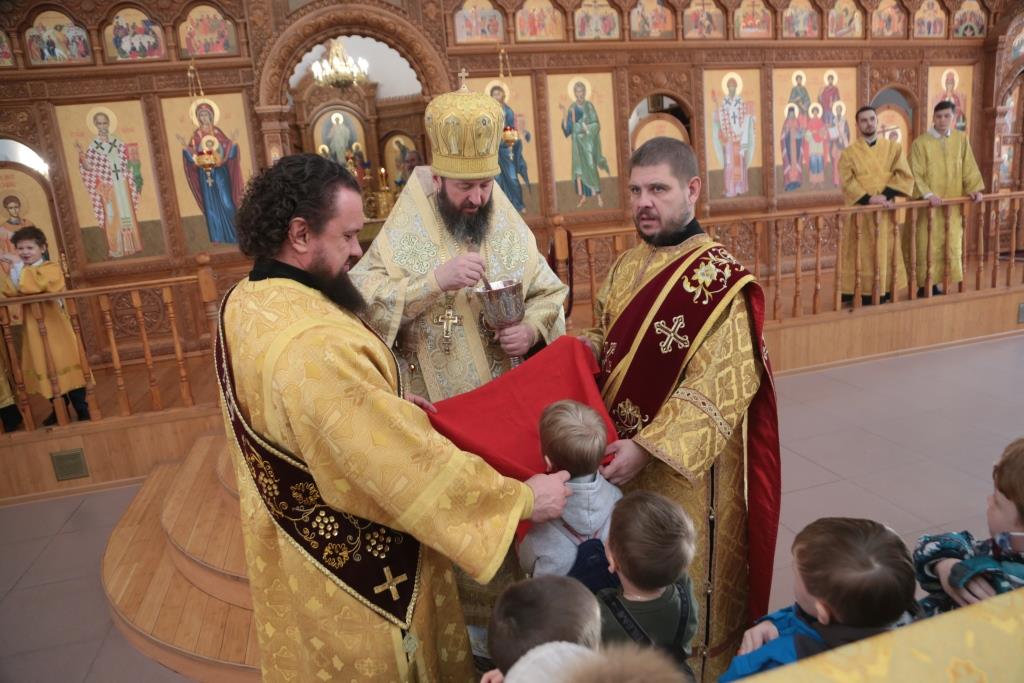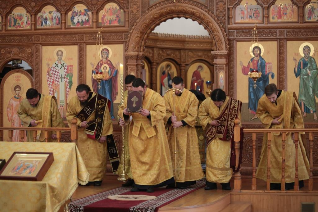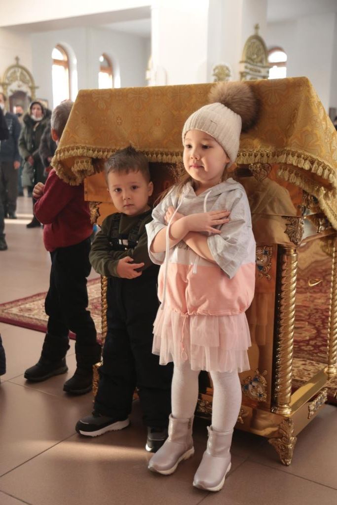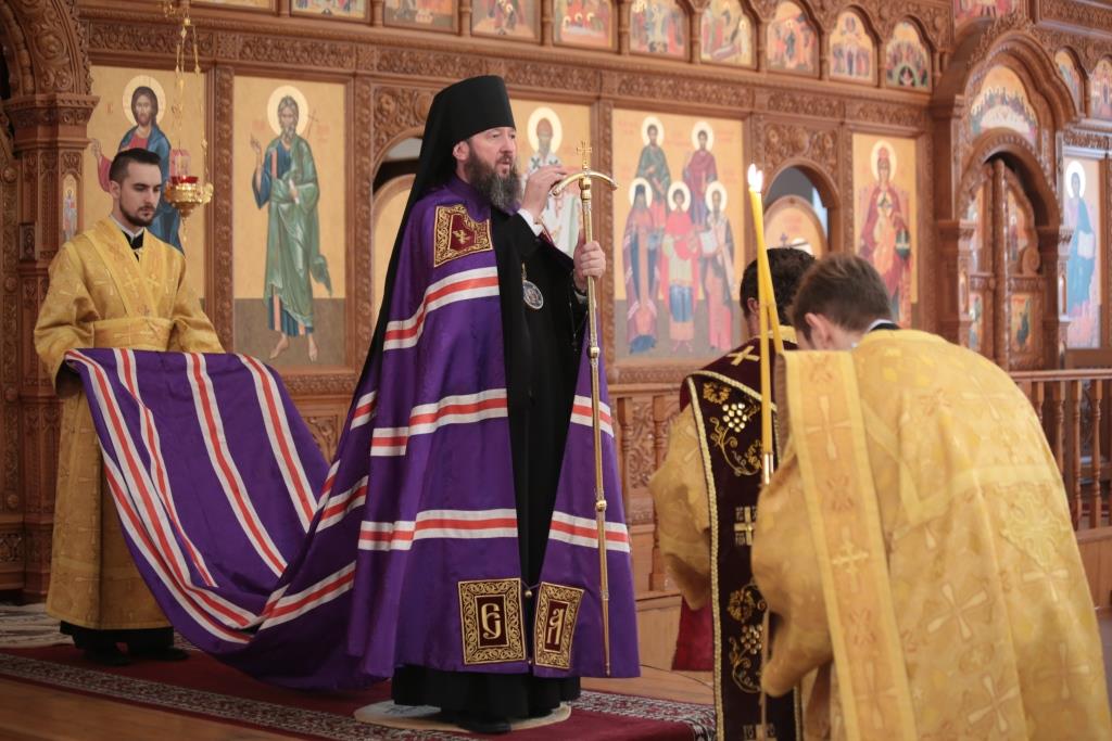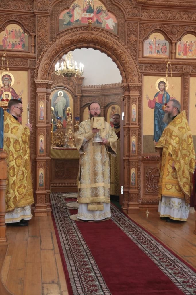 Песнопения воскресной Литургии исполнял хор под управлением регента Н. Романцовой. За богослужением молились сотрудники епархиального управления, насельники Свято-Троицкого мужского монастыря города Усть-каменогорска и прихожане кафедрального собора. Перед причастием мирян проповедовал священник Константин Дьяков.