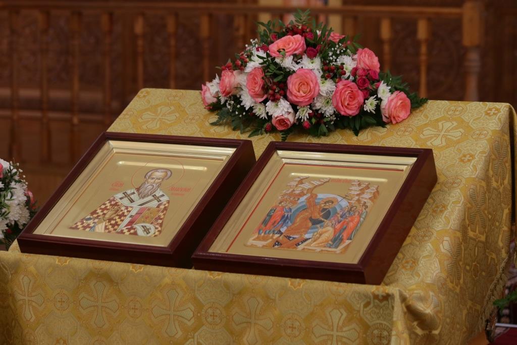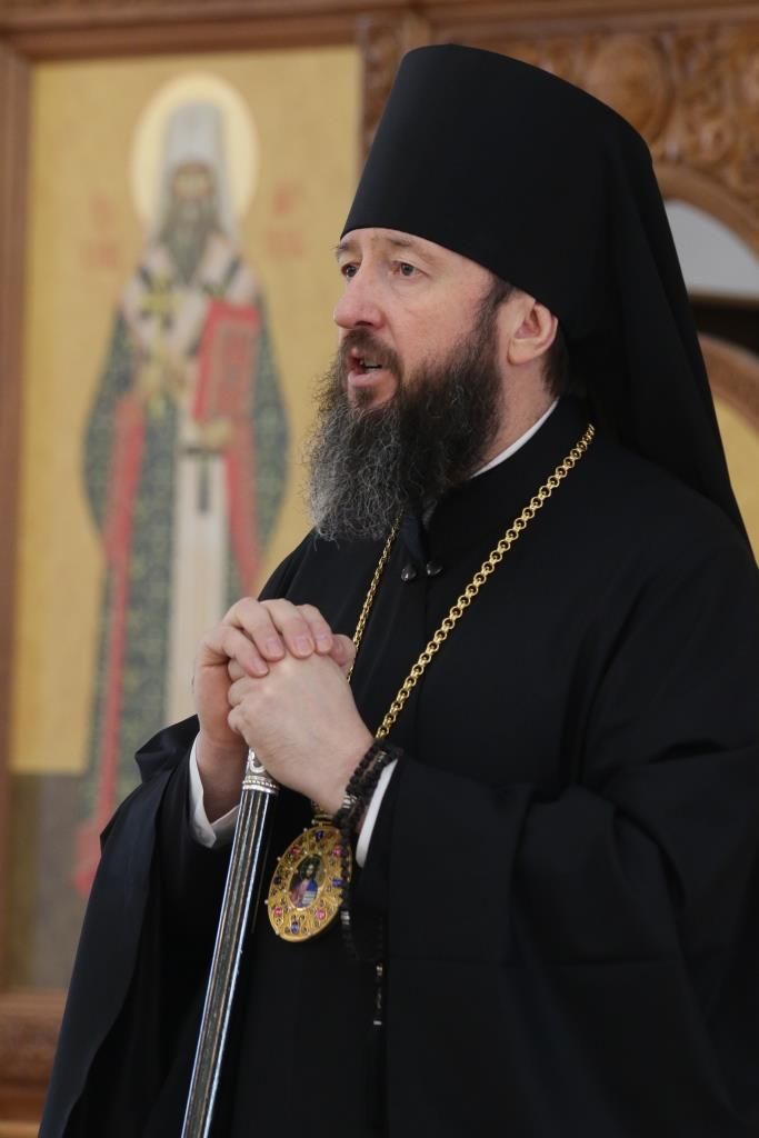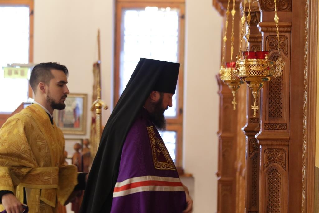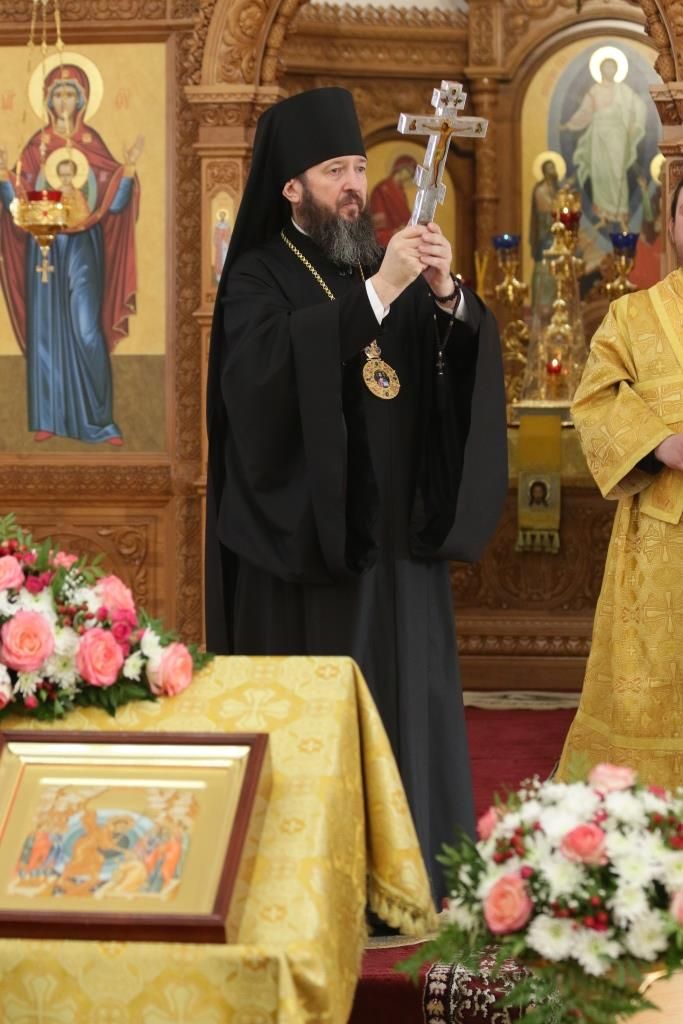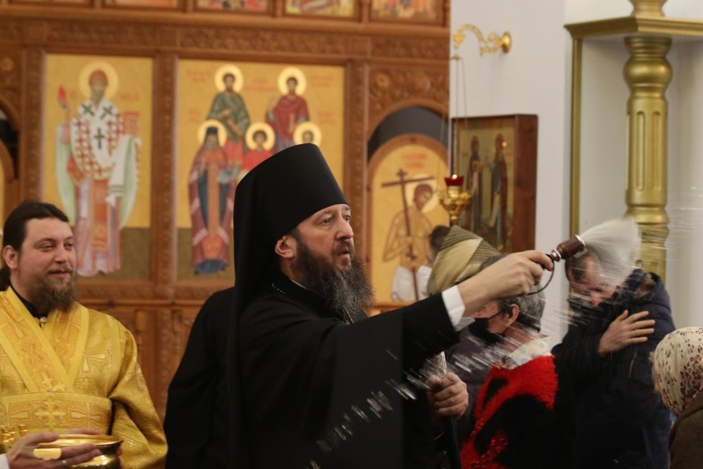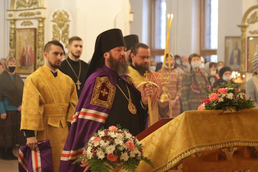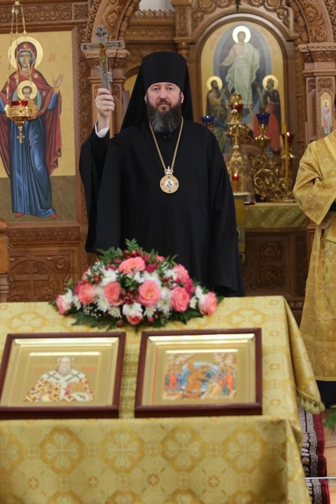 После завершения Литургии было совершено славление святителю Амфилохию, епископу Иконийскому пред частицей его святых мощей, затем Преосвященнейший Владыка поздравил молящихся с праздником и обратился к прихожанам со словами проповеди.