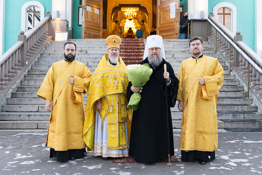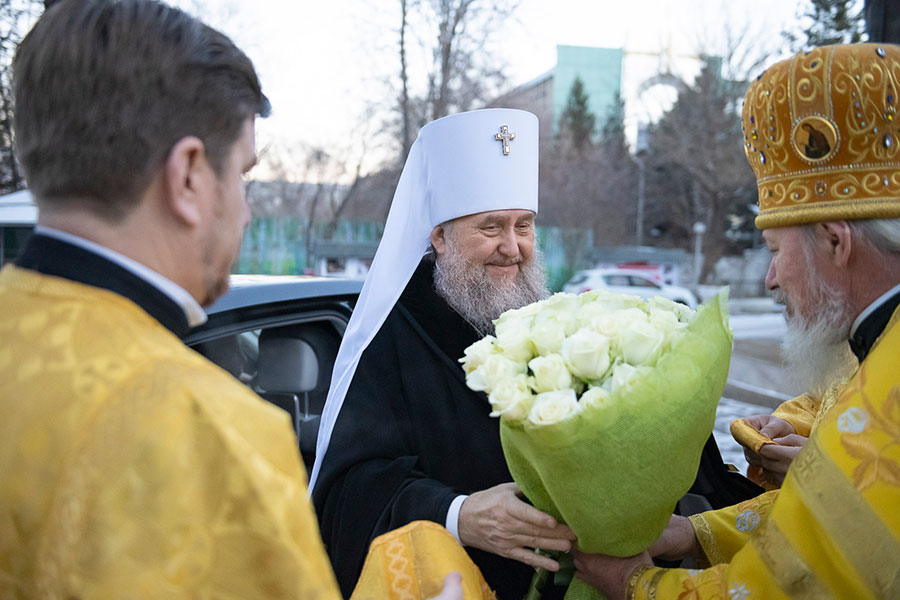 Его Высокопреосвященству сослужили: викарий Астанайской епархии, епископ Талдыкорганский Нектарий, епископ Усть-Каменогорский и Семипалатинский Амфилохий; благочинный приходов Алма-Аты, настоятель Никольского собора протоиерей Валерий Захаров; настоятель храма в честь иконы Божией Матери «Всех скорбящих Радость» протоиерей Евгений Воробьев; игумен Феодосий (Белобородов); руководитель отдела Казахстанского Митрополичьего округа по связям с общественностью, ключарь Вознесенского кафедрального собора протоиерей Александр Суворов; протоиерей Владимир Волков; ключарь Петропавловского храма протоиерей Кирилл Шкляр; руководитель комиссии Митрополичьего округа по благотворительности и социальному служению протоиерей Вячеслав Пугачев; референт Алма-Атинского епархиального управления иеромонах Алексий (Черевцов); секретарь комиссии Митрополичьего округа по канонизации святых иеромонах Иаков (Воронцов); проректор по воспитательной работе Алма-Атинской духовной семинарии иерей Иоанн Ливинский; руководитель личного секретариата митрополита иеромонах Прохор (Ендовицкий); руководитель административного секретариата Главы Митрополичьего округа иерей Георгий Сидоров; протодиакон Николай Гринкевич, руководитель службы протокола митрополита протодиакон Роман Головин; протодиакон Владимир Сыровацкий, диакон Димитрий Савченко, диакон Алексей Канушин, иеродиакон Афанасий (Козел), диакон Иоанн Чуркин.