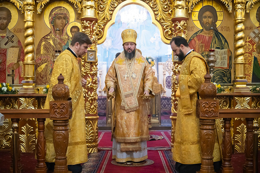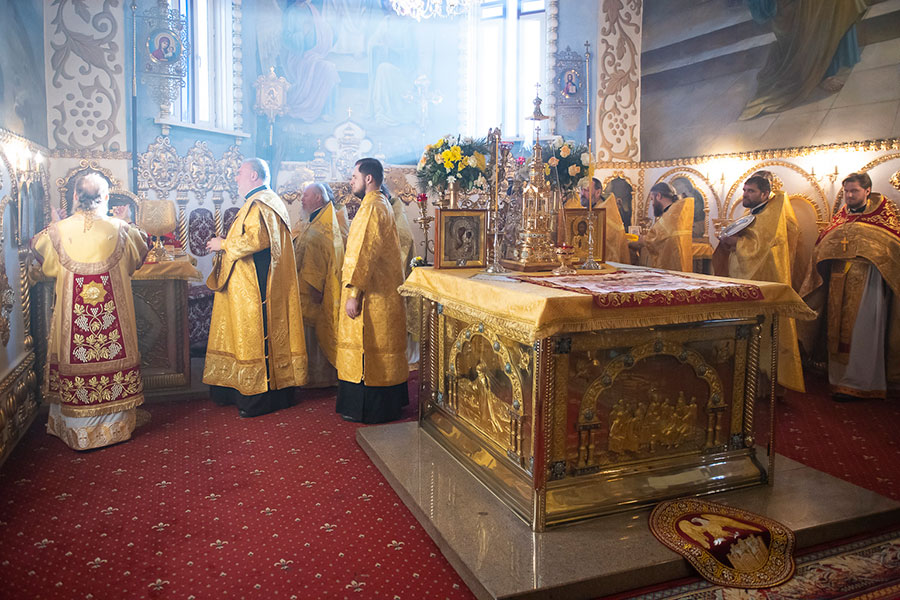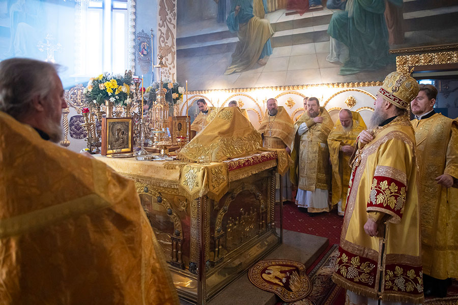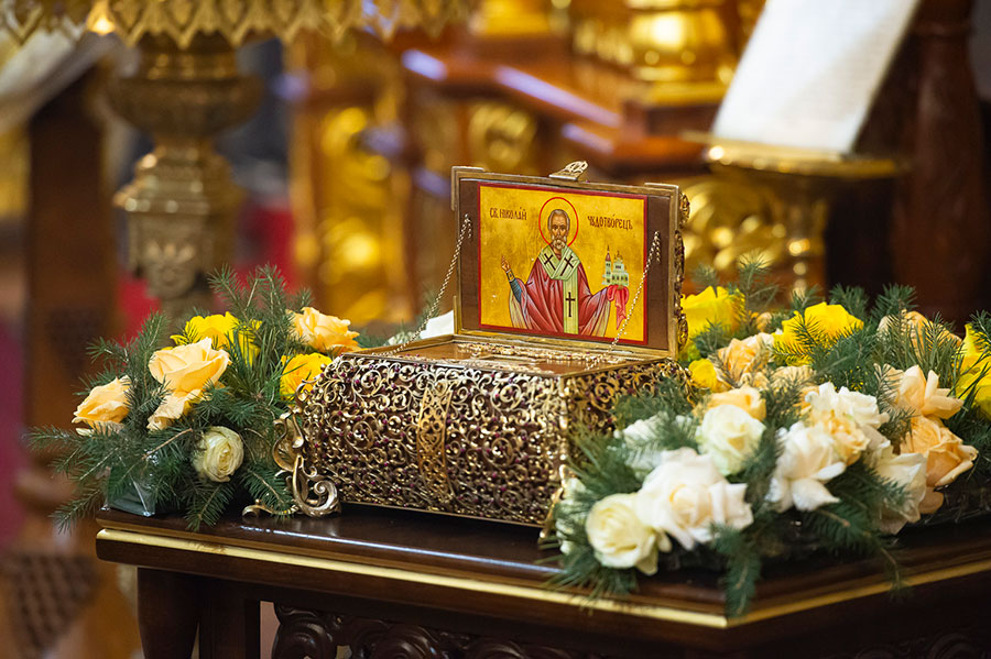 Перед началом Литургии ковчег с мощами святителя и чудотворца Николая, хранящийся в алтаре собора, был изнесен для молитвенного поклонения верующим. Часть мощей Мирликийского святителя – дар Никольскому храму от митрополита Астанайского и Казахстанского Александра. Все участники богослужения получили возможность поклониться этой великой святыне.
