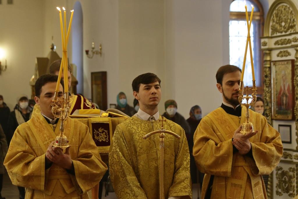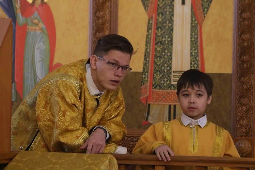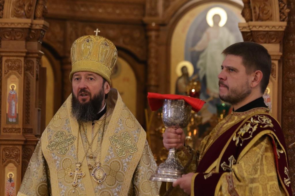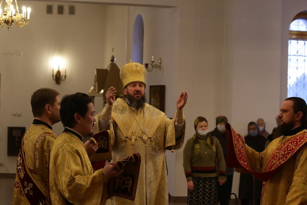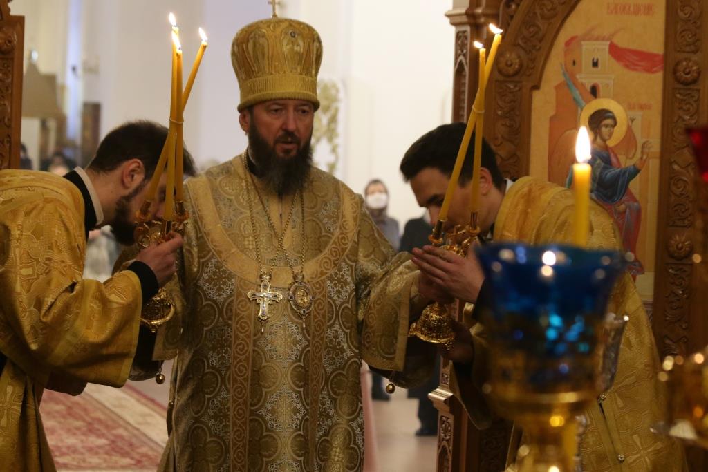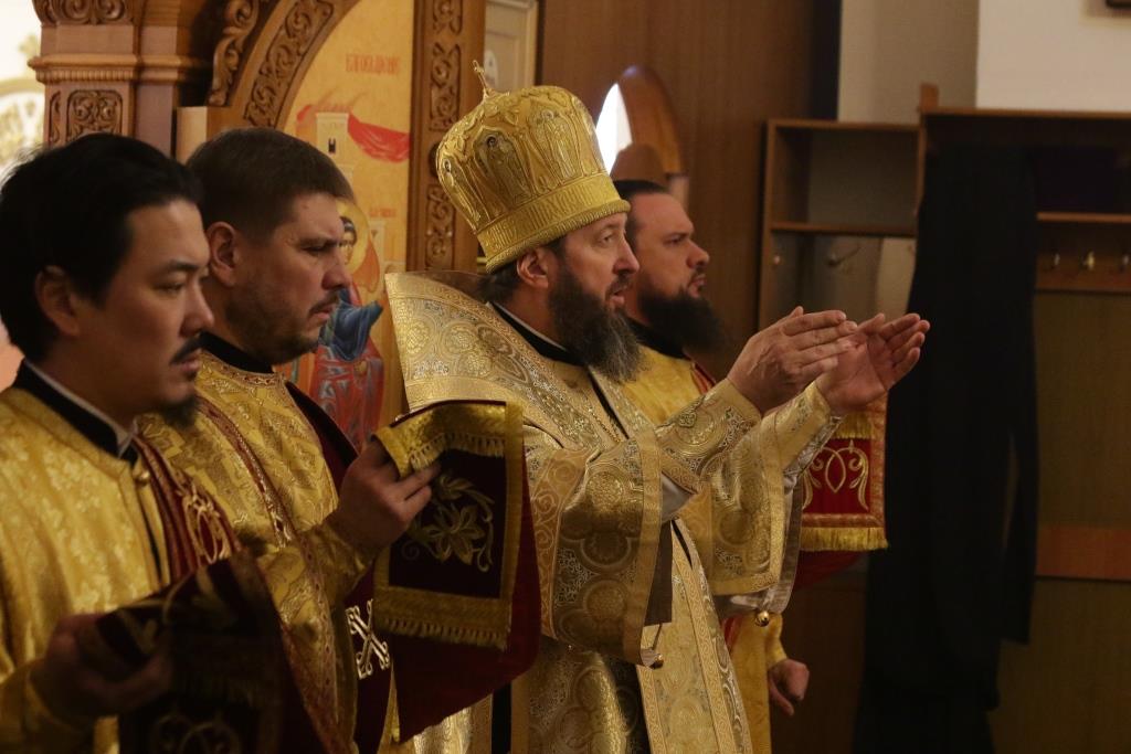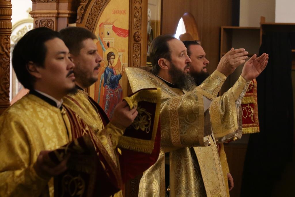 Архипастырю сослужили: духовник епархии архимандрит Спиридон (Теплухин), ключарь собора иеромонах Никодим (Авдеев), клирик собора иеромонах Силуан (Магилев), иерей Владимир Лаврешин, секретарь епархии диакон Илия Кван, протодиакон Георгий Засыпкин, протодиакон Андрей Дудник.