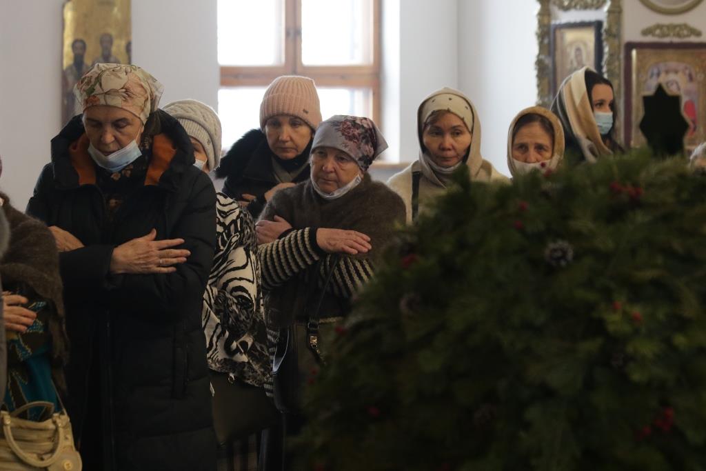 За богослужением пел хор род управлением регента Н. Романцовой. В канун Рождества Христова в храме молились прихожане, насельники Свято-Троицкого мужского монастыря и сотрудники епархиального управления.