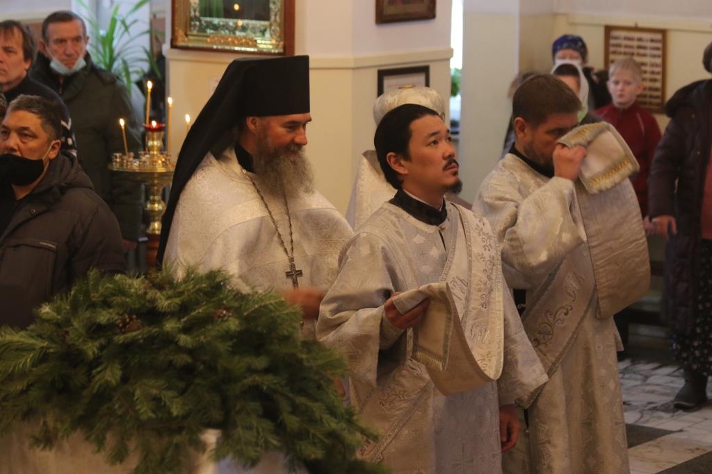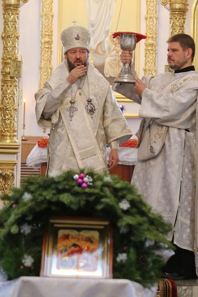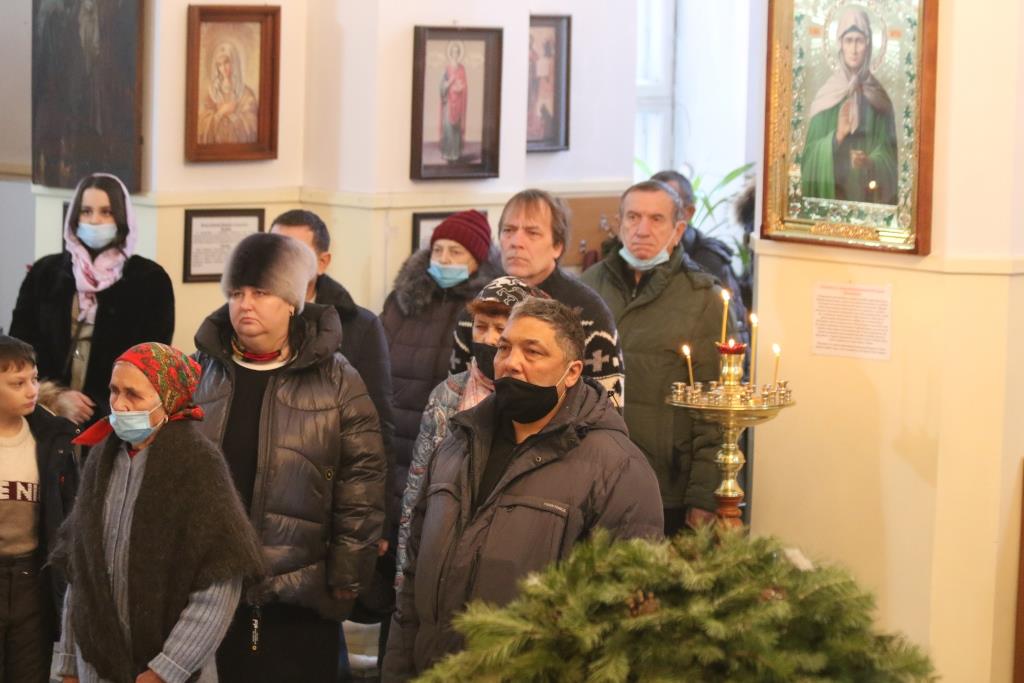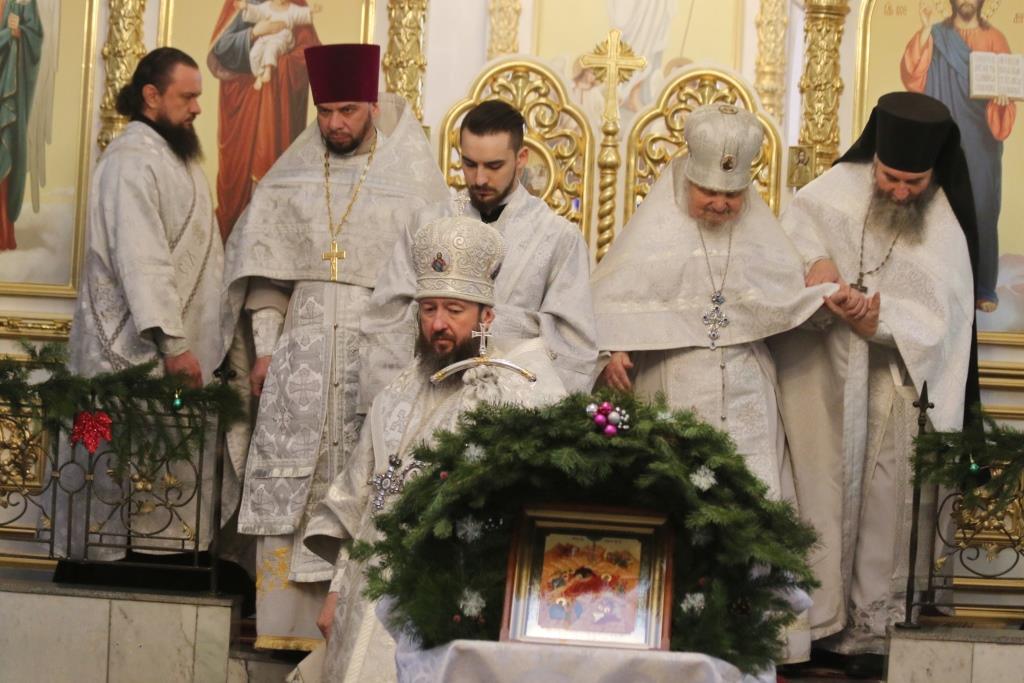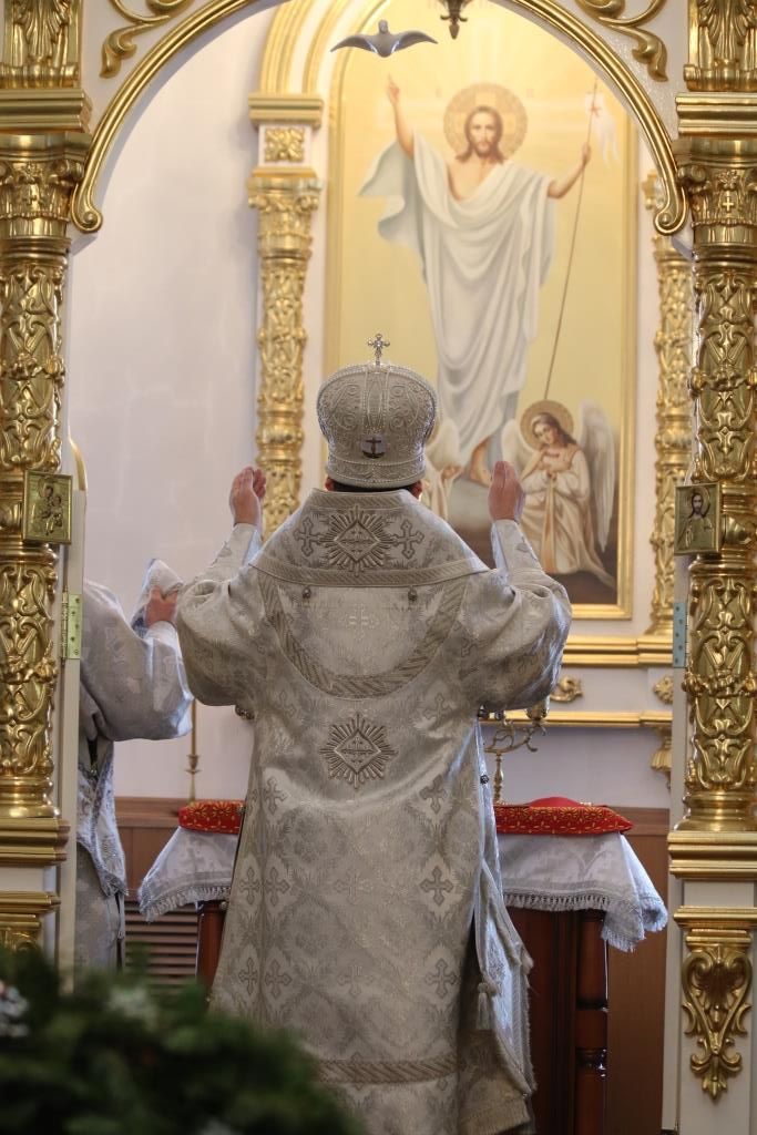 Песнопения Божественной Литургии исполнял хор Зиновьевского храма. За богослужением молились прихожане храма и паломники с городских приходов. В завершение Литургии было совершено славление Господу Иисусу Христу, после чего Владыка епископ поздравил молящихся с праздником Рождества Христова и воскресным днем и обратился к прихожанам со словами проповеди.