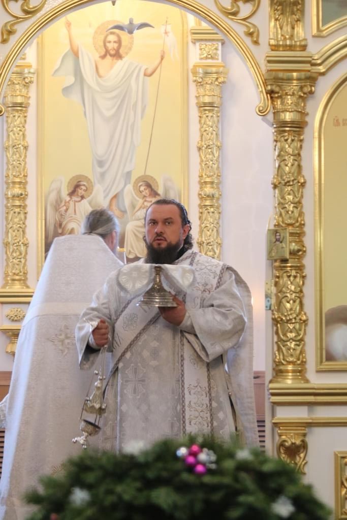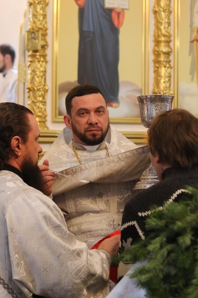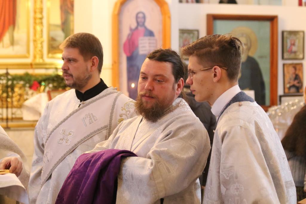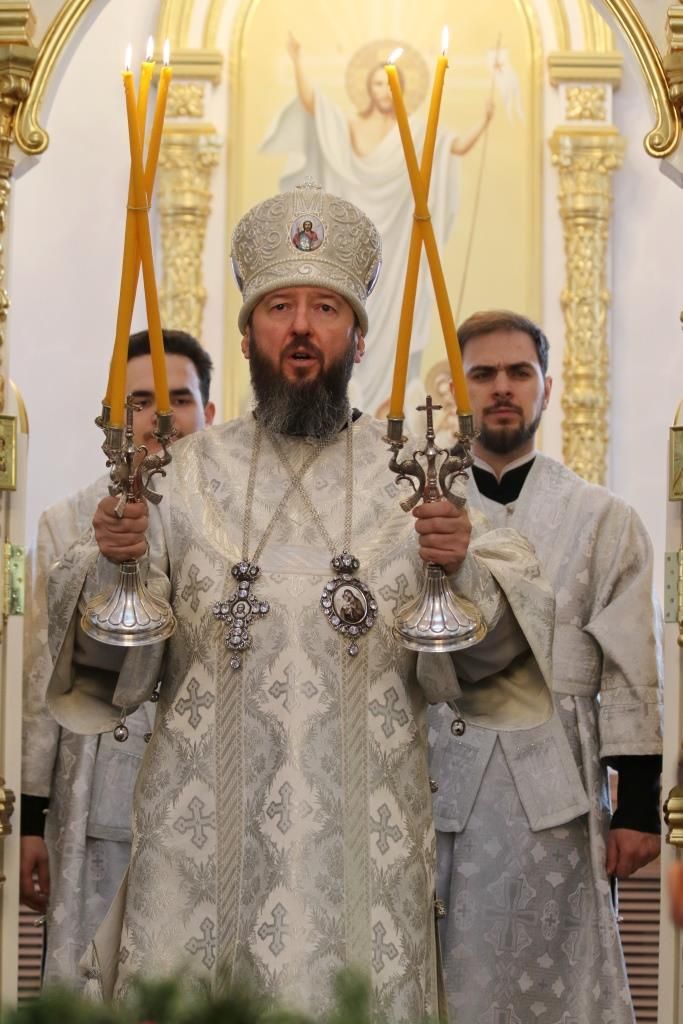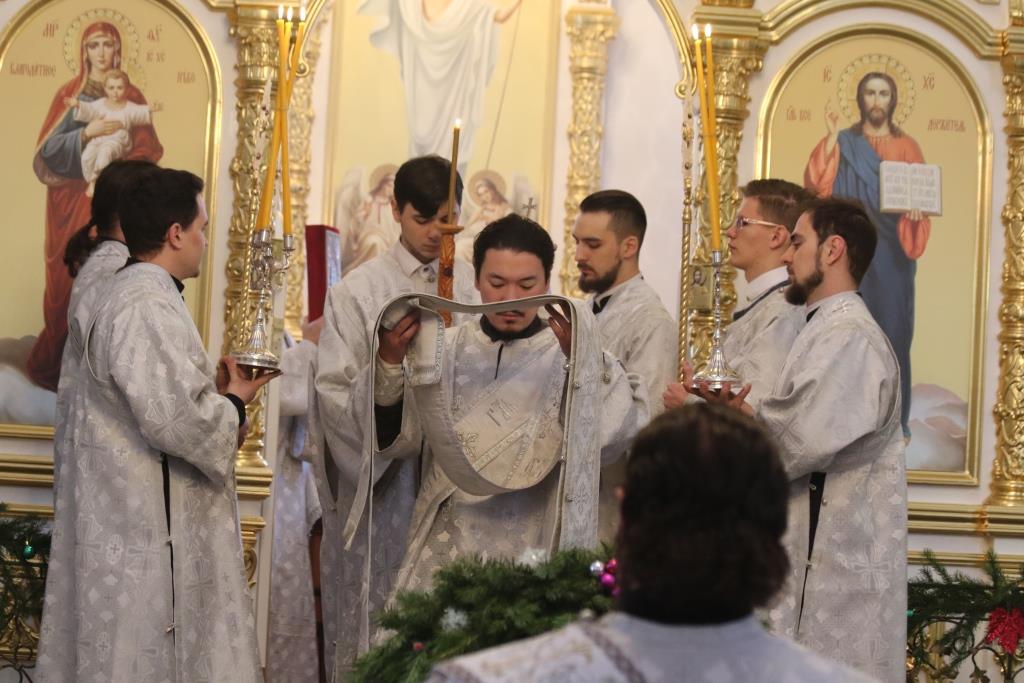 Песнопения Божественной Литургии исполнял хор Зиновьевского храма. За богослужением молились прихожане храма и паломники с городских приходов. В завершение Литургии было совершено славление Господу Иисусу Христу, после чего Владыка епископ поздравил молящихся с праздником Рождества Христова и воскресным днем и обратился к прихожанам со словами проповеди.