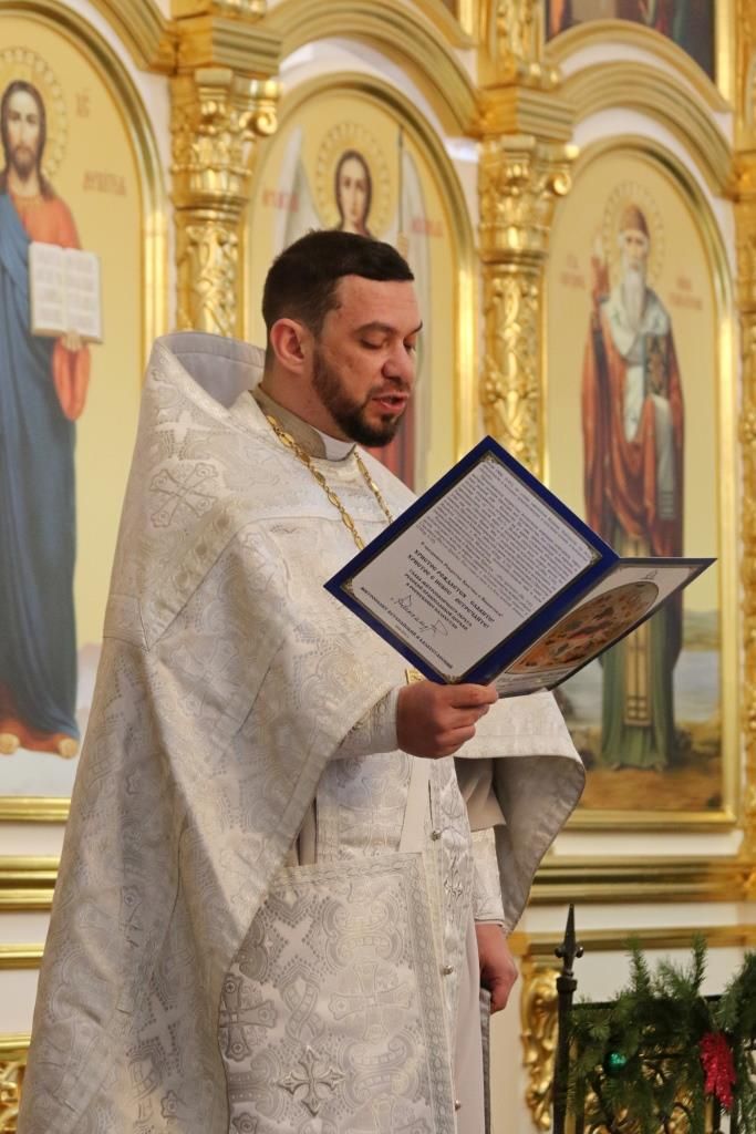 «Сегодня празднование Рождества Христова усугубилось празднованием малой Пасхи – дня воскресного. Мы пришли в Божий храм, чтобы соединиться в молитве и причастии Святых Христовых Таин и особенным образом прославить родственников нашего Господа – праведных Иосифа Обручника, псалмопевца и пророка царя Давида и первого епископа Иерусалимской христианской общины Иакова, брата Господня. Эти люди прожили чистую и праведную жизнь, ожидая обещанного Отцом Небесным избавления. Если мы откроем Псалтирь царя Давида, то увидим, что вся она буквально пронизана этим ожиданием, пронизана скорбь, которая растворена твёрдым упованием скорого пришествия Избавителя. И Давид ныне радуется на небесах, видя исполнение всех своих пророчеств.