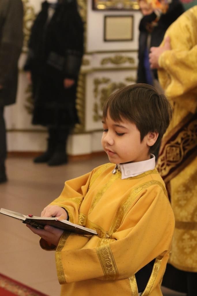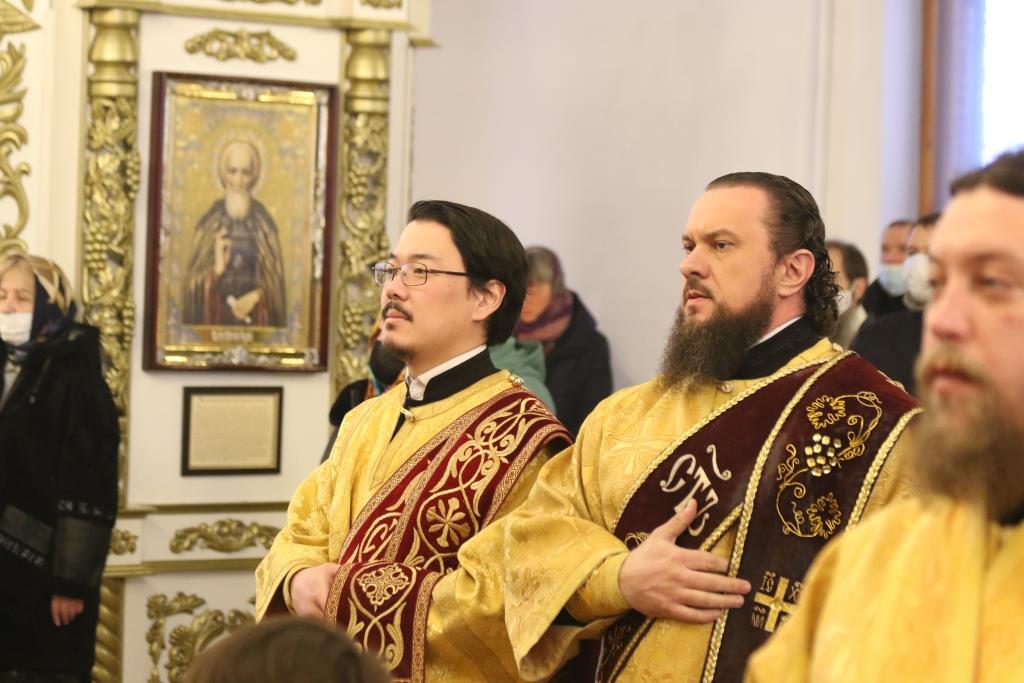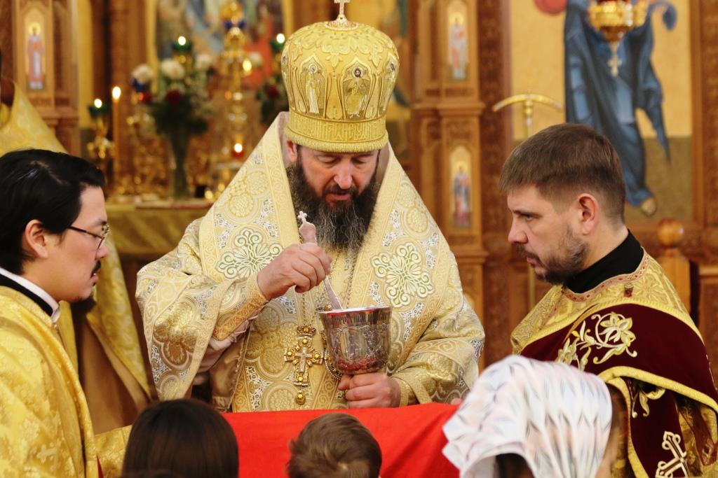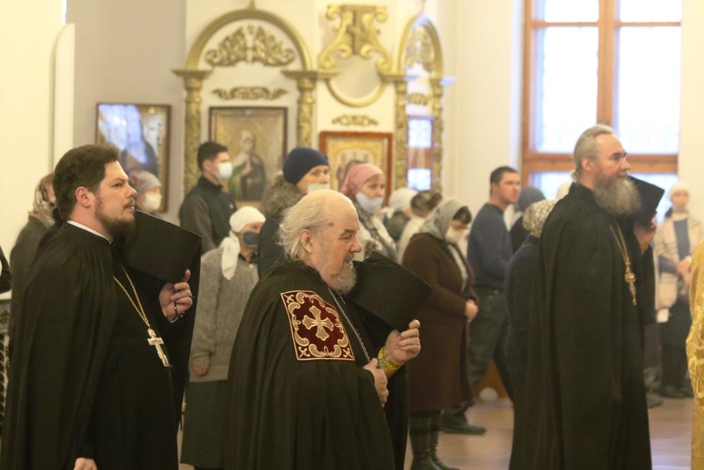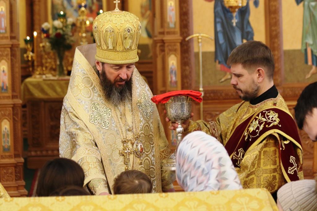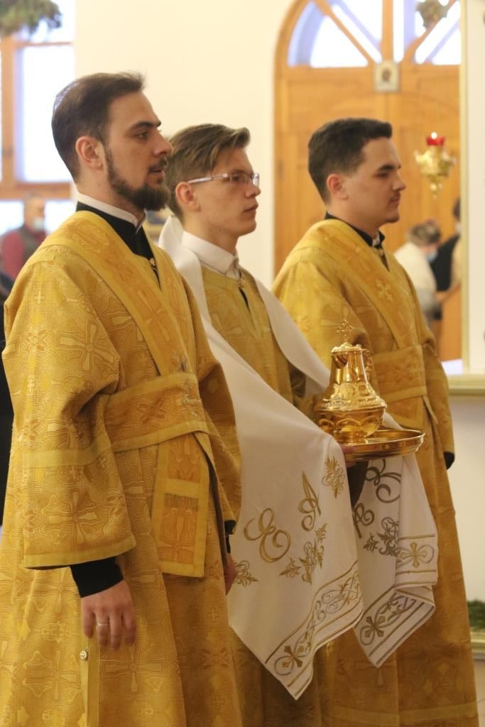 Песнопения воскресной Литургии исполнял хор под управлением регента Н. Романцовой. За богослужением молились прихожане кафедрального собора, сотрудники епархиального управления и насельники Свято-Троицкого мужского монастыря. Перед причастием мирян проповедовал иеромонах Силуан (Магилев).