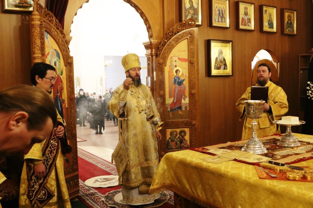 Управляющий Усть-Каменогорской и Семипалатинской епархией Преосвященнейший епископ Амфилохий возглавил служение Божественной Литургии святителя Иоанна Златоуста в Андреевском кафедральном соборе города Усть-Каменогорска. Архипастырю сослужили: духовник епархии архимандрит Спиридон (Теплухин), ключарь собора иеромонах Никодим (Авдеев), клирики собора иерей Алексий Клепиков, иеромонах Силуан (Магилев), секретарь епархии диакон Илия Кван, протодиаконы Георгий Засыпкин и Андрей Дудник.