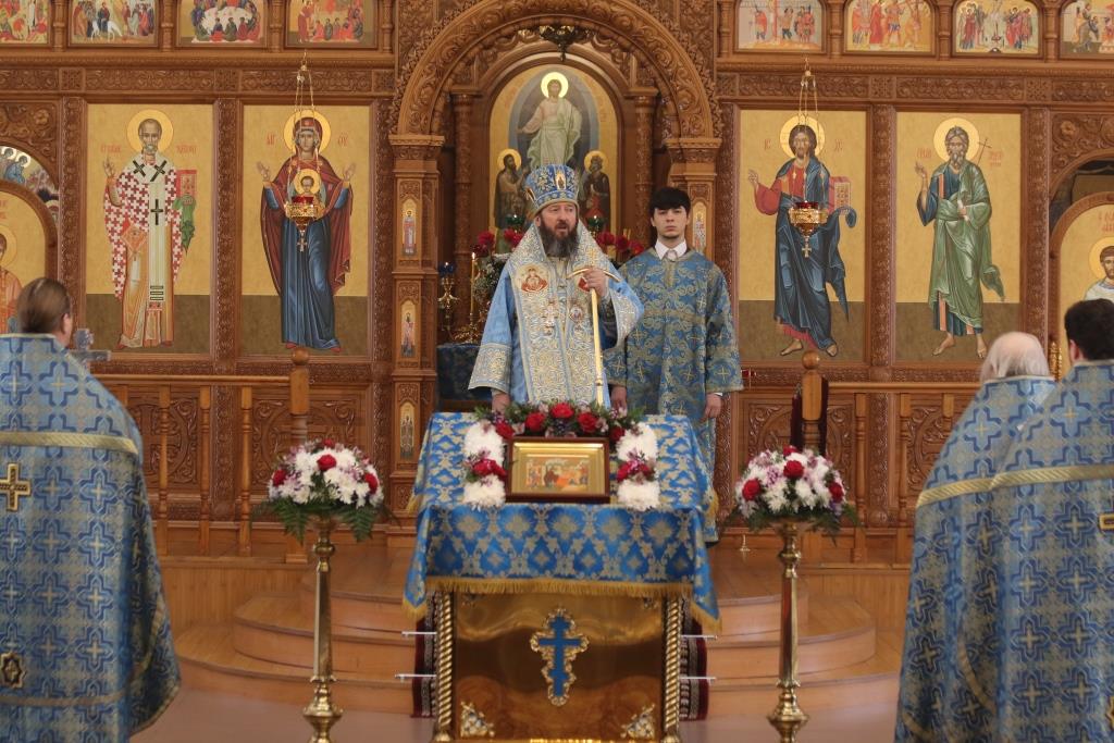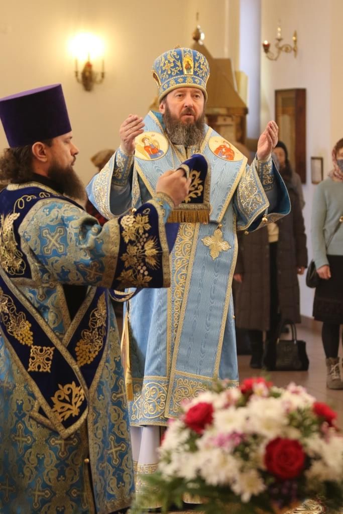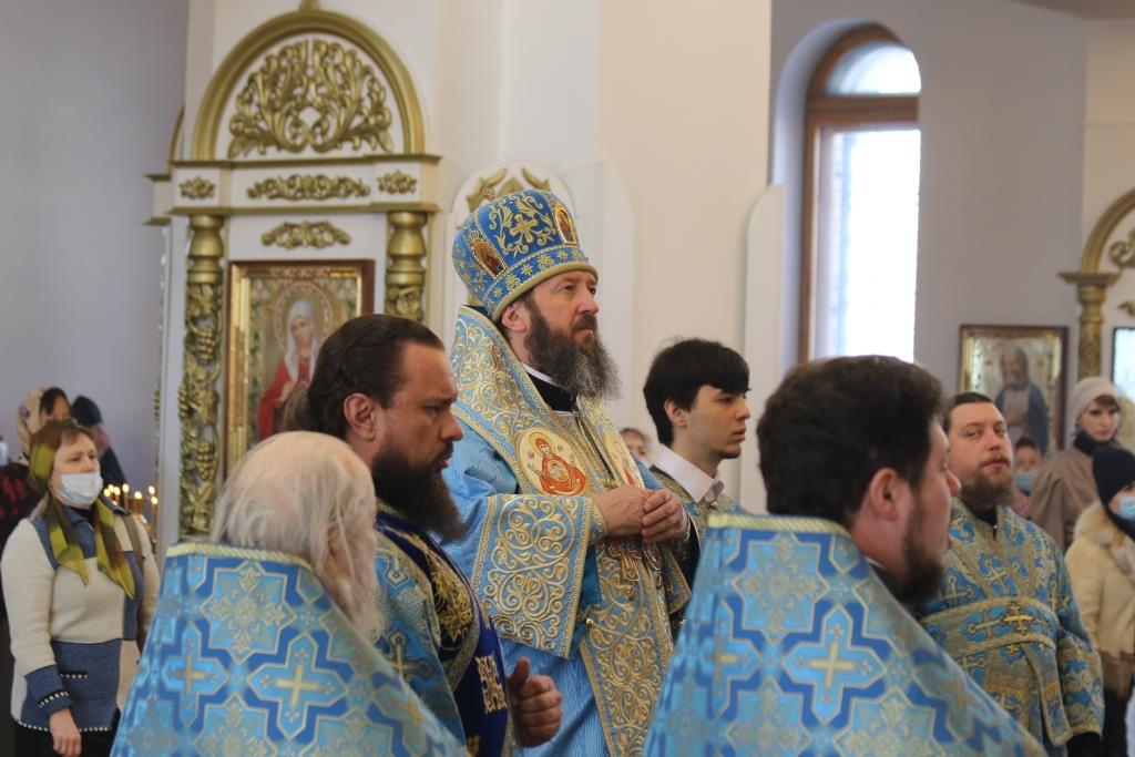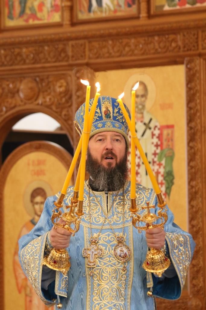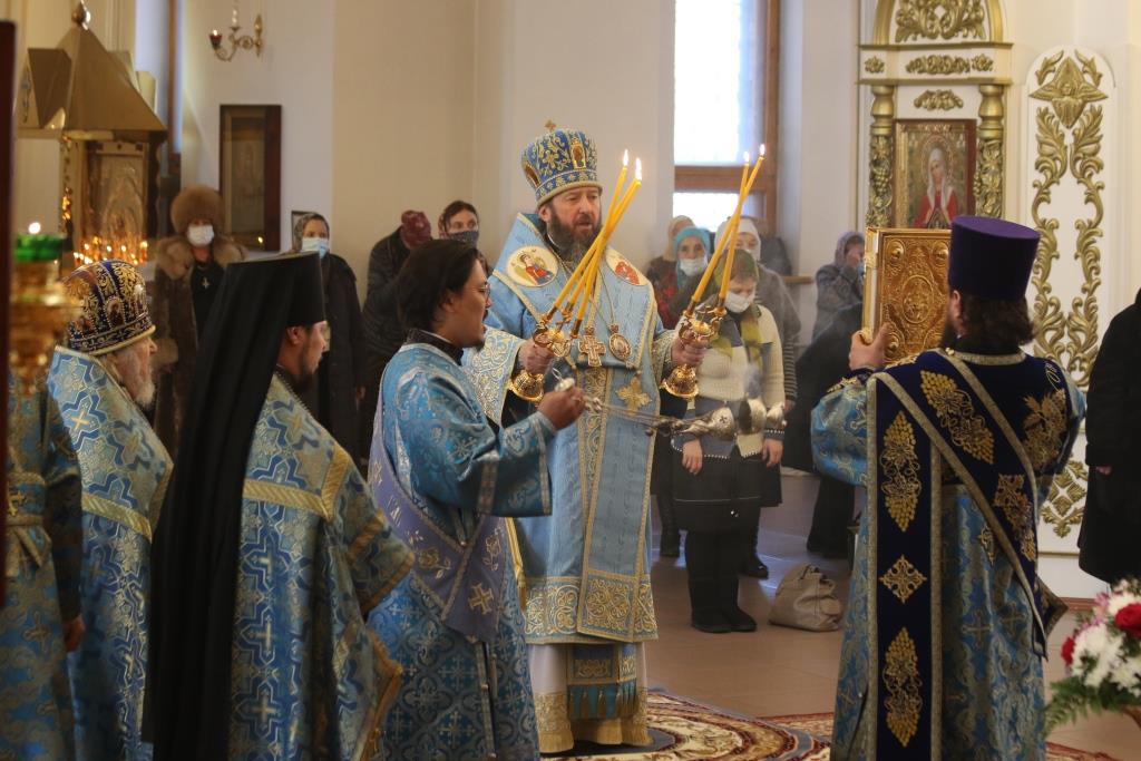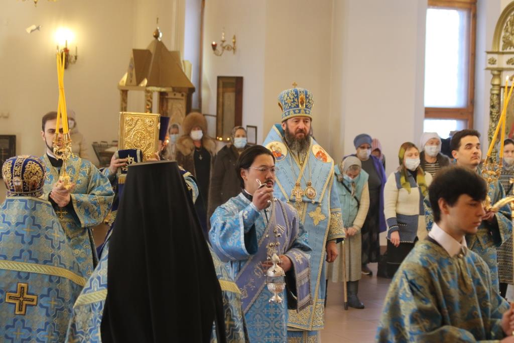 После заамвонной молитвы было совершено славление Господу Иисусу Христу и Его Пречистой Матери. В завершение праздничного богослужения Преосвященнейший Владыка поздравил богомольцев с двунадесятым торжеством Сретения Господня и обратился к народу Божию с проповедью.