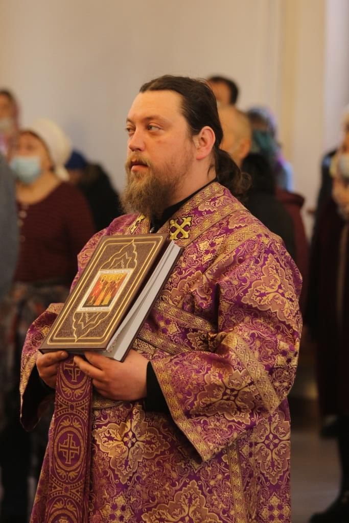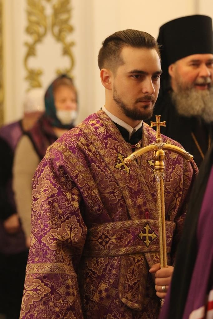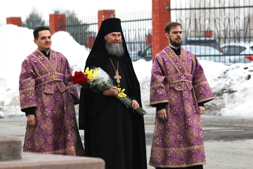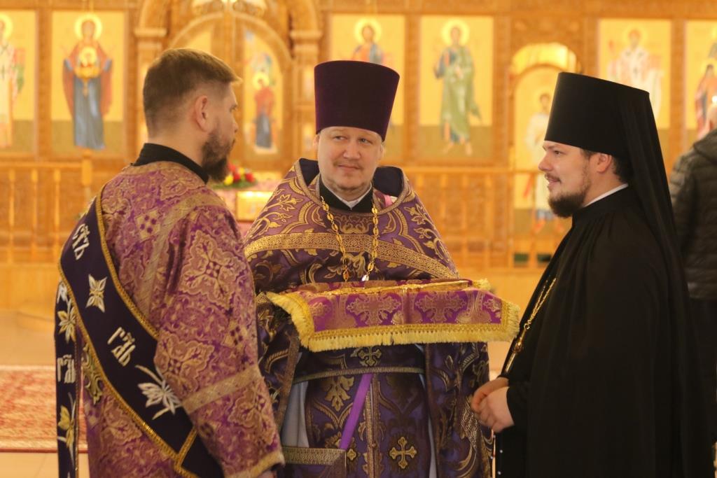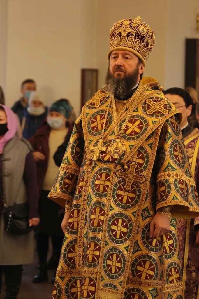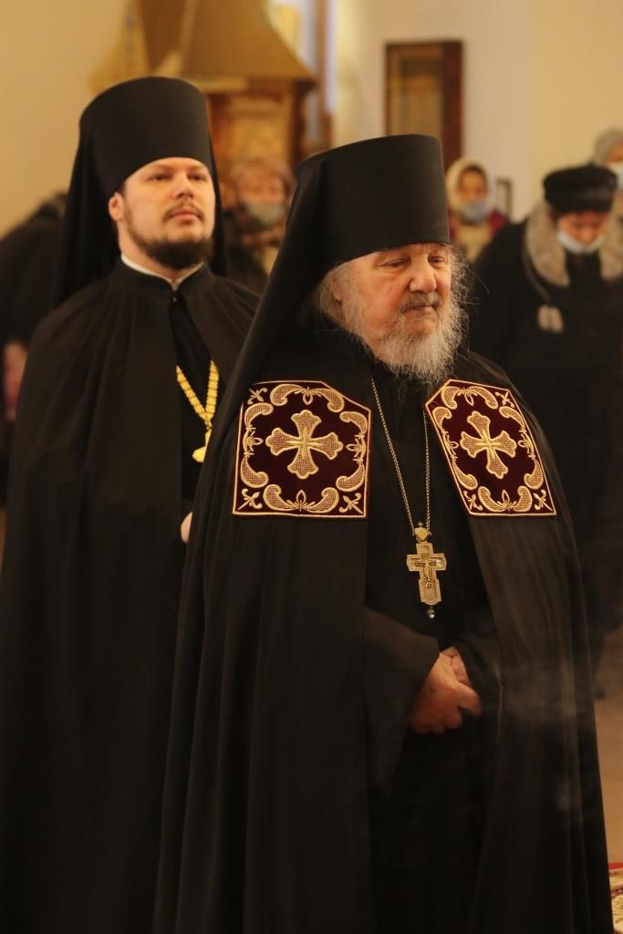 Его Преосвященству сослужили: духовник епархии архимандрит Спиридон (Теплухин), ключарь Андреевского собора иеромонах Никодим (Авдеев), клирики собора иеромонах Силуан (Магилёв), и иерей Роман Подрезов, секретарь епархии диакон Илия Кван протодиакон Георгий Засыпкин, протодиакон Андрей Дудник.