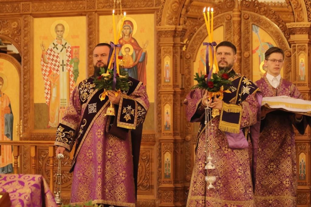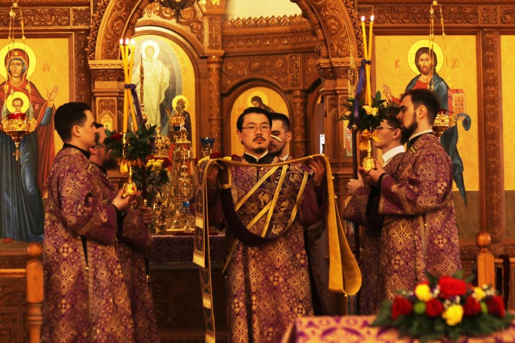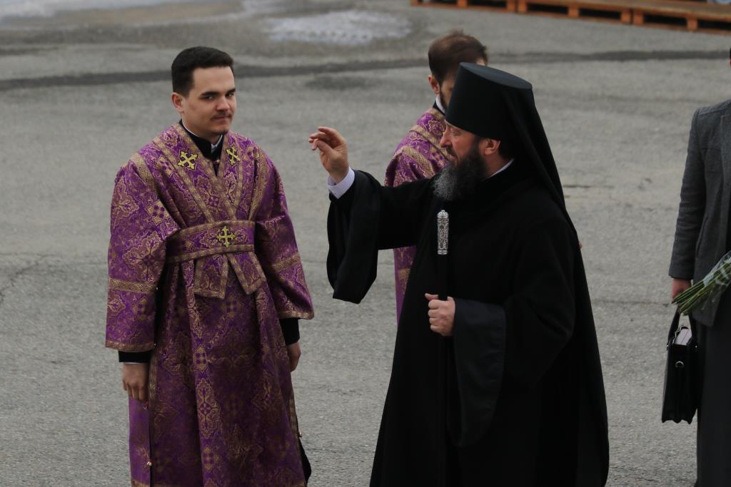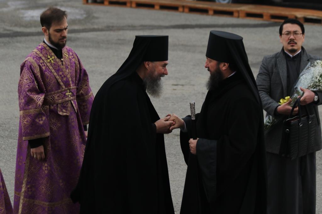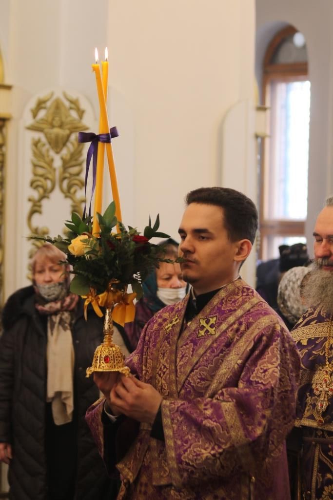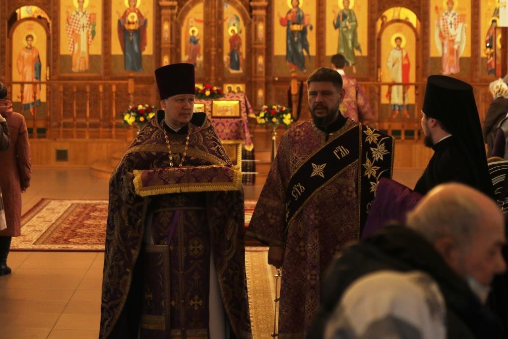 Его Преосвященству сослужили: духовник епархии архимандрит Спиридон (Теплухин), ключарь Андреевского собора иеромонах Никодим (Авдеев), клирики собора иеромонах Силуан (Магилёв), и иерей Роман Подрезов, секретарь епархии диакон Илия Кван протодиакон Георгий Засыпкин, протодиакон Андрей Дудник.
