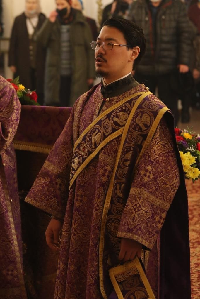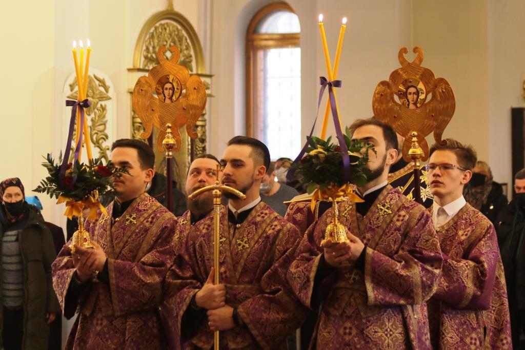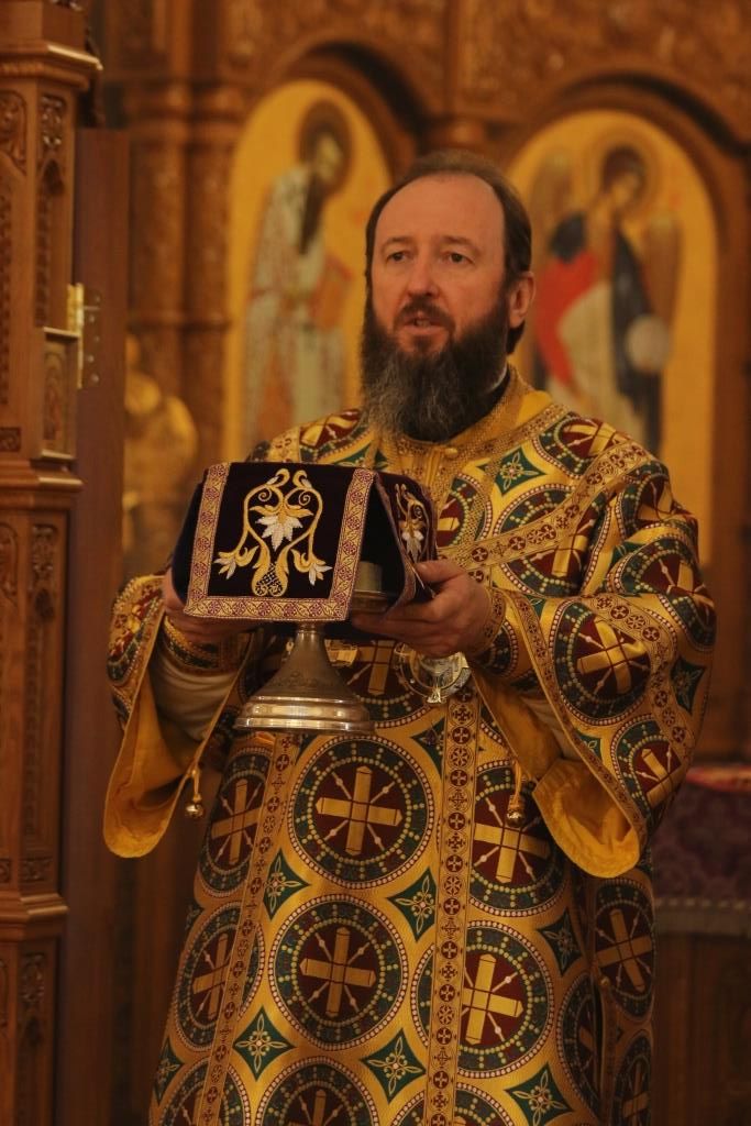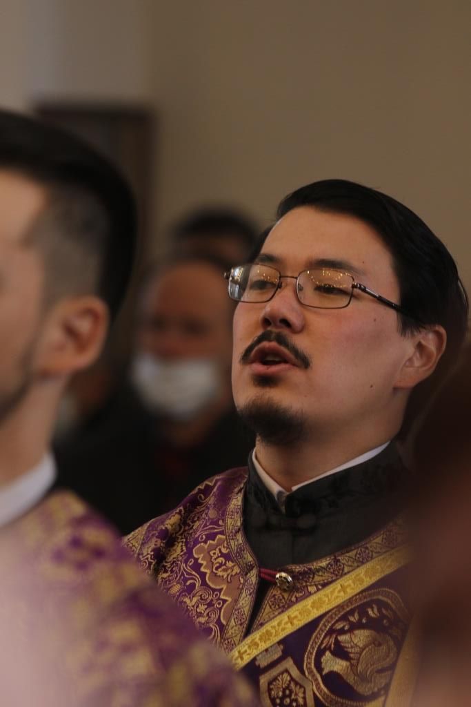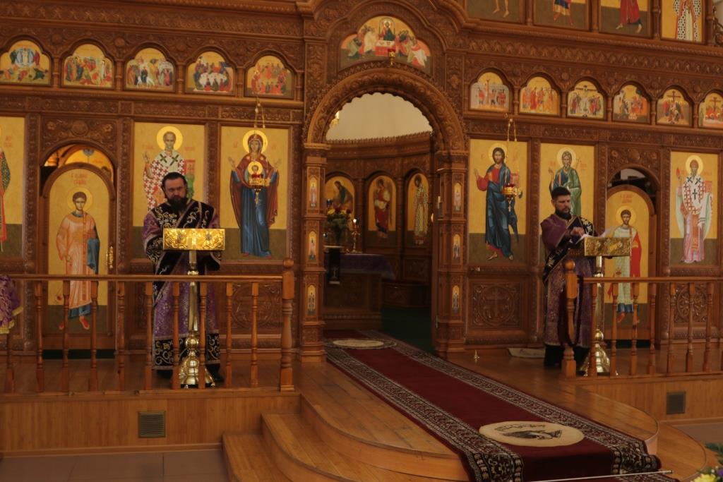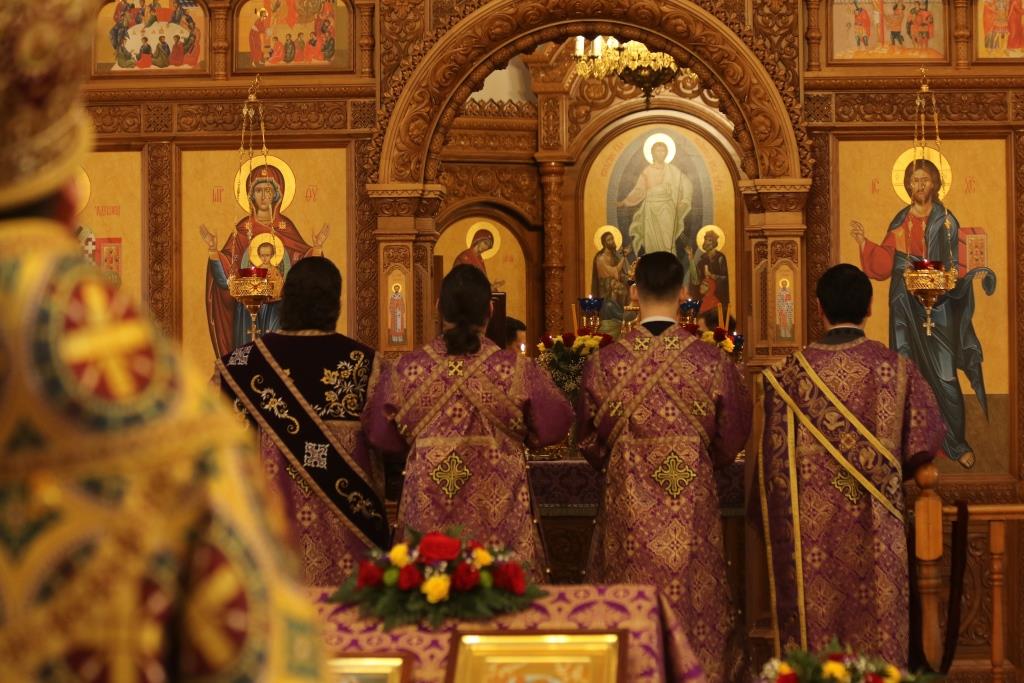 Его Преосвященству сослужили: духовник епархии архимандрит Спиридон (Теплухин), ключарь Андреевского собора иеромонах Никодим (Авдеев), клирики собора иеромонах Силуан (Магилёв), и иерей Роман Подрезов, секретарь епархии диакон Илия Кван протодиакон Георгий Засыпкин, протодиакон Андрей Дудник.