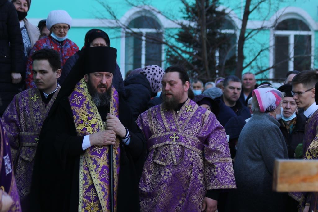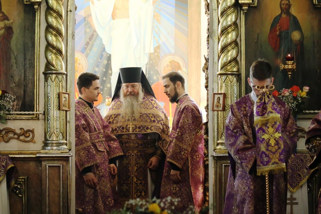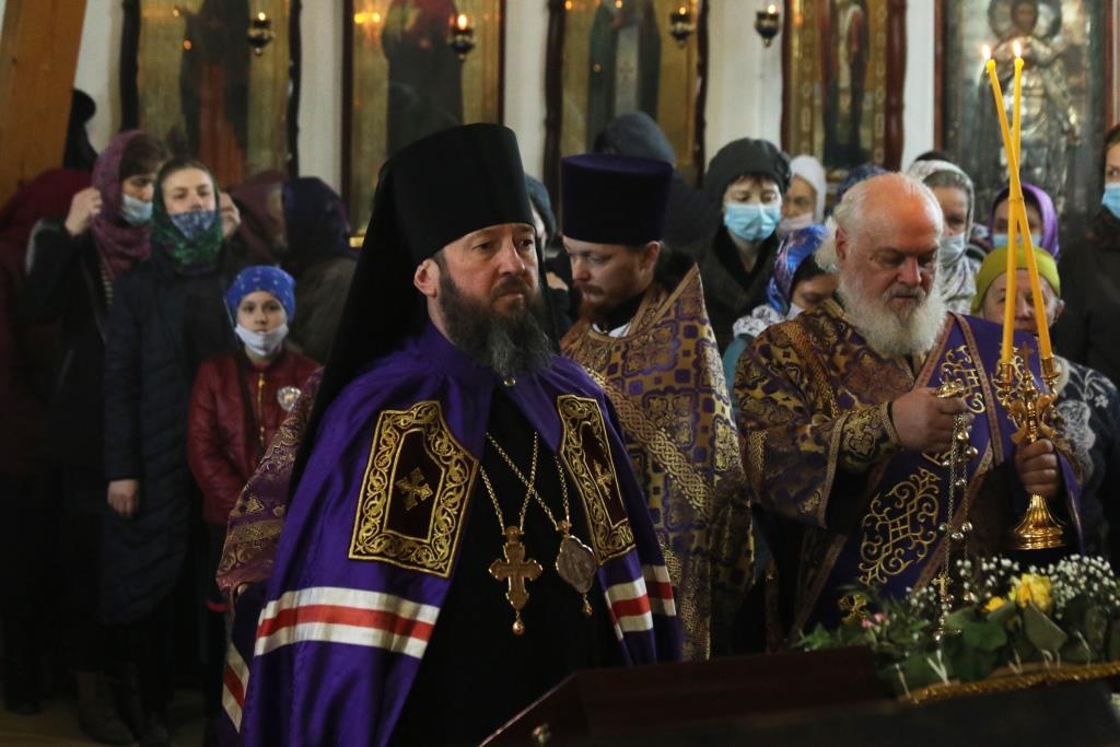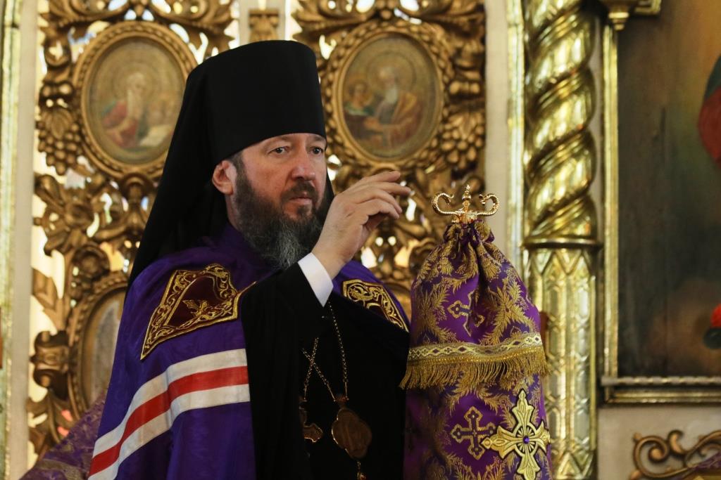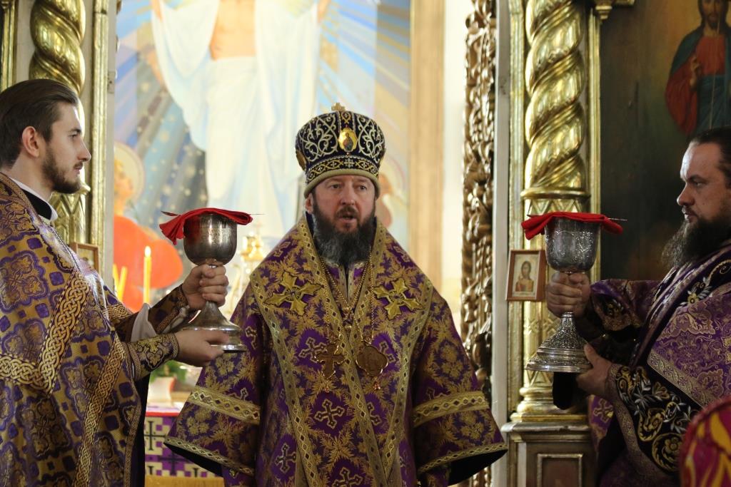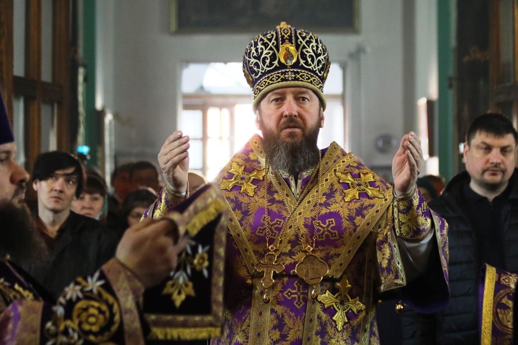 Его Преосвященству сослужили иеромонах Агапит (Никонов), иерей Евгений Хохряков, иерей Иоанн Толмачев, секретарь епархии диакон Илия Кван, протодиакон Андрей Дудник, диакон Николай Белоконь. Хор под управлением регента Ю. Хохряковой исполнял песнопения Божественной Литургии и Недели Крестопоклонной. За богослужением молились прихожане и паломники Воскресенского кафедрального собора. После заамвонной молитвы было совершено славление Честному Древу Креста Господня, затем Преосвященнейший Владыка обратился к собравшимся со словами проповеди.