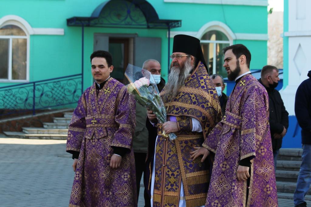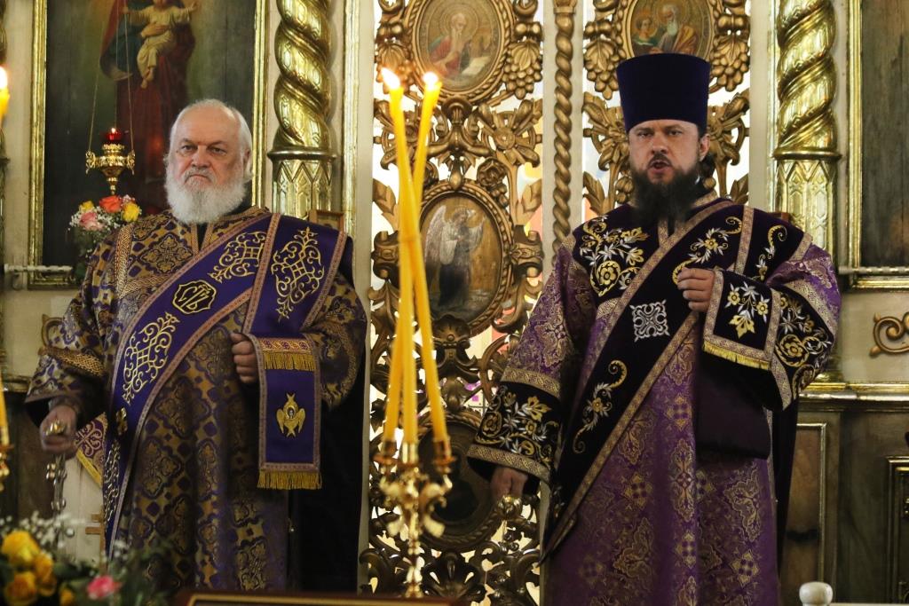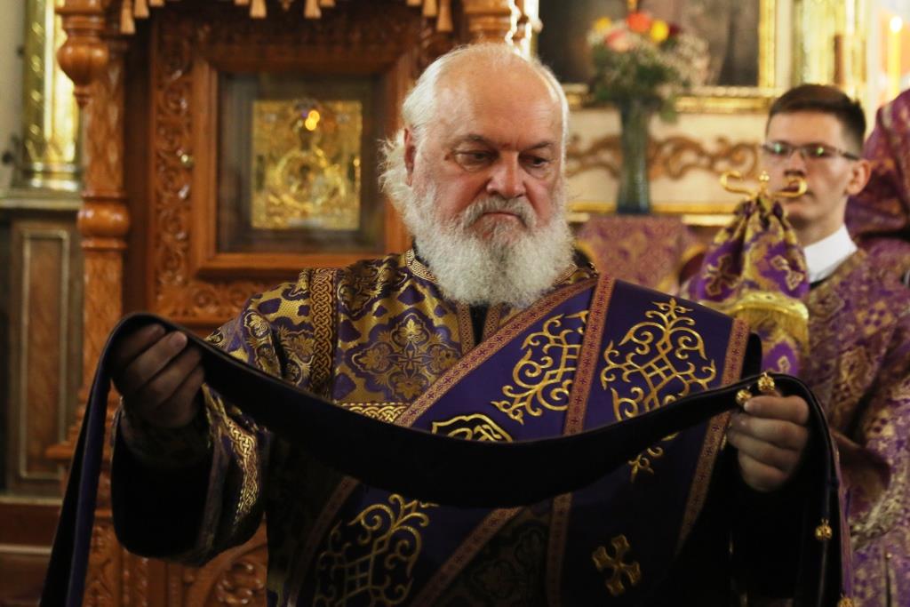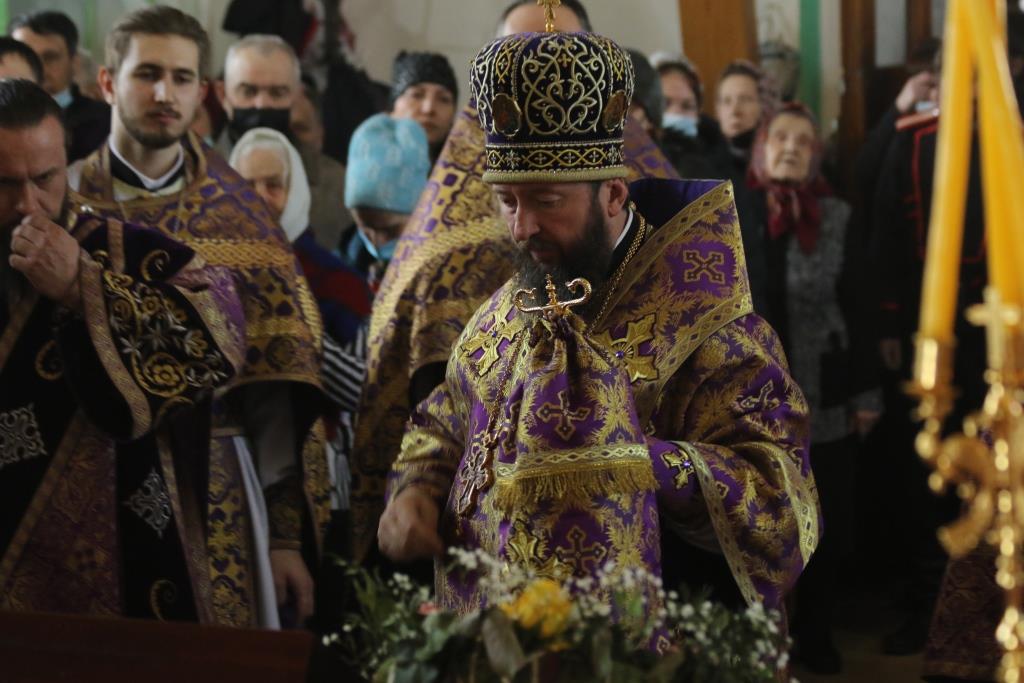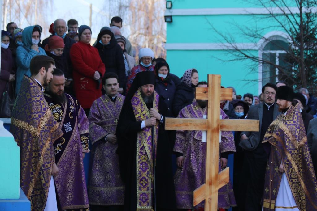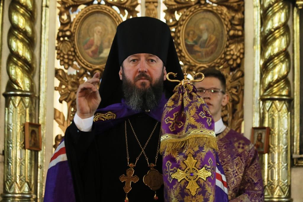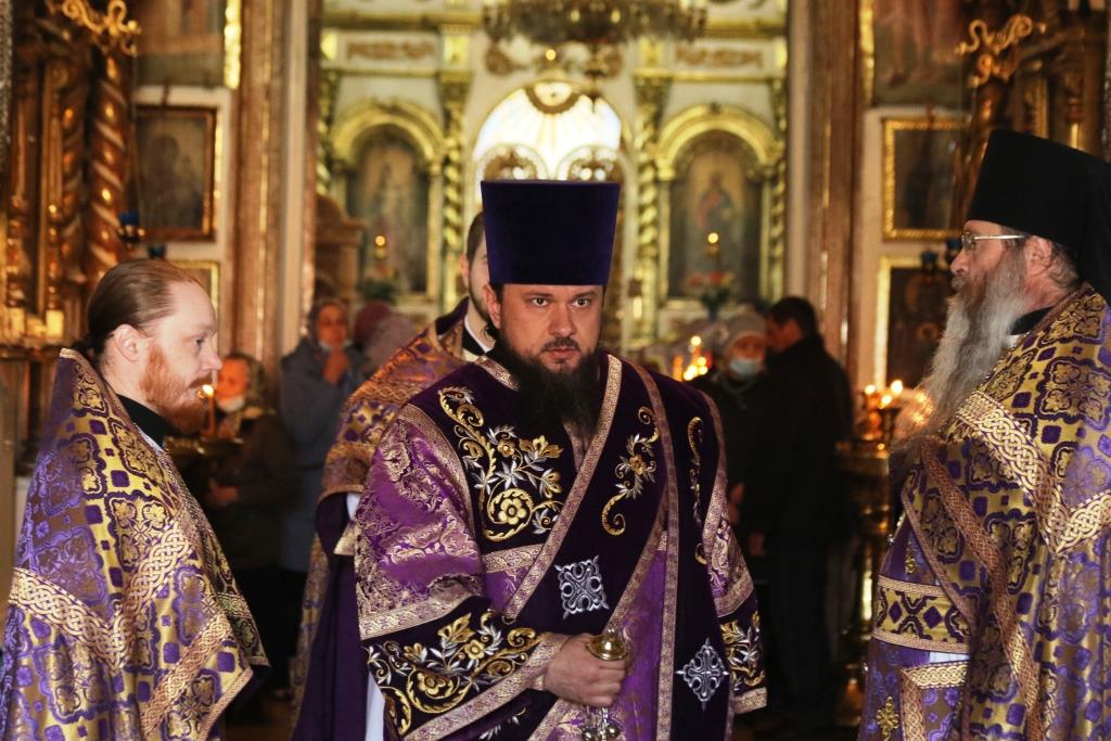 Его Преосвященству сослужили иеромонах Агапит (Никонов), иерей Евгений Хохряков, иерей Иоанн Толмачев, секретарь епархии диакон Илия Кван, протодиакон Андрей Дудник, диакон Николай Белоконь. Хор под управлением регента Ю. Хохряковой исполнял песнопения Божественной Литургии и Недели Крестопоклонной. За богослужением молились прихожане и паломники Воскресенского кафедрального собора. После заамвонной молитвы было совершено славление Честному Древу Креста Господня, затем Преосвященнейший Владыка обратился к собравшимся со словами проповеди.