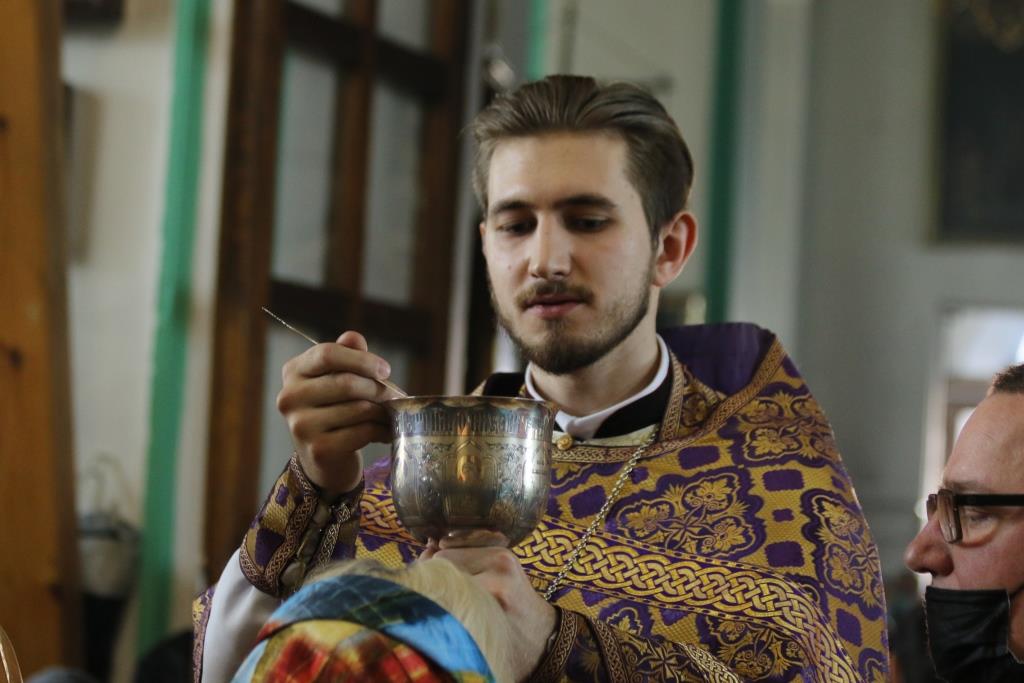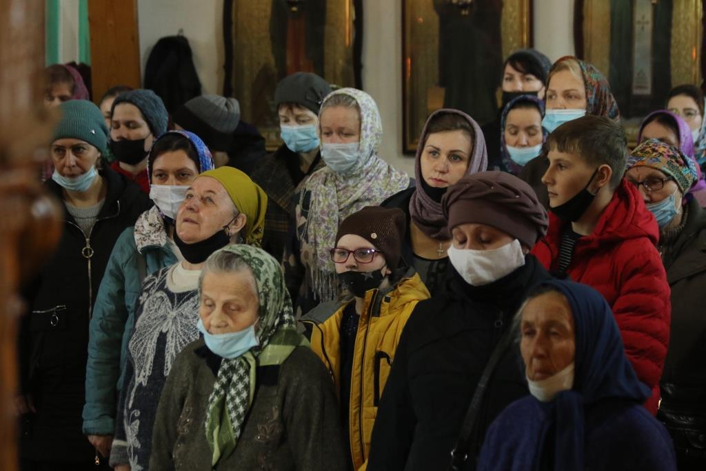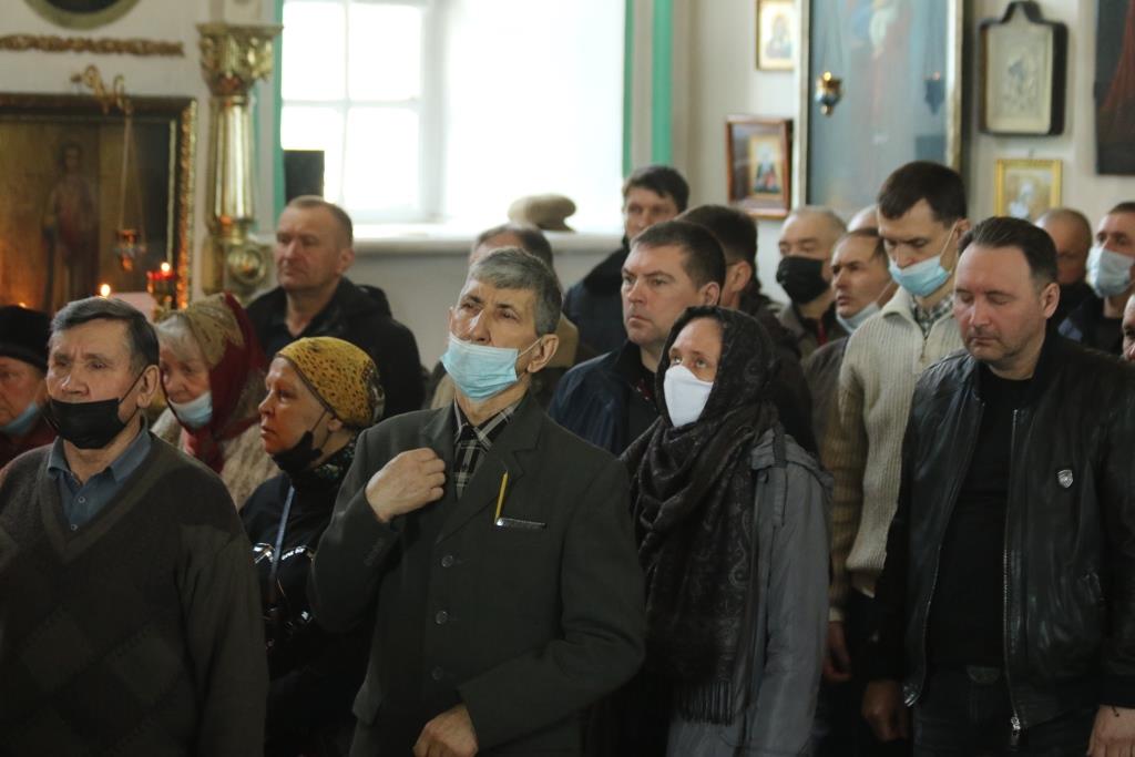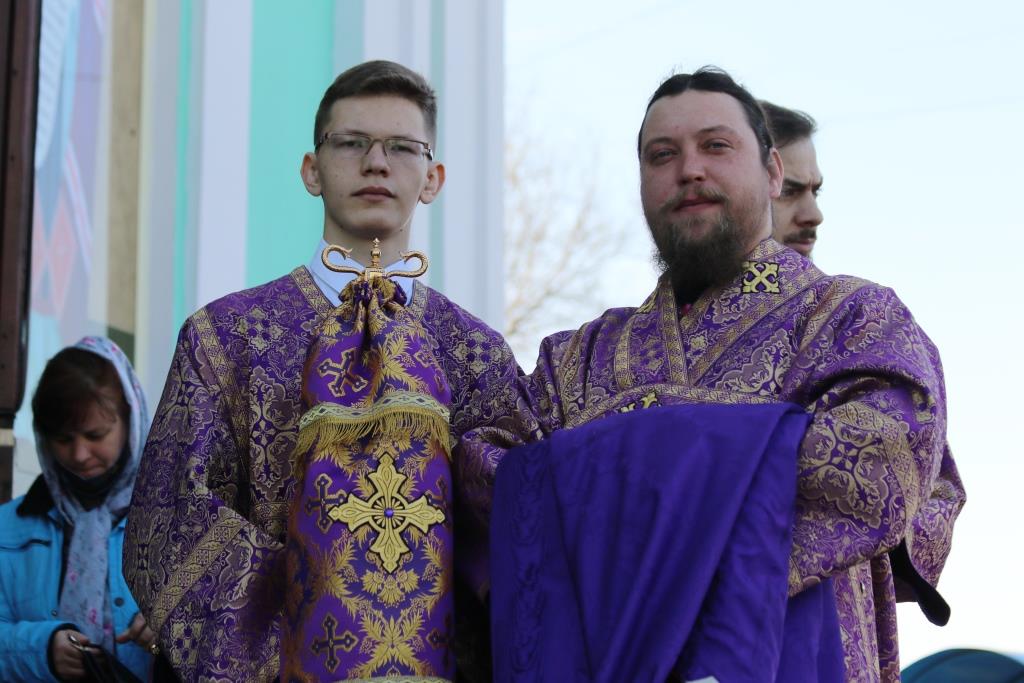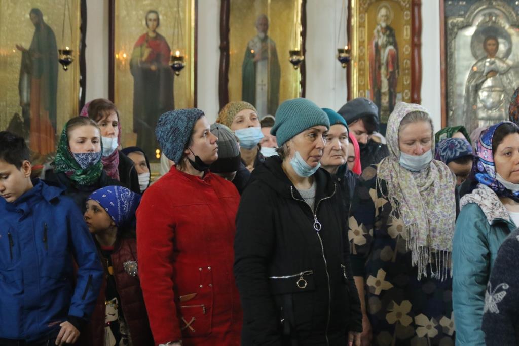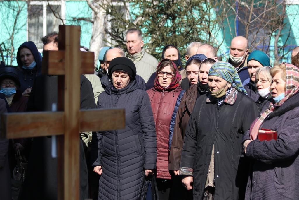 Его Преосвященству сослужили иеромонах Агапит (Никонов), иерей Евгений Хохряков, иерей Иоанн Толмачев, секретарь епархии диакон Илия Кван, протодиакон Андрей Дудник, диакон Николай Белоконь. Хор под управлением регента Ю. Хохряковой исполнял песнопения Божественной Литургии и Недели Крестопоклонной. За богослужением молились прихожане и паломники Воскресенского кафедрального собора. После заамвонной молитвы было совершено славление Честному Древу Креста Господня, затем Преосвященнейший Владыка обратился к собравшимся со словами проповеди.