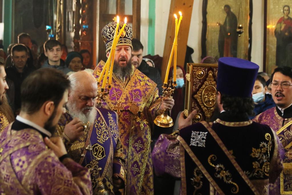 В Крестопоклонное воскресение Святой Четыредесятницы Преосвященнейший епископ Усть-Каменогорский и Семипалатинский Амфилохий возглавил служение Божественной Литургии святителя Василия Великого в Спасо-Воскресенском кафедральном соборе города Семипалатинска.