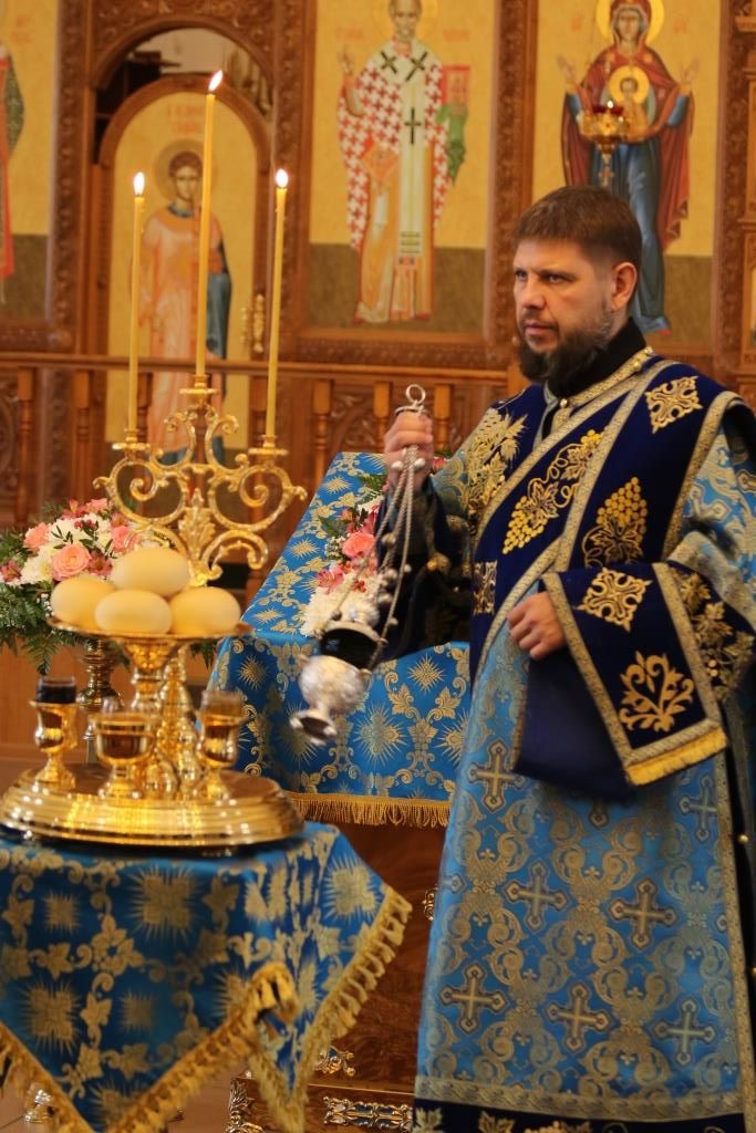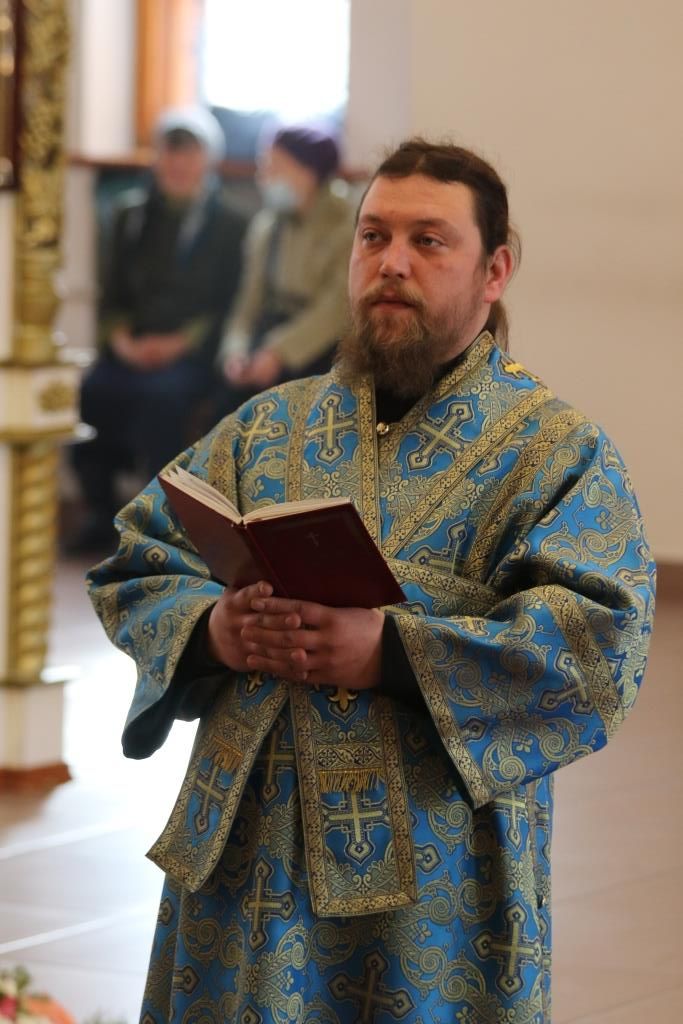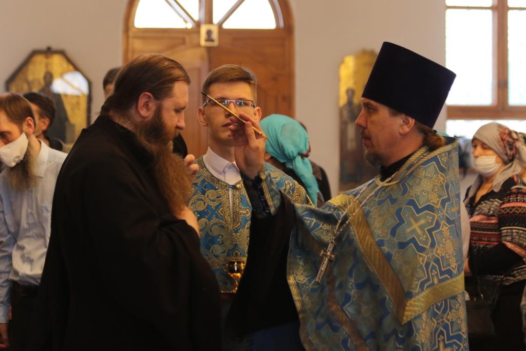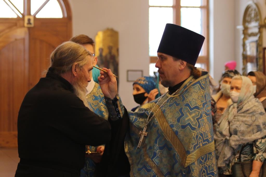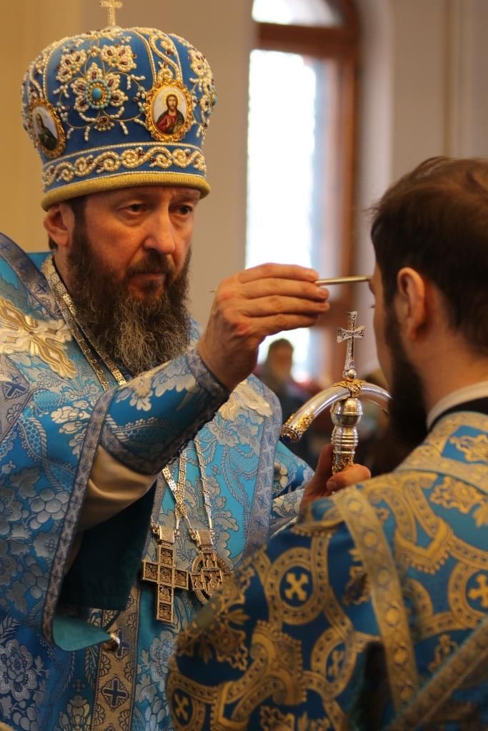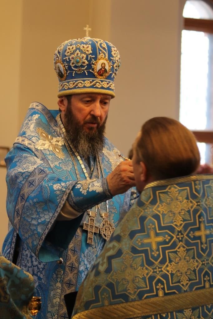 За богослужением епископ Амфилохий поздравил клирика кафедрального собора протодиакона Георгия Засыпкина с 45-летием со дня рождения и вручил ему памятный подарок. После чтения праздничного евангельского зачала епископ Амфилохий помазал клириков освященным елеем.