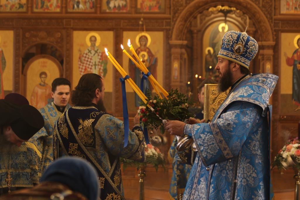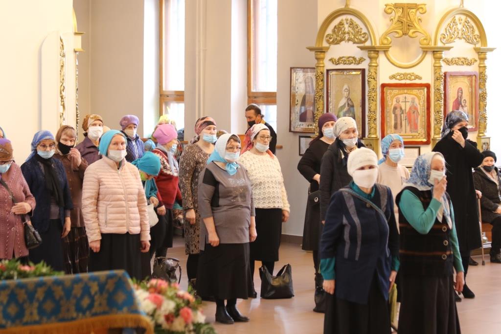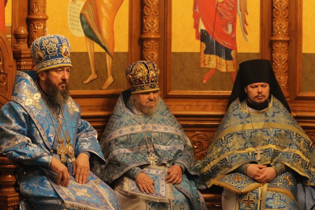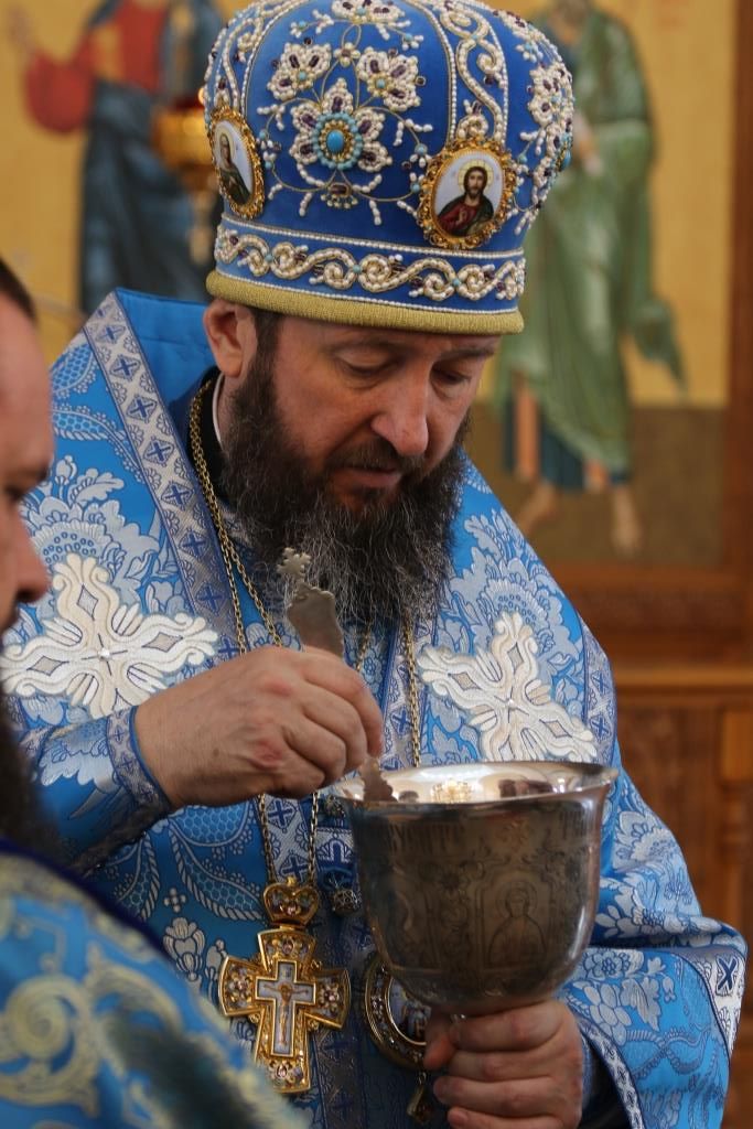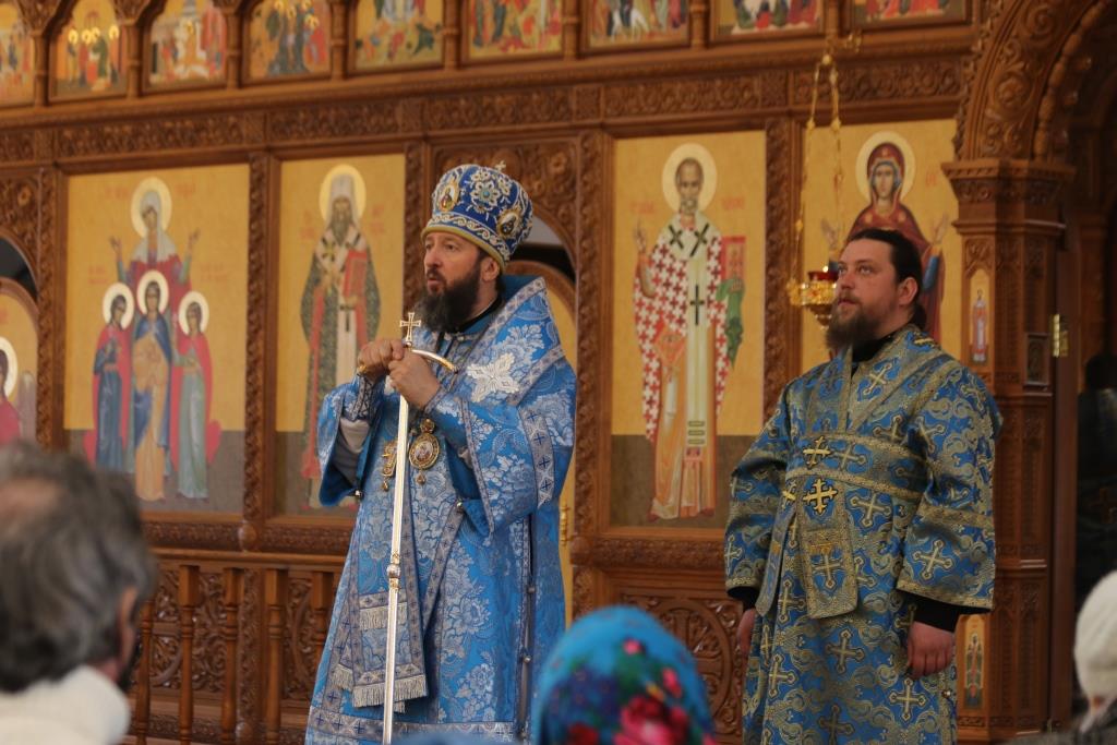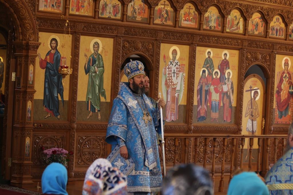 Перед причастием мирян проповедовал иеромонах Силуан (Магилев). После заамвонной молитвы Архипастырь с духовенством и молящимися воспел славление Пресвятой Матери Божией, после чего поздравил всех с праздником и обратился к народу Божию со словами наставления.