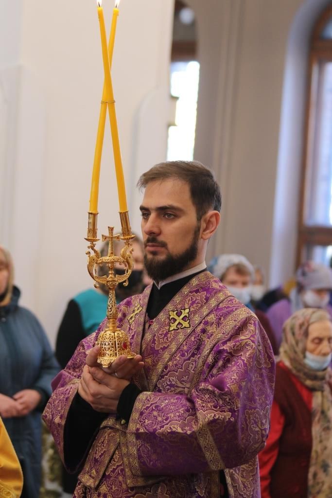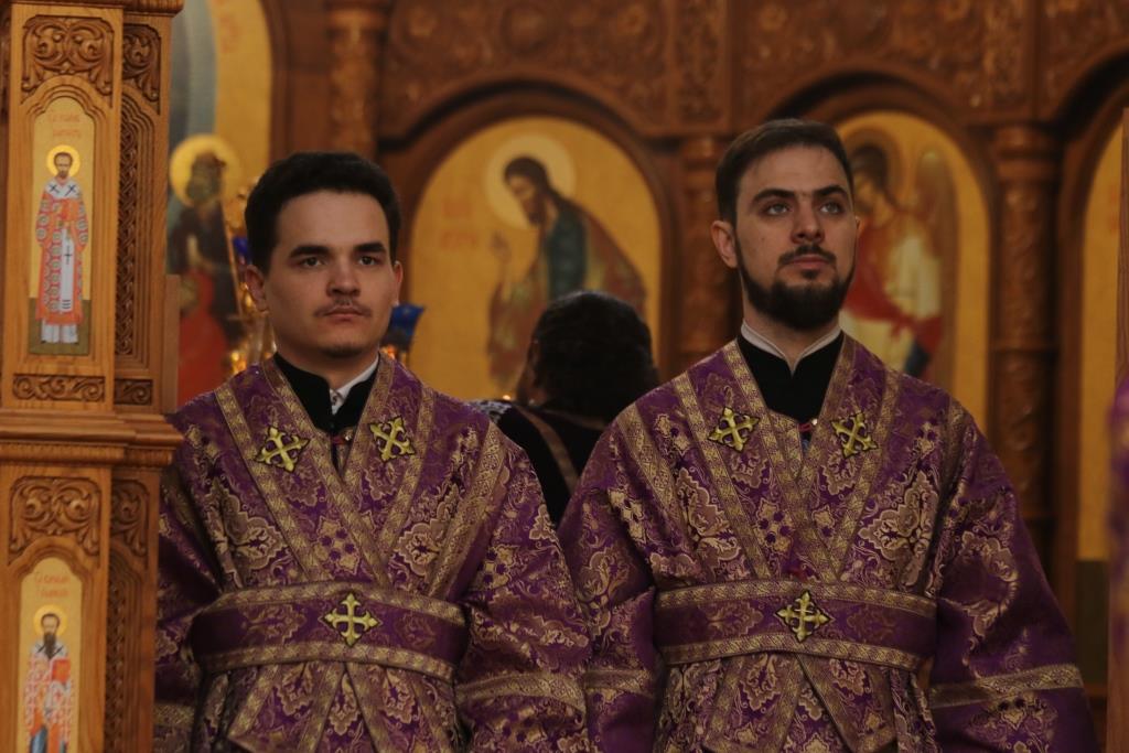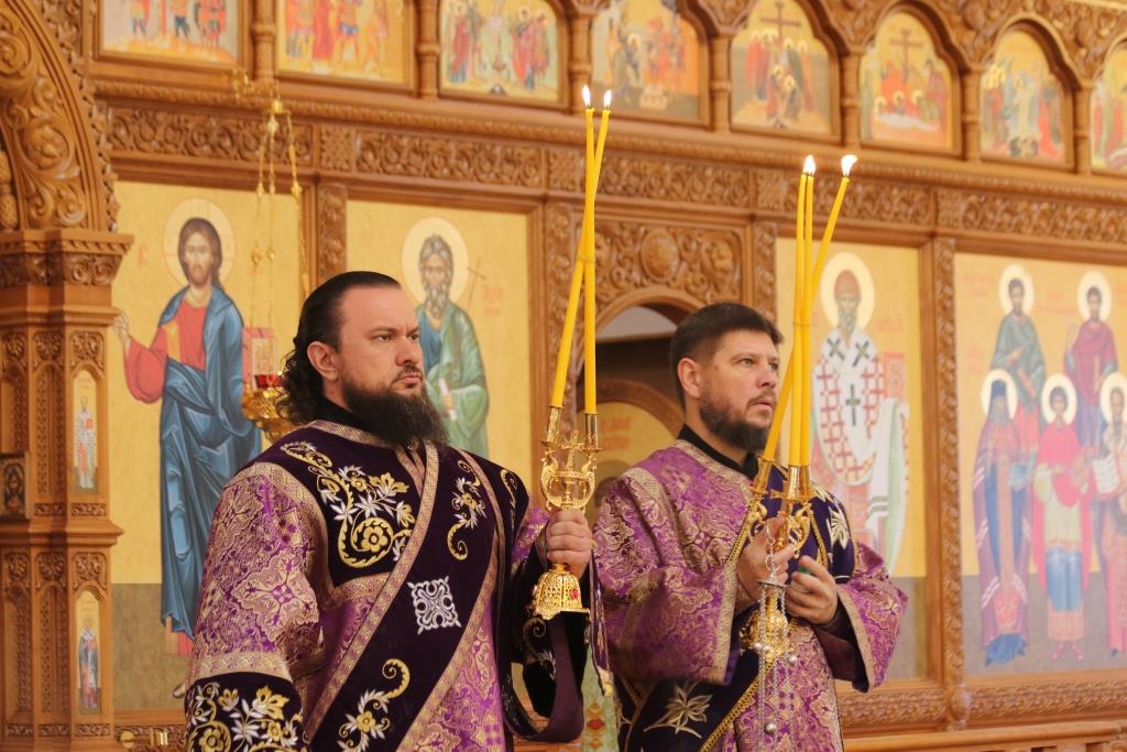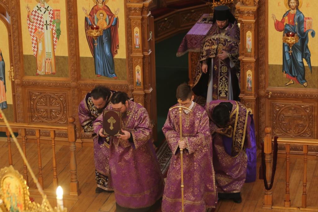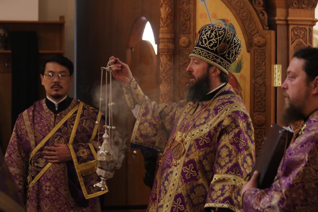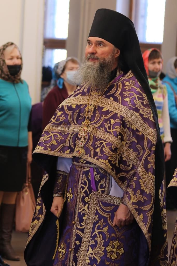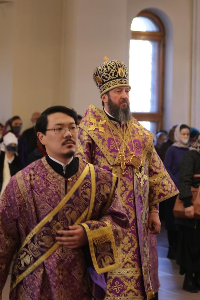 Его Преосвященству сослужили: духовник епархии архимандрит Спиридон (Теплухин), ключарь Андреевского собора иеромонах Никодим (Авдеев), клирики собора иеромонах Силуан (Магилёв) иерей Роман Подрезов, секретарь епархии диакон Илия Кван, протодиакон Георгий Засыпкин, протодиакон Андрей Дудник.