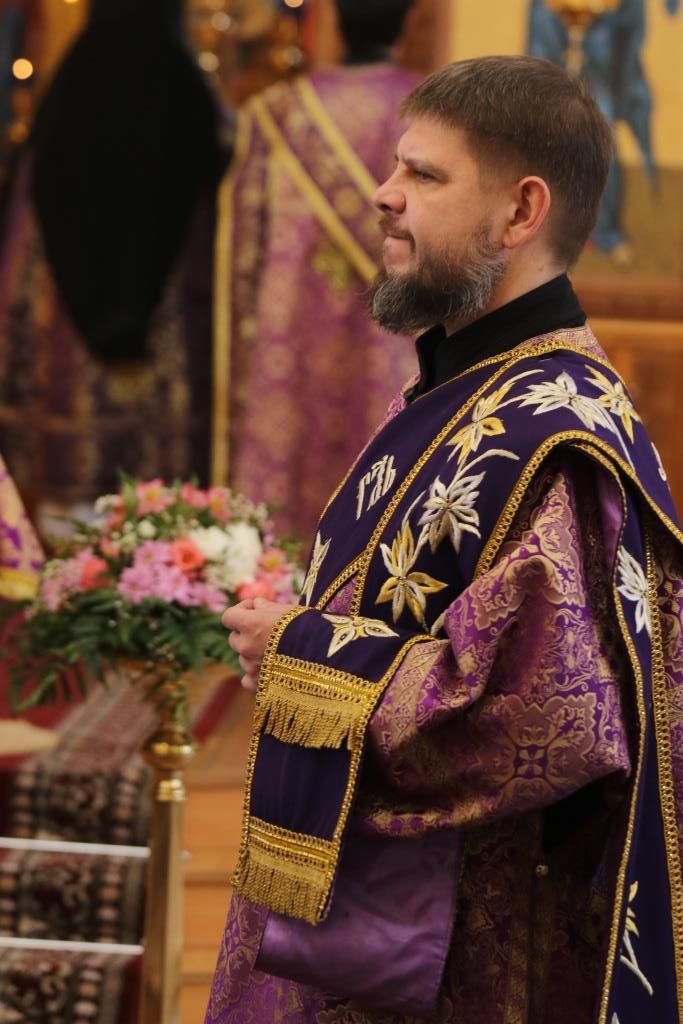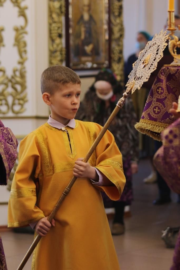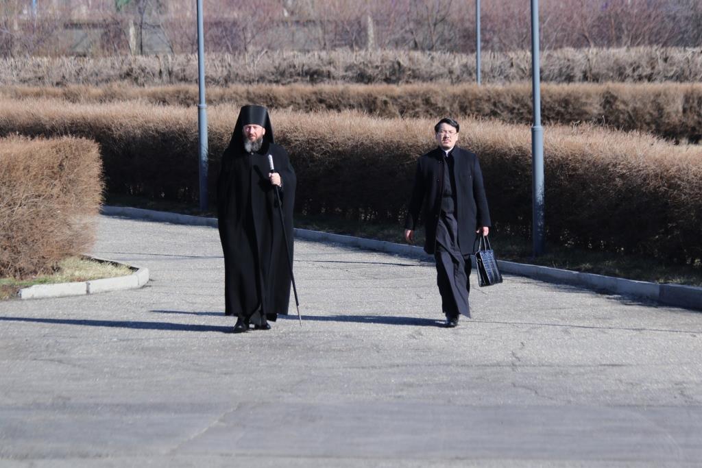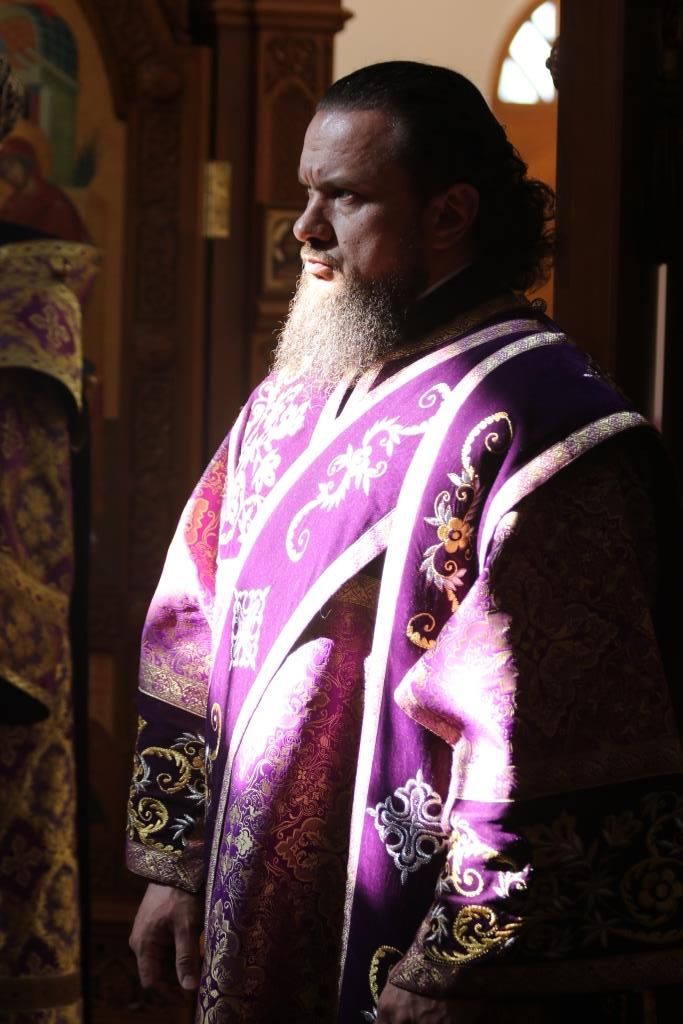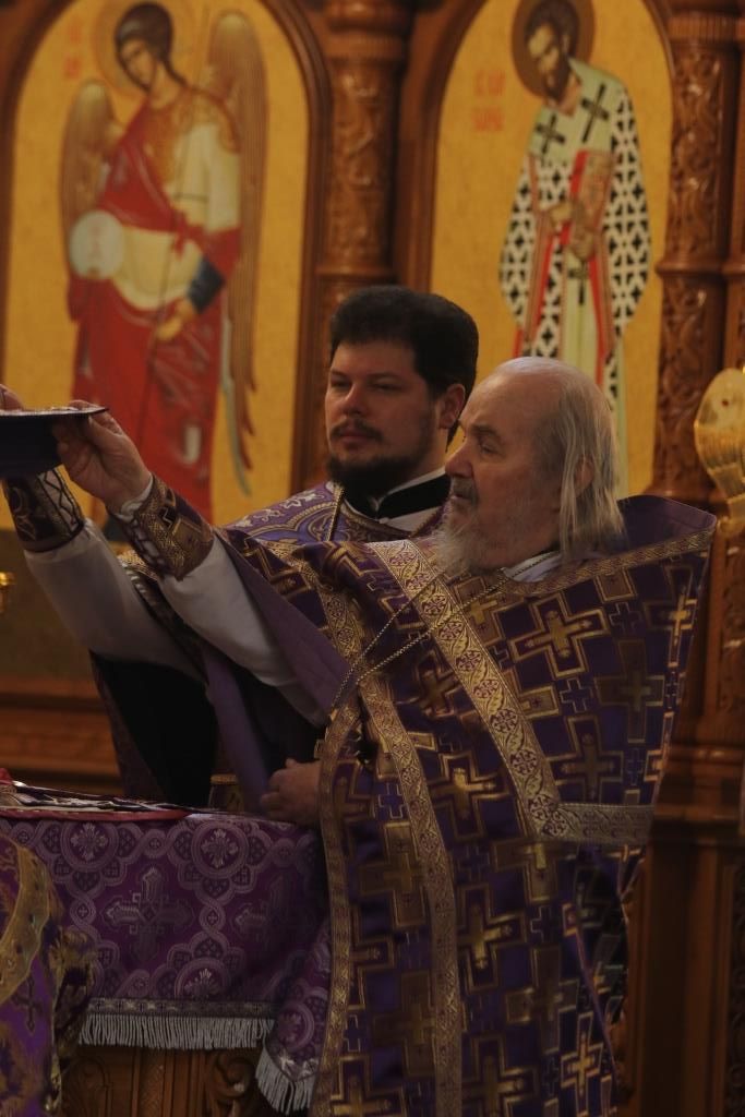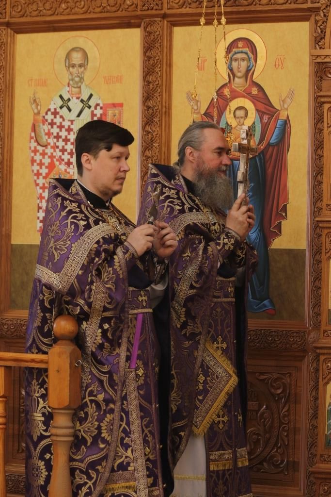 Его Преосвященству сослужили: духовник епархии архимандрит Спиридон (Теплухин), ключарь Андреевского собора иеромонах Никодим (Авдеев), клирики собора иеромонах Силуан (Магилёв) иерей Роман Подрезов, секретарь епархии диакон Илия Кван, протодиакон Георгий Засыпкин, протодиакон Андрей Дудник.
