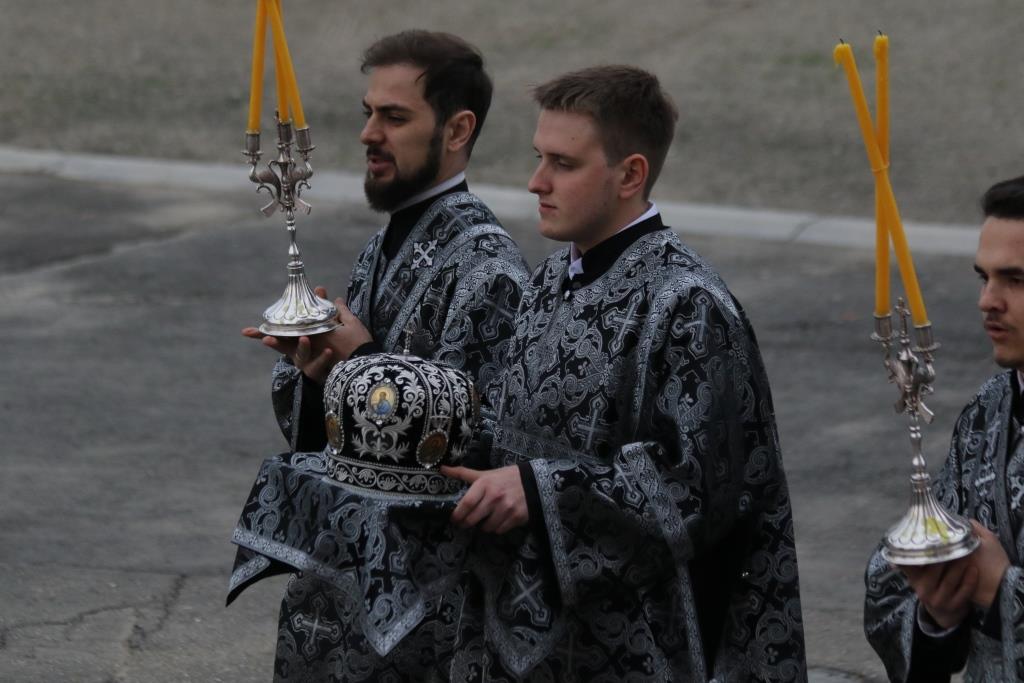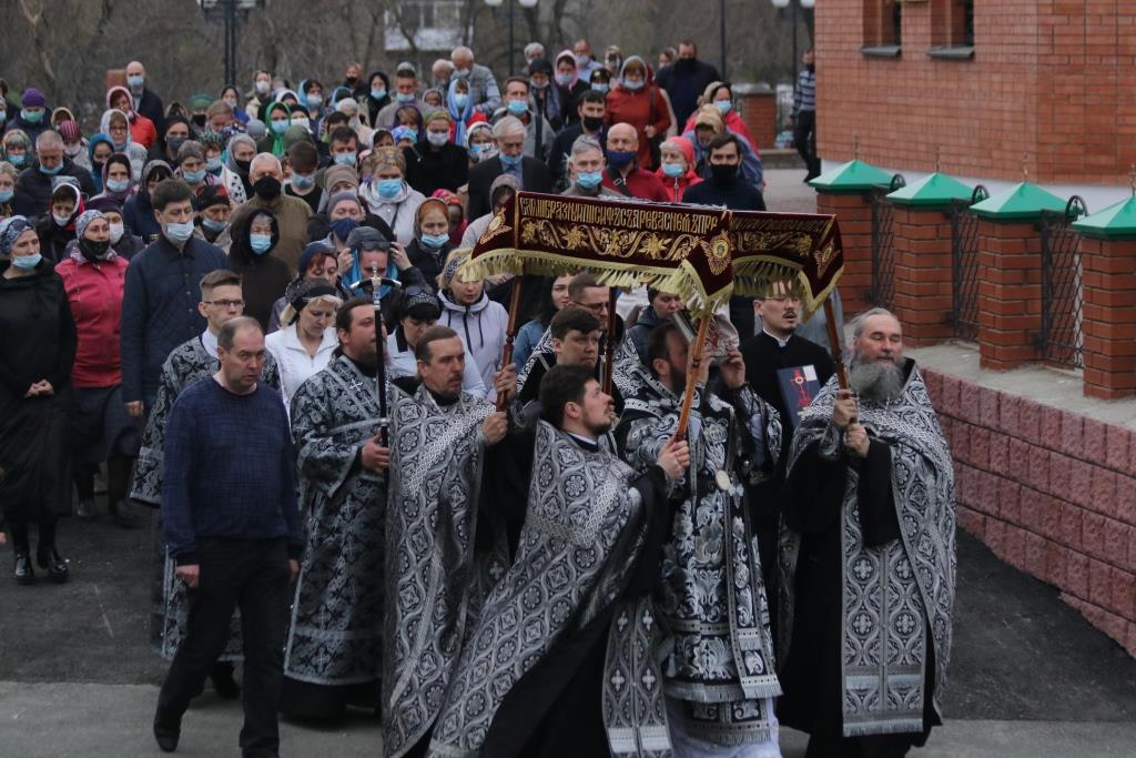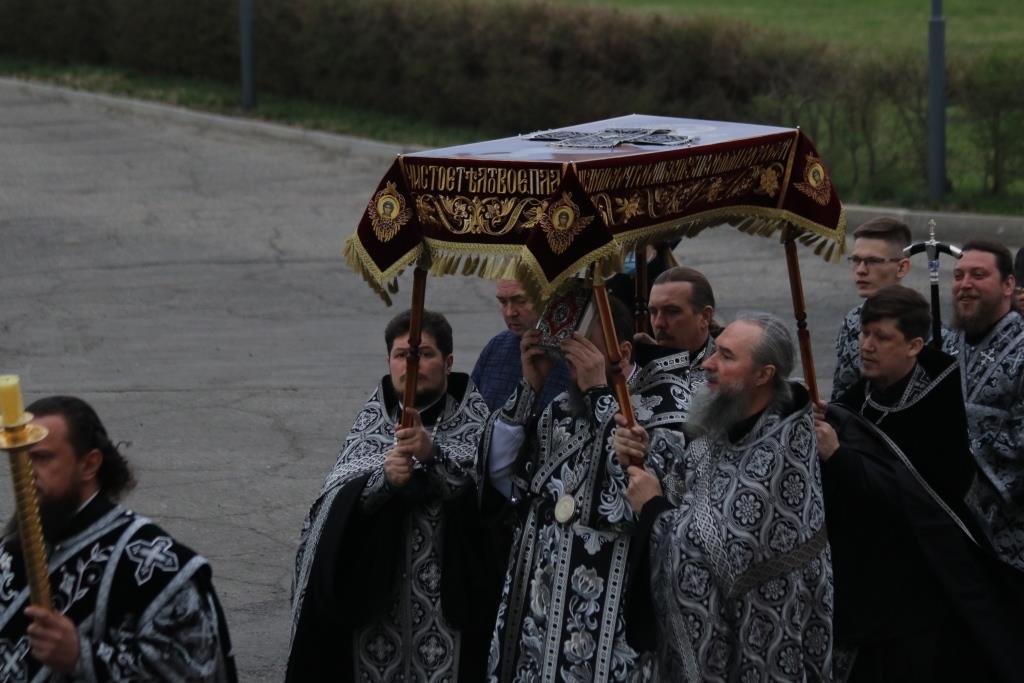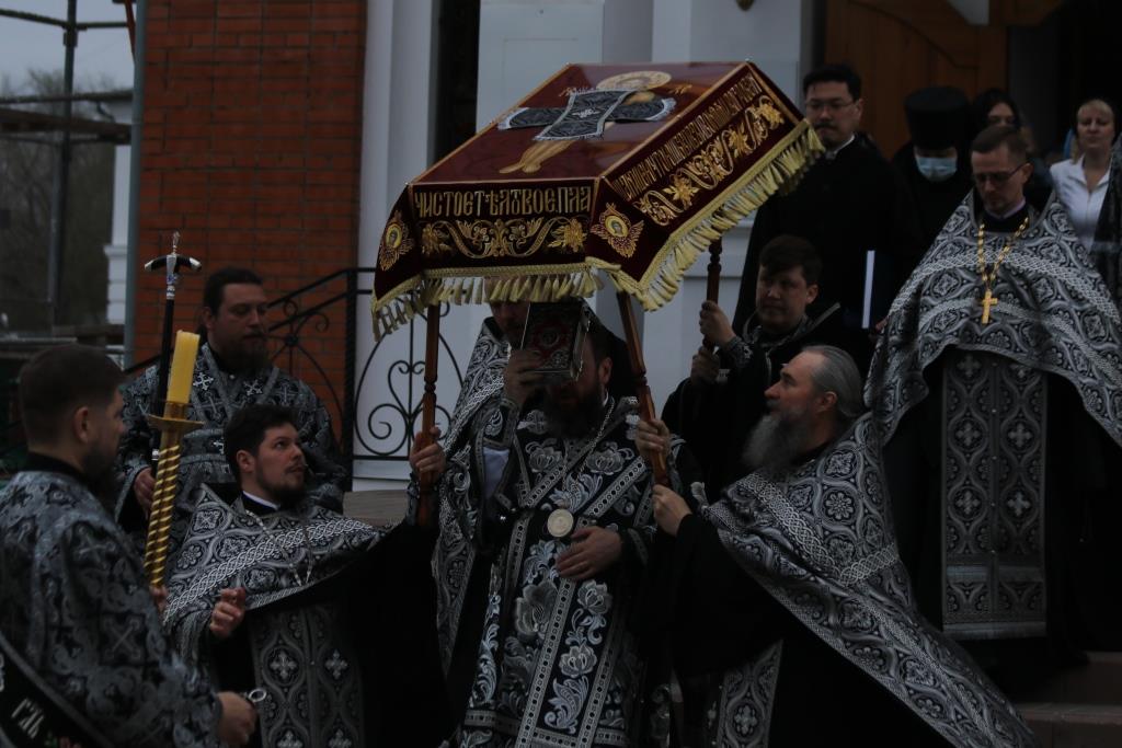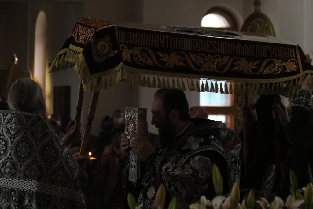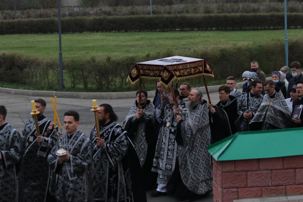 По окончании великого славословия с пением погребального песнопения «Святый Боже» Плащаница была обнесена вокруг храма крестным ходом.