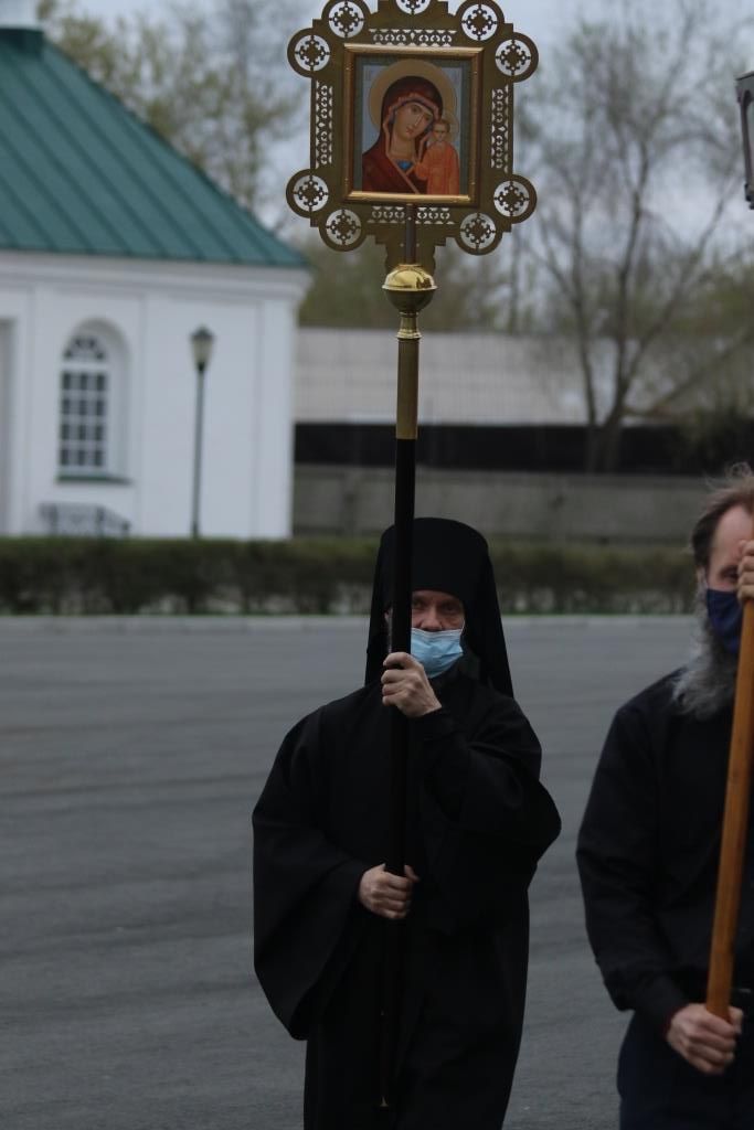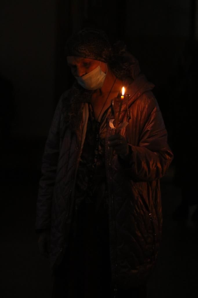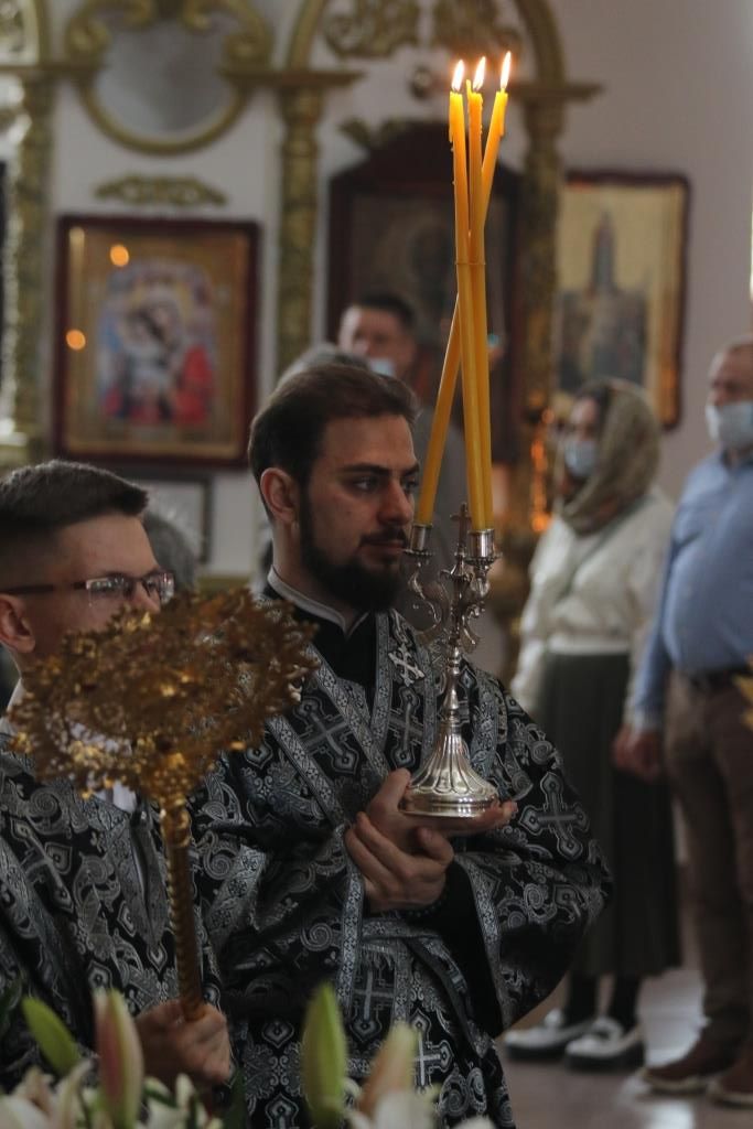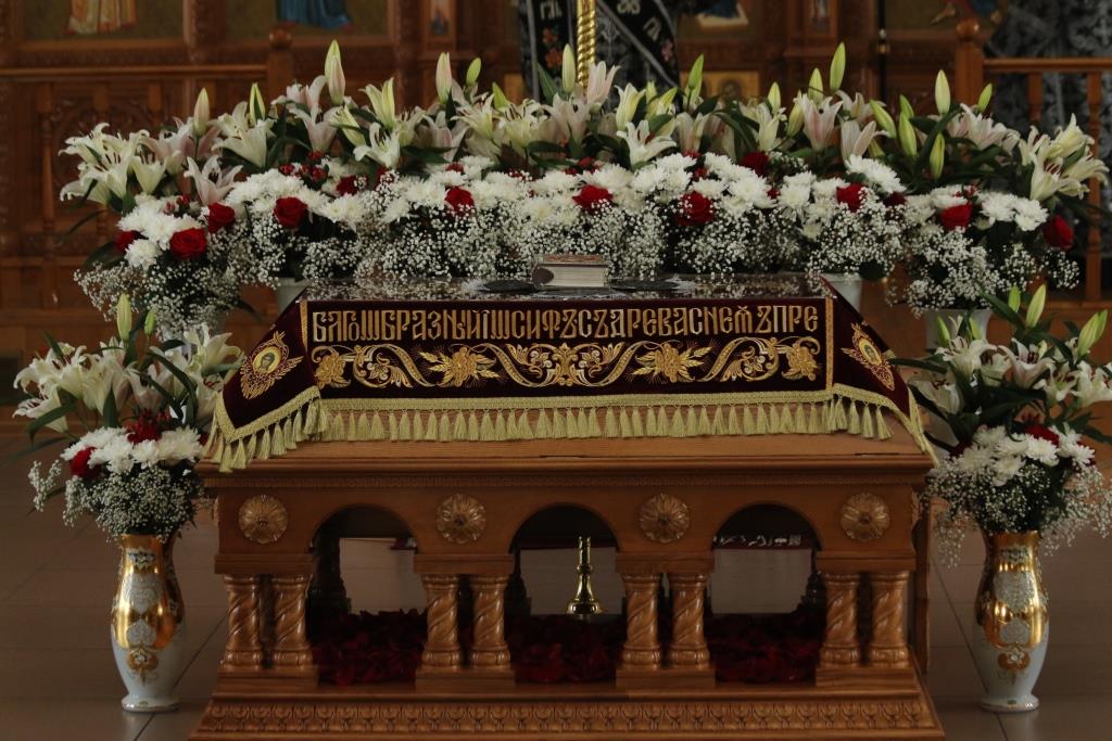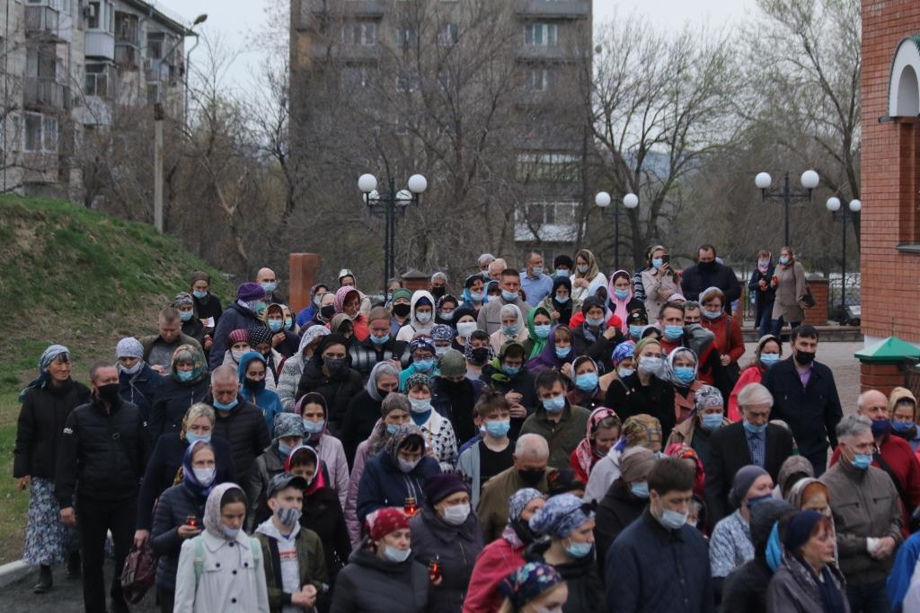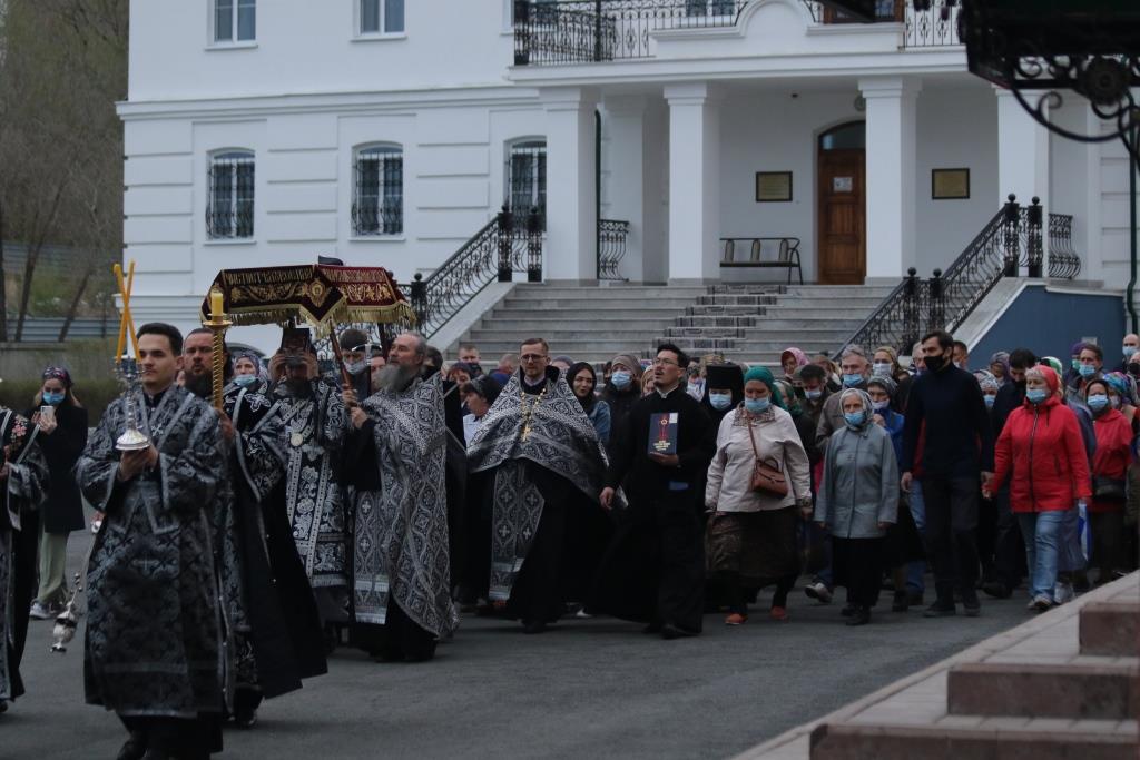 По окончании великого славословия с пением погребального песнопения «Святый Боже» Плащаница была обнесена вокруг храма крестным ходом.