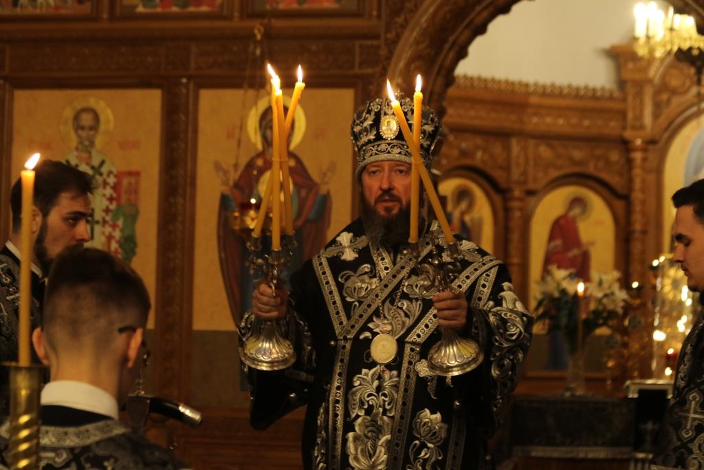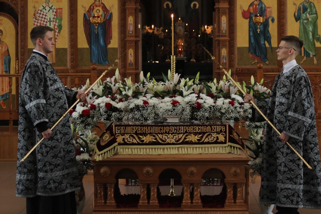 После пения тропарей на «Бог Господь» владыка Амфилохий прочитал перед Плащаницей Спасителя Непорочны, то есть стихи 17-й кафизмы, перемежающиеся краткими песнопениями о погребении Господа Иисуса Христа.