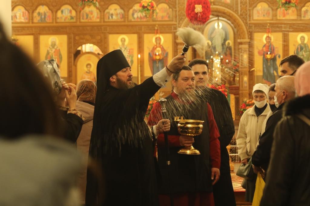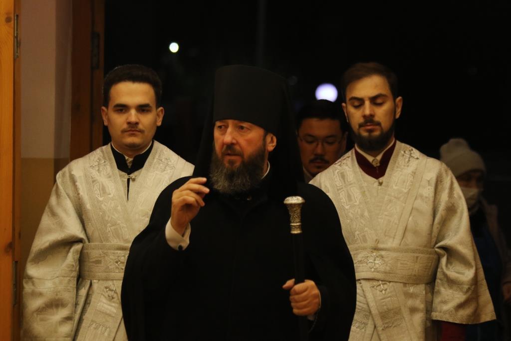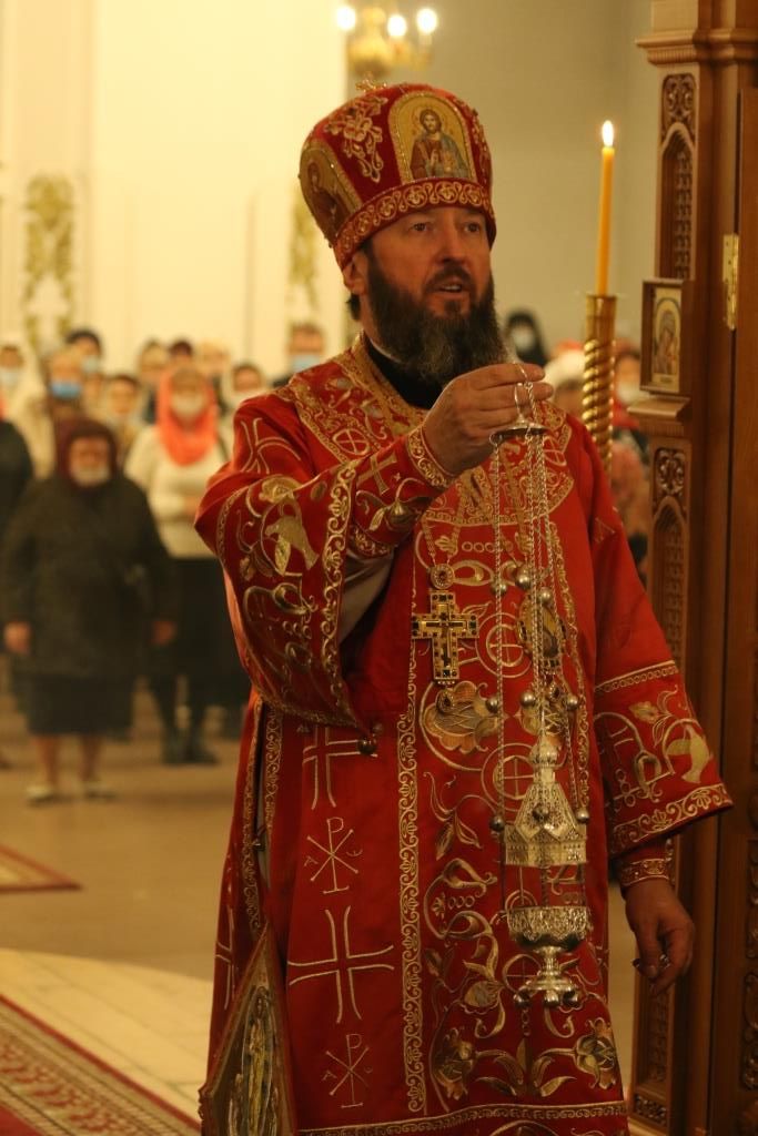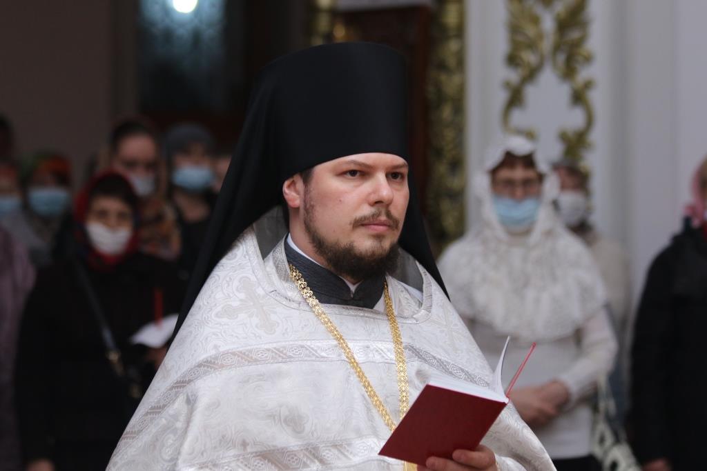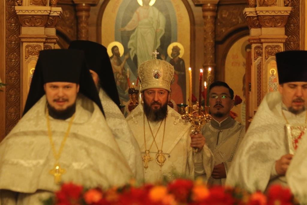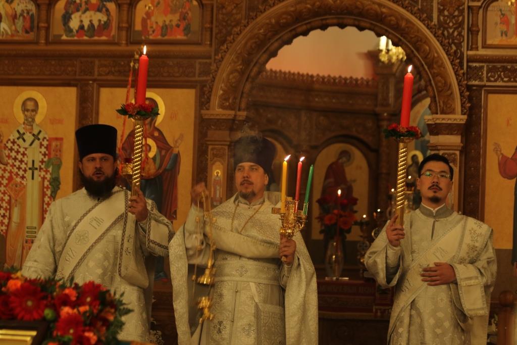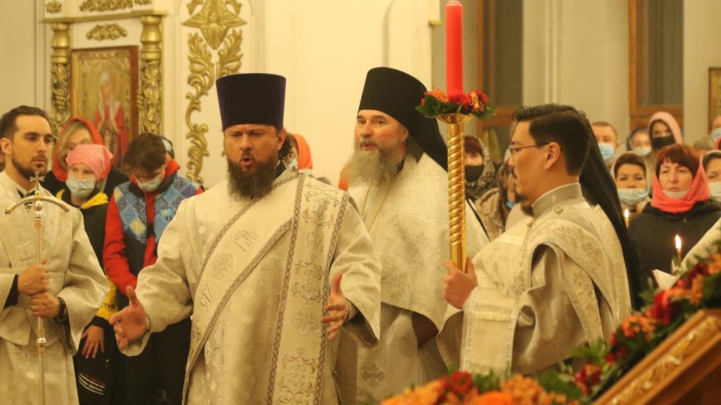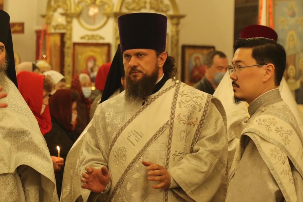 Его Преосвященству сослужили: духовник епархии архимандрит Спиридон (Теплухин), ключарь Андреевского собора иеромонах Никодим (Авдеев), клирики храма иерей Алексий Клепиков, иеромонах Силуан (Магилев), иерей Роман Подрезов, иерей Константин Дьяков, секретарь епархии диакон Илия Кван, протодиаконы Георгий Засыпкин и Андрей Дудник.
