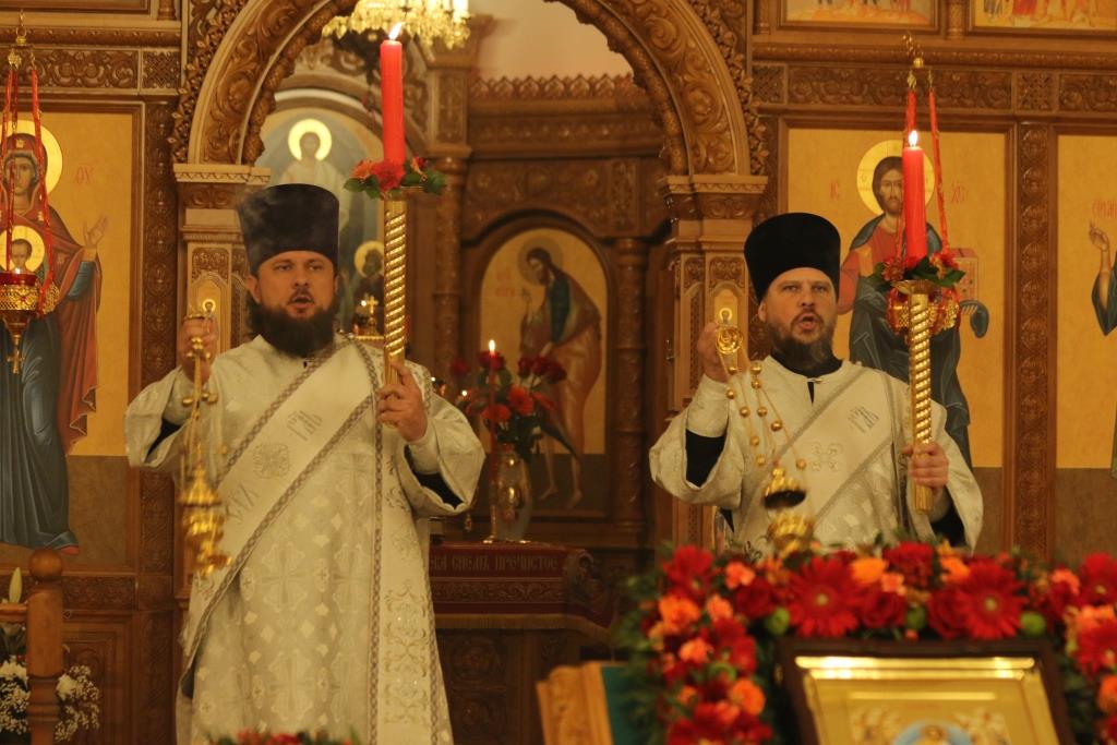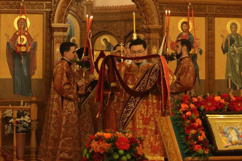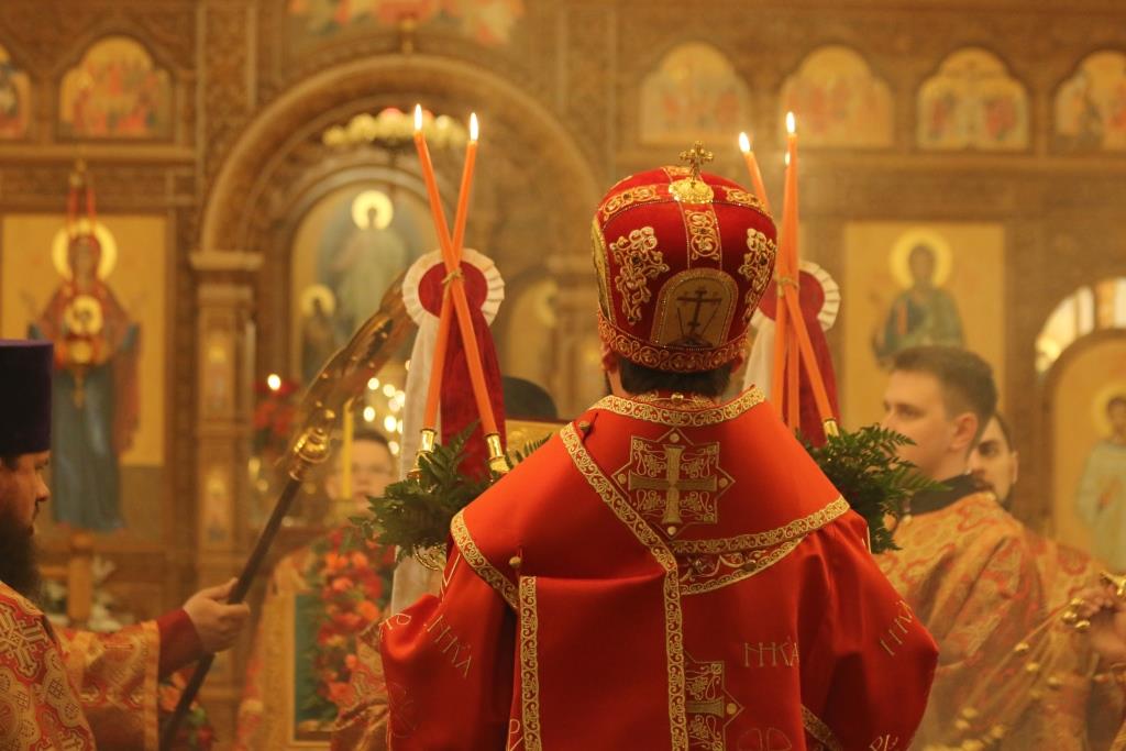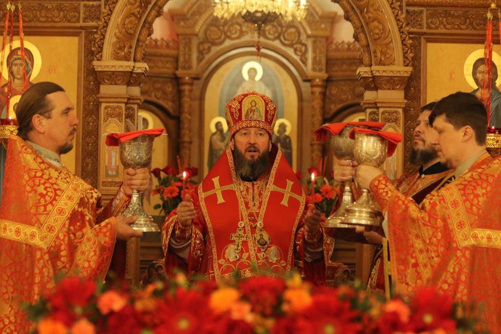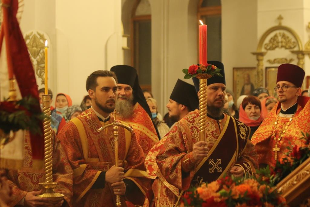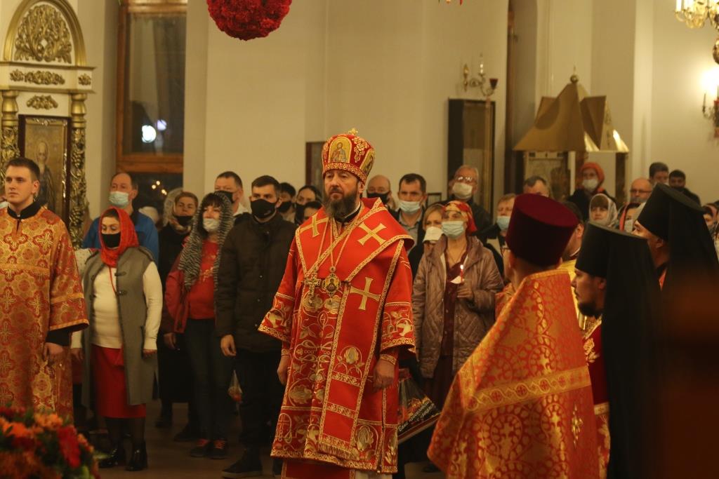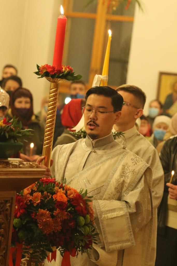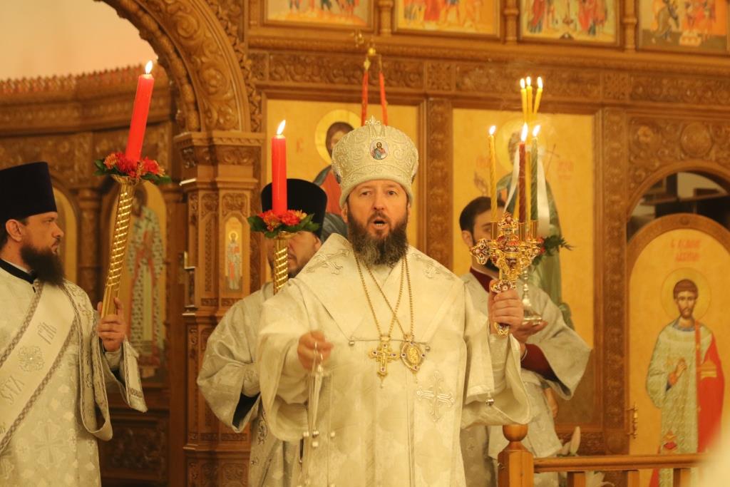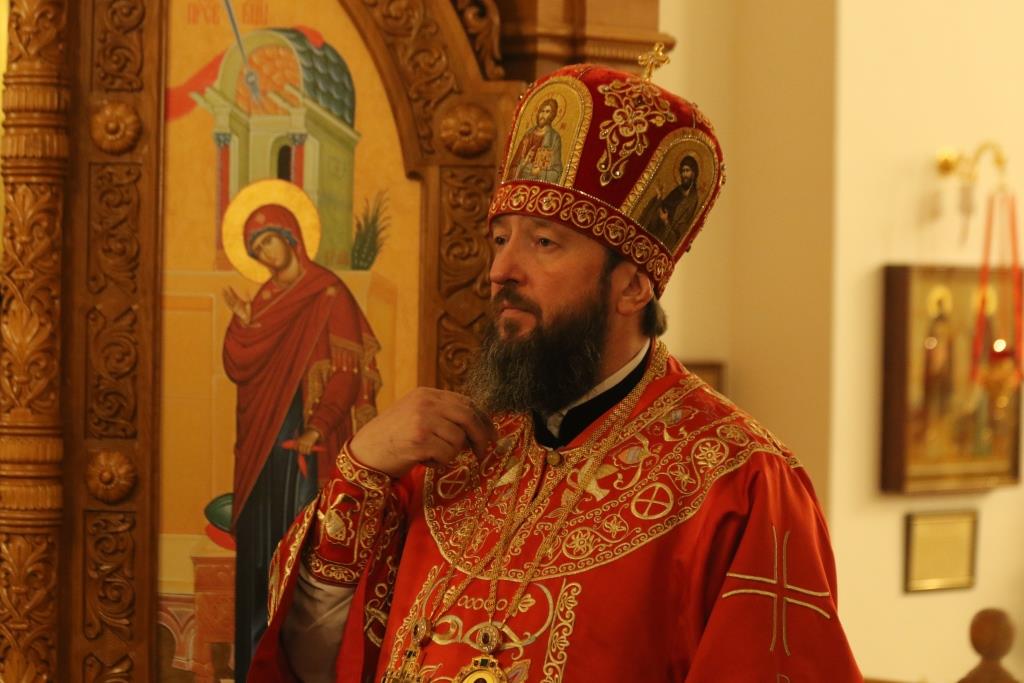 Его Преосвященству сослужили: духовник епархии архимандрит Спиридон (Теплухин), ключарь Андреевского собора иеромонах Никодим (Авдеев), клирики храма иерей Алексий Клепиков, иеромонах Силуан (Магилев), иерей Роман Подрезов, иерей Константин Дьяков, секретарь епархии диакон Илия Кван, протодиаконы Георгий Засыпкин и Андрей Дудник.