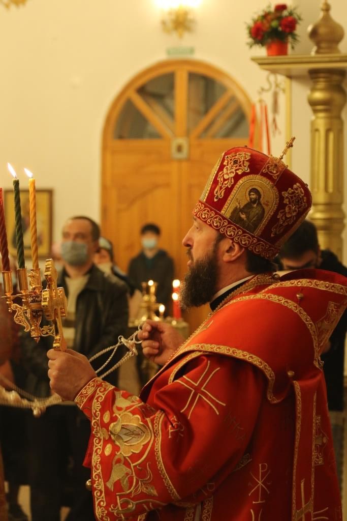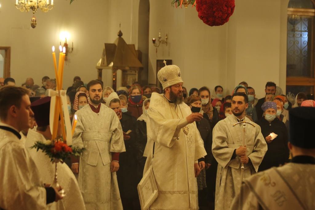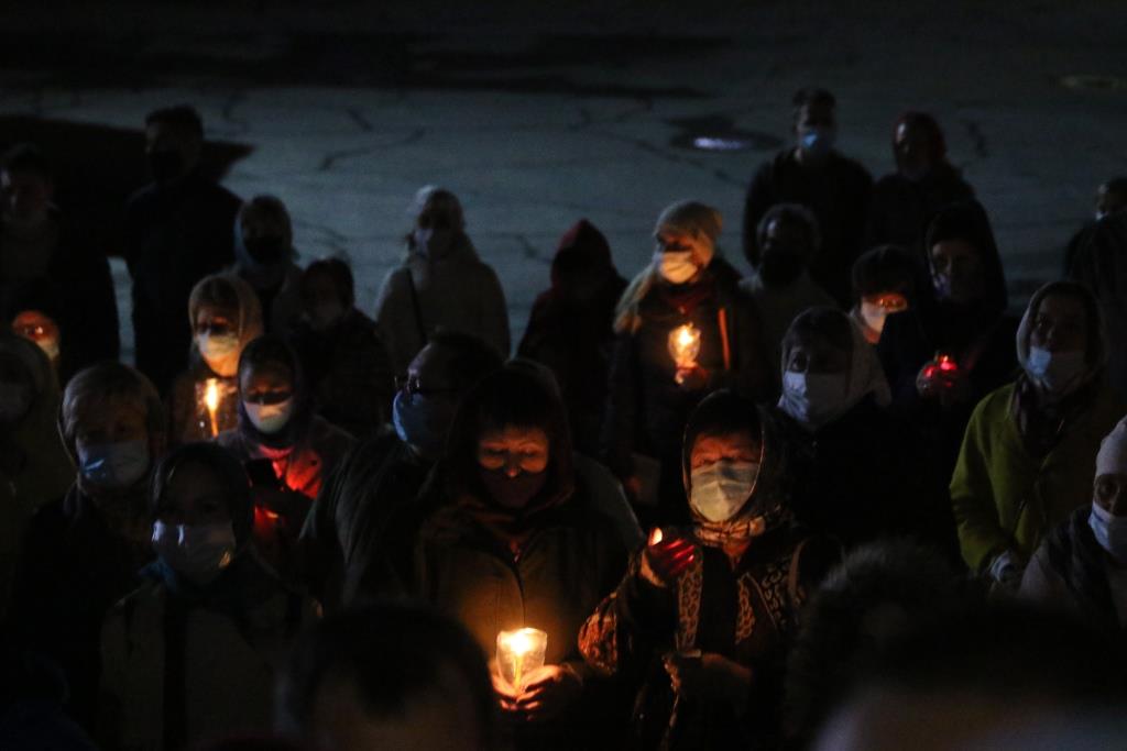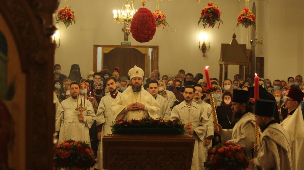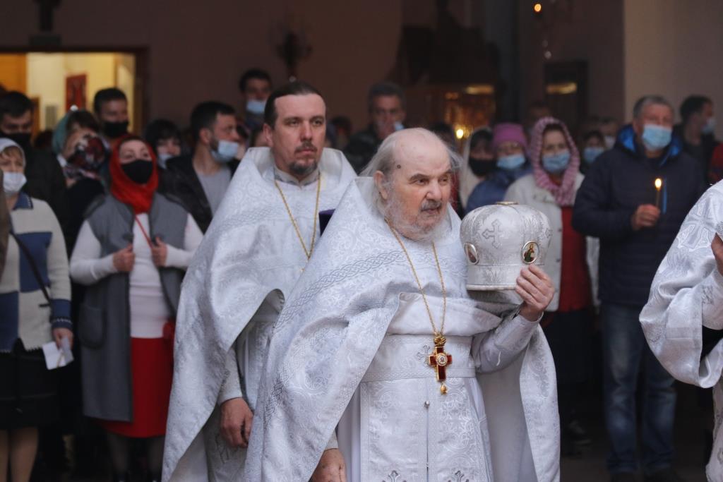В ночь с 1 на 2 мая 2021 года в кафедральном соборном храме апостола Андрея Первозванного в Усть-Каменогорске Преосвященнейший епископ Усть-Каменогорский и Семипалатинский Амфилохий совершил Пасхальные богослужения — полунощницу, крестный ход, Пасхальную заутреню и Божественную литургию святителя Иоанна Златоуста.