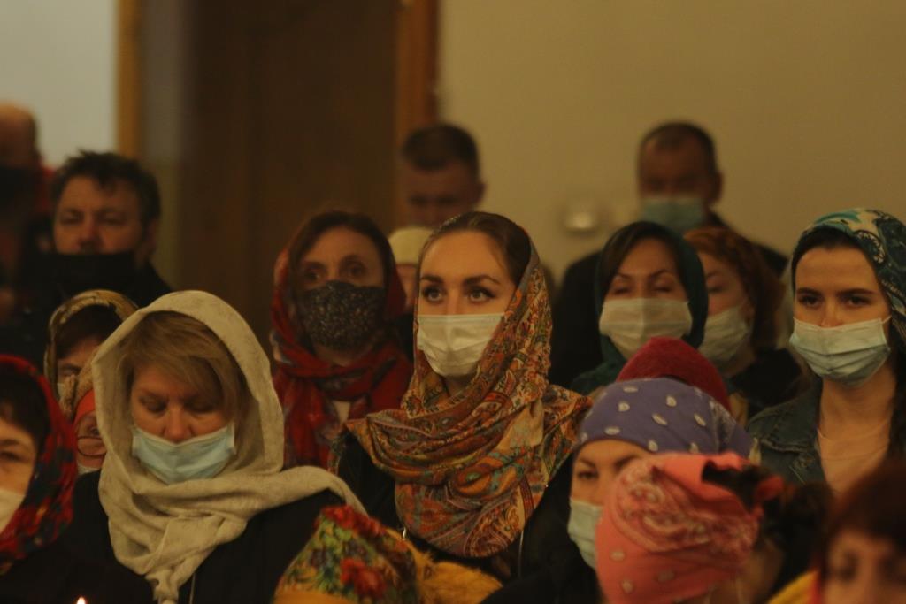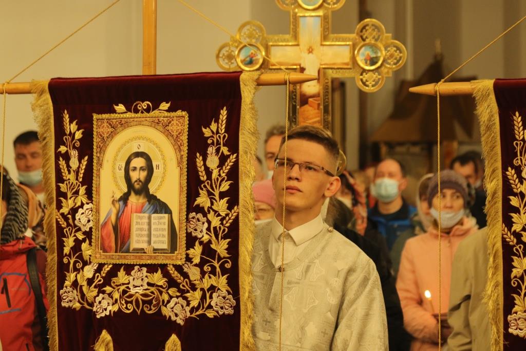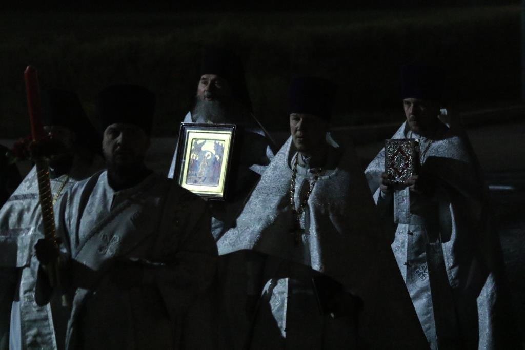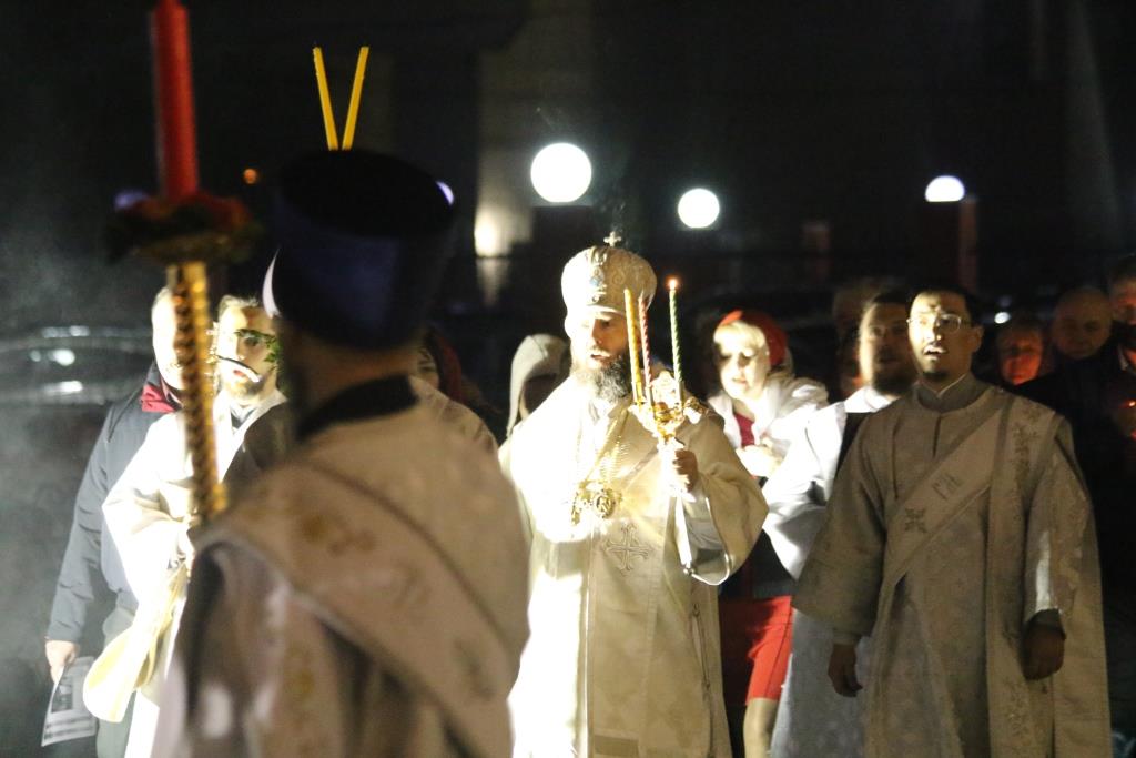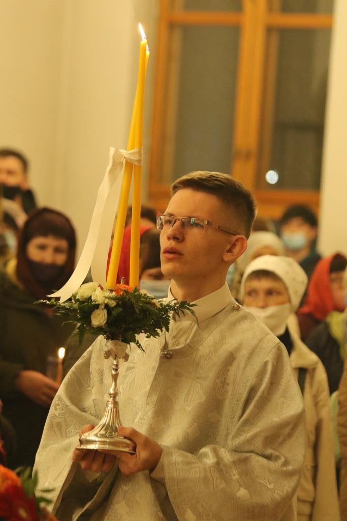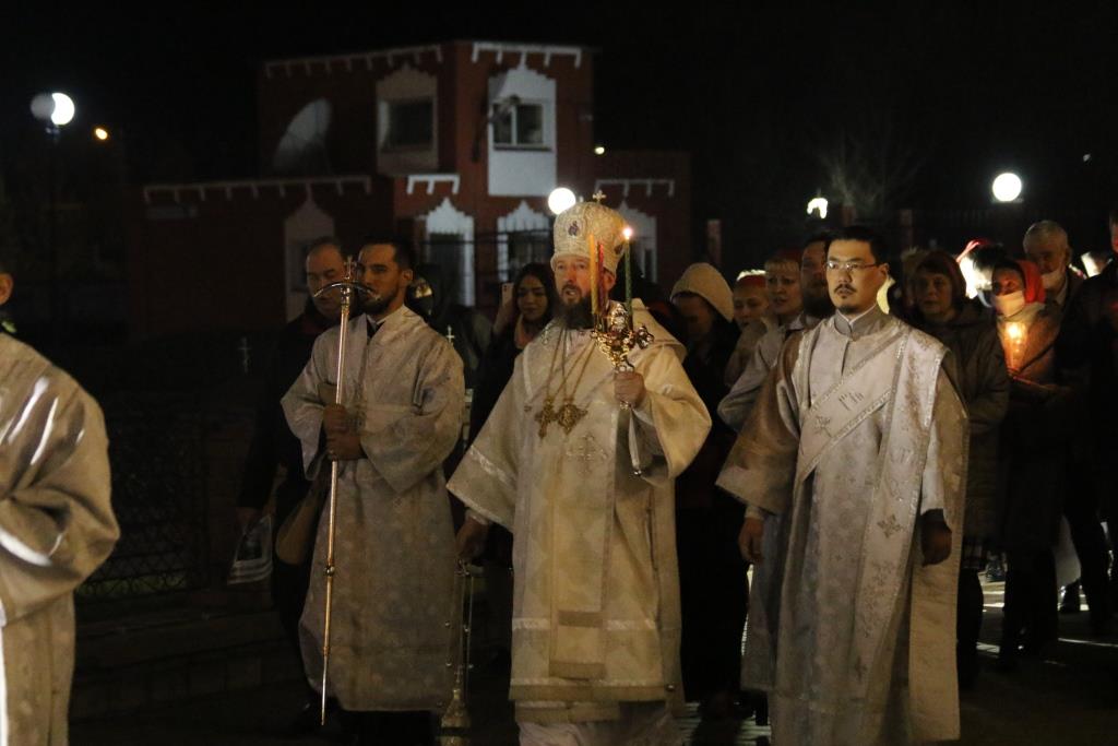 Ровно в полночь, под колокольный звон и пение стихиры «Воскресение Твое, Христе Спасе», был совершен крестный ход. Богослужение продолжилась пением пасхального канона. Пасхальные песнопения исполнял хор кафедрального собора под управлением В. Федоровой. За Богослужением Пасхи молились сотрудники епархиального управления, насельники Свято-Троицкого мужского монастыря, прихожане и паломники главного храма Восточного Казахстана.