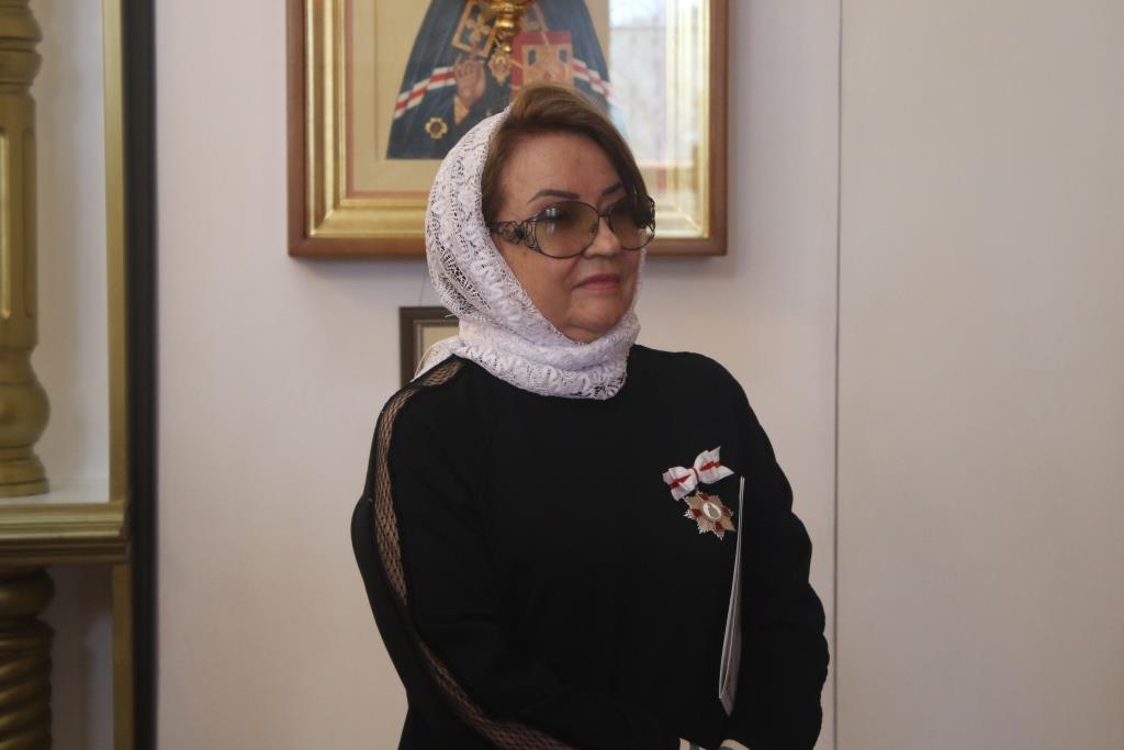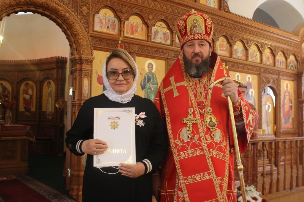 За богослужением епископ Амфилохий во внимание к многолетним трудам на благо общества и Церкви Христовой и в связи с юбилеем удостоил Председателя ОО «Ассоциация деловых женщин Казахстана по городу Усть-Каменогорску» Татьяну Ивановну Цветкову высокой награды – ордена Православной Церкви Казахстана во имя святых мучениц Веры, Надежды, Любови и матери их Софии.