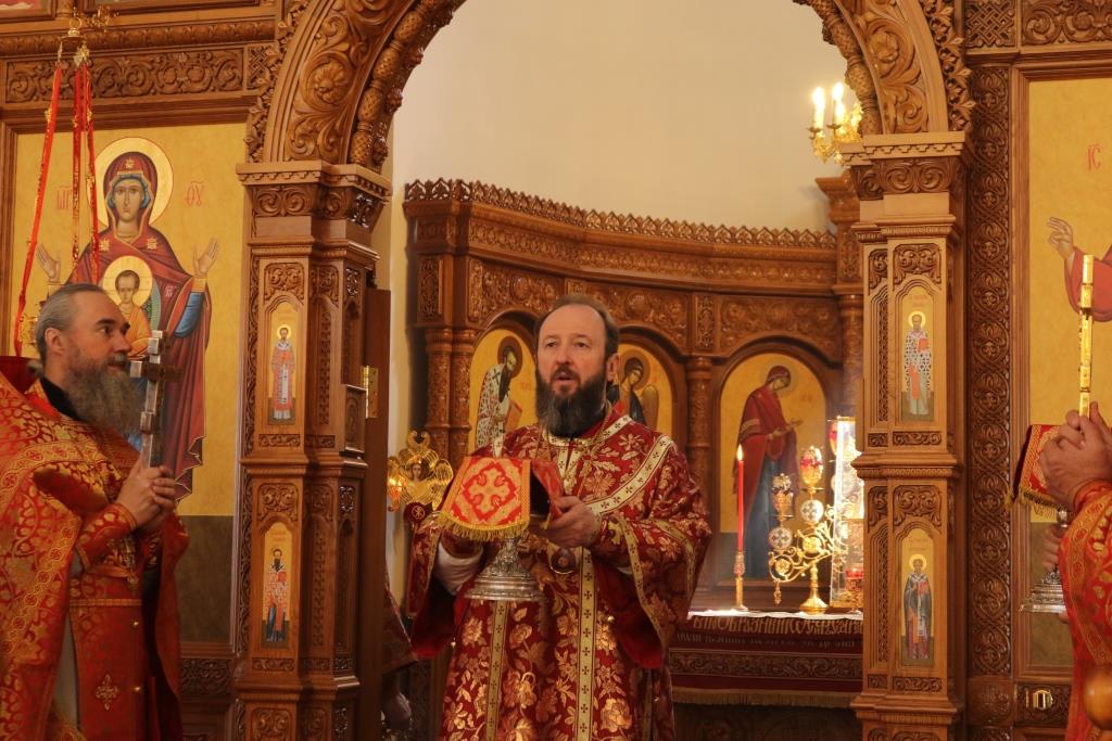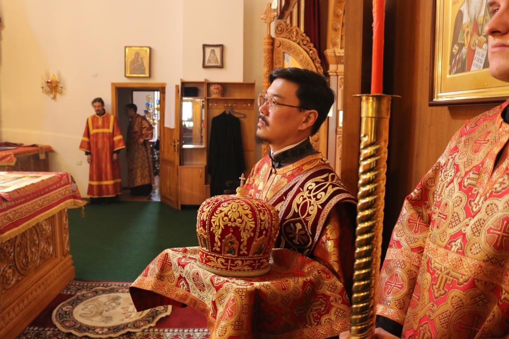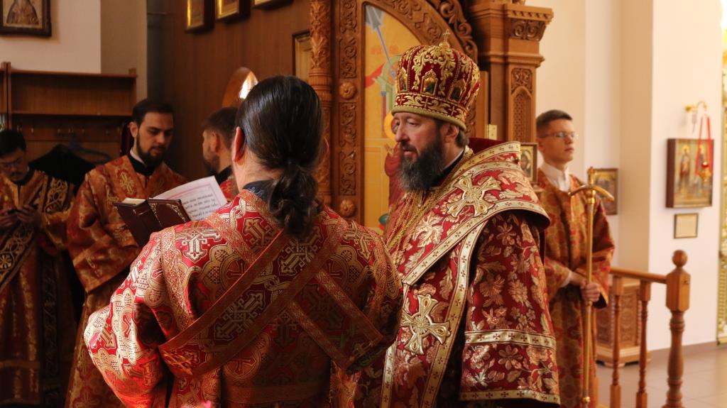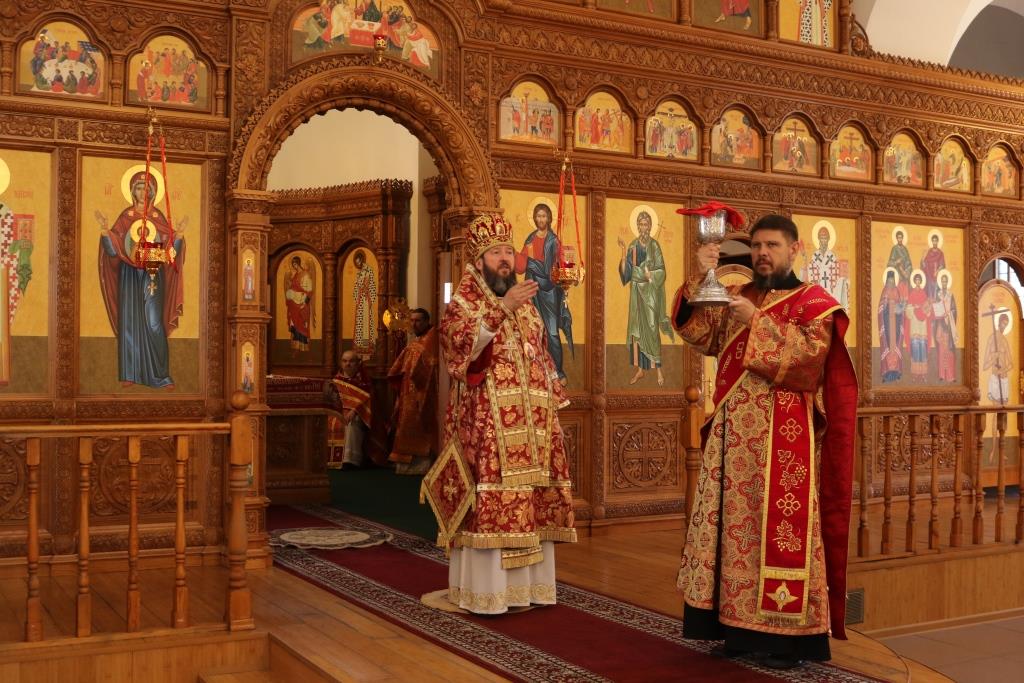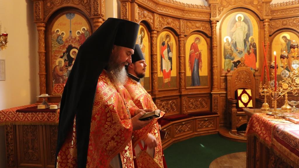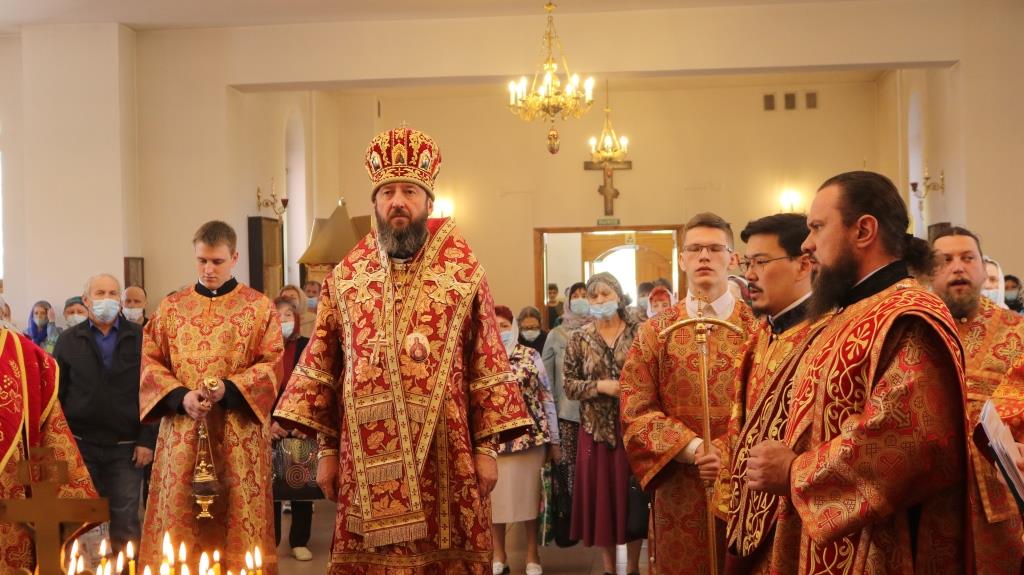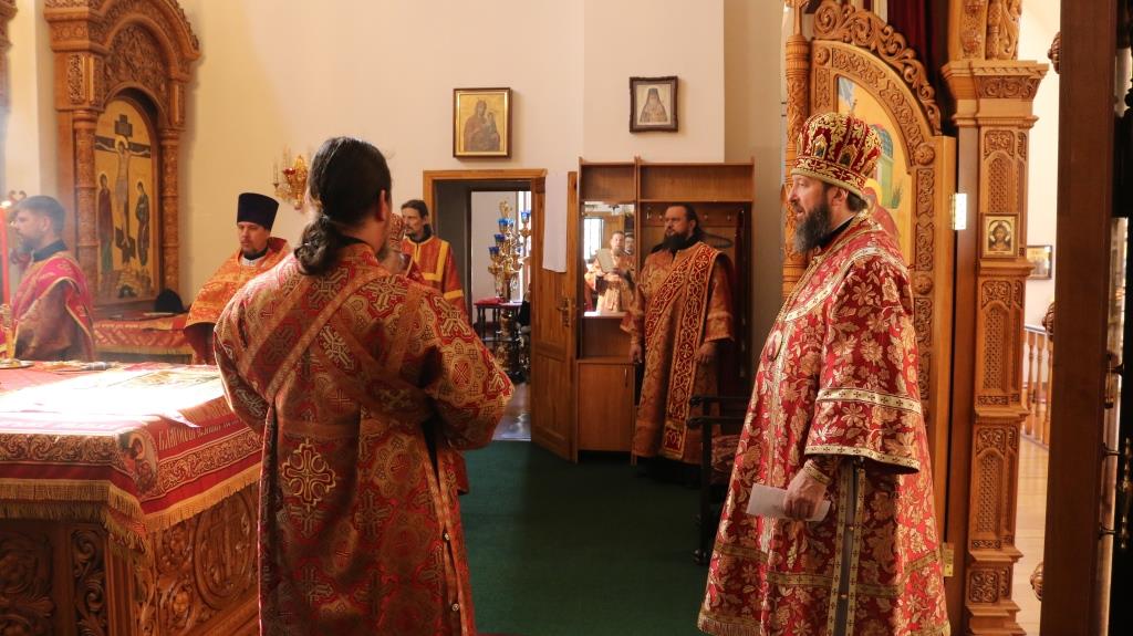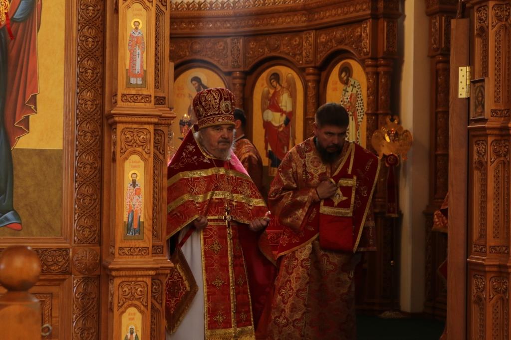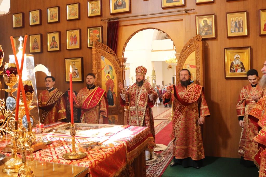 За богослужением молились прихожане Андреевского собора, сотрудники епархиального управления и насельники Свято-Троицкого мужского монастыря города Усть-Каменогорска. Хор под управлением регента Н. Романцовой исполнял песнопения Божественной Литургии. На запричастном стихе проповедовал иеромонах Силуан (Магилев).
