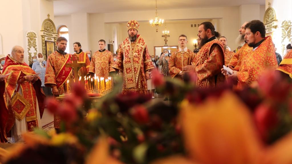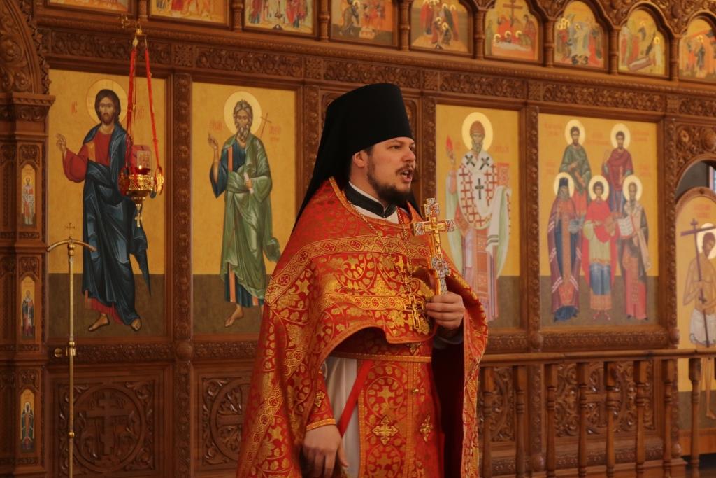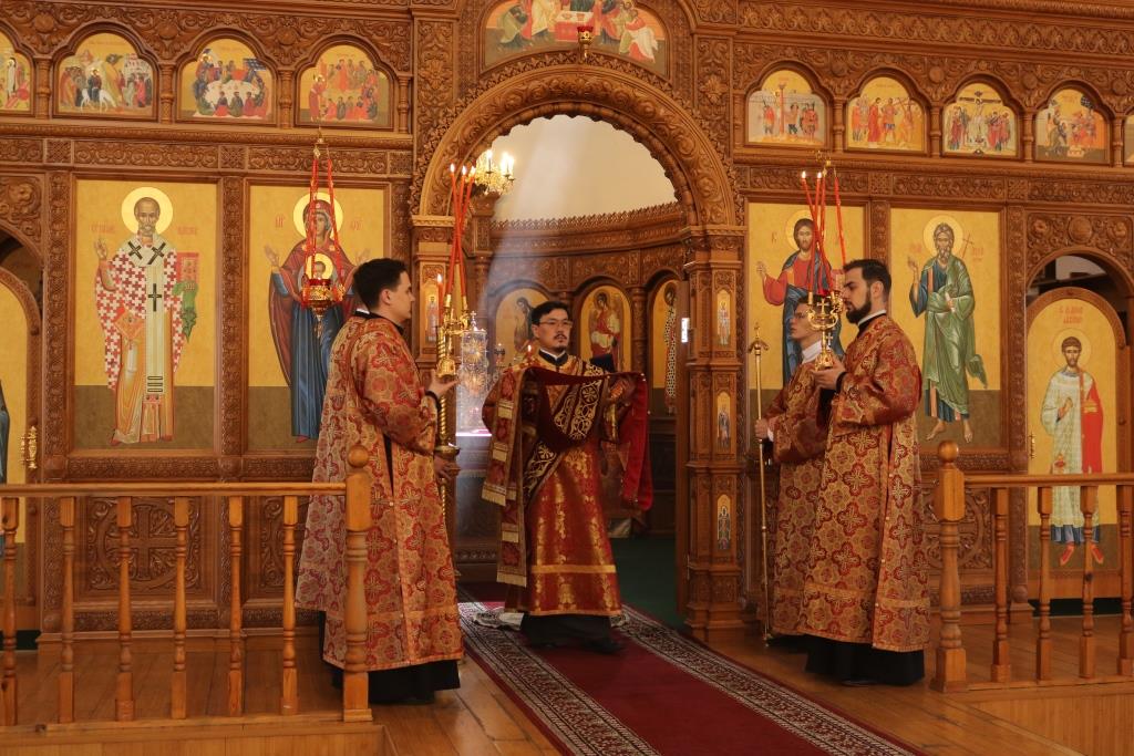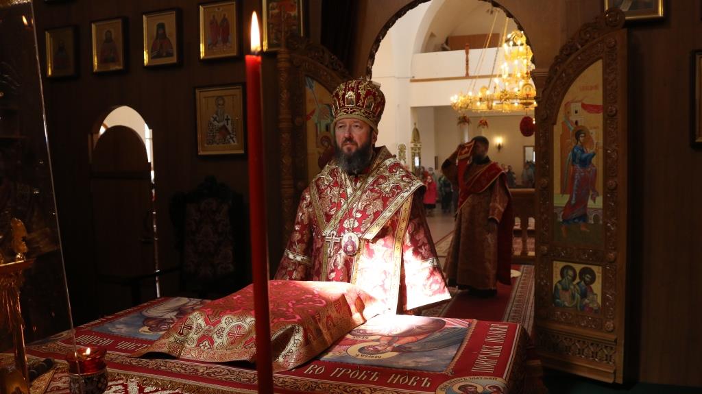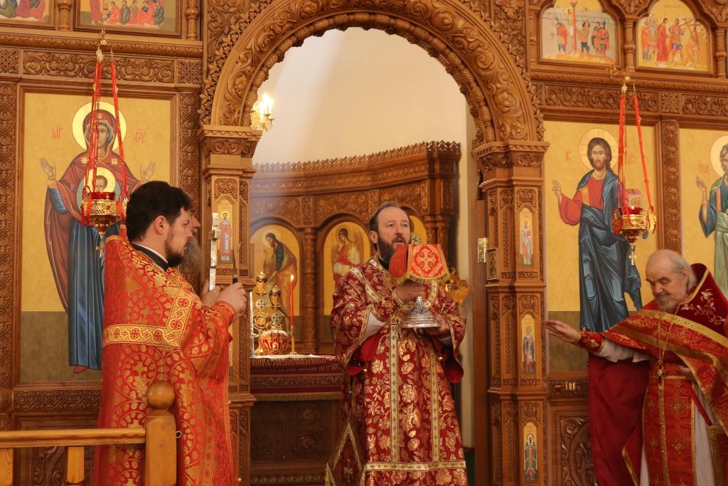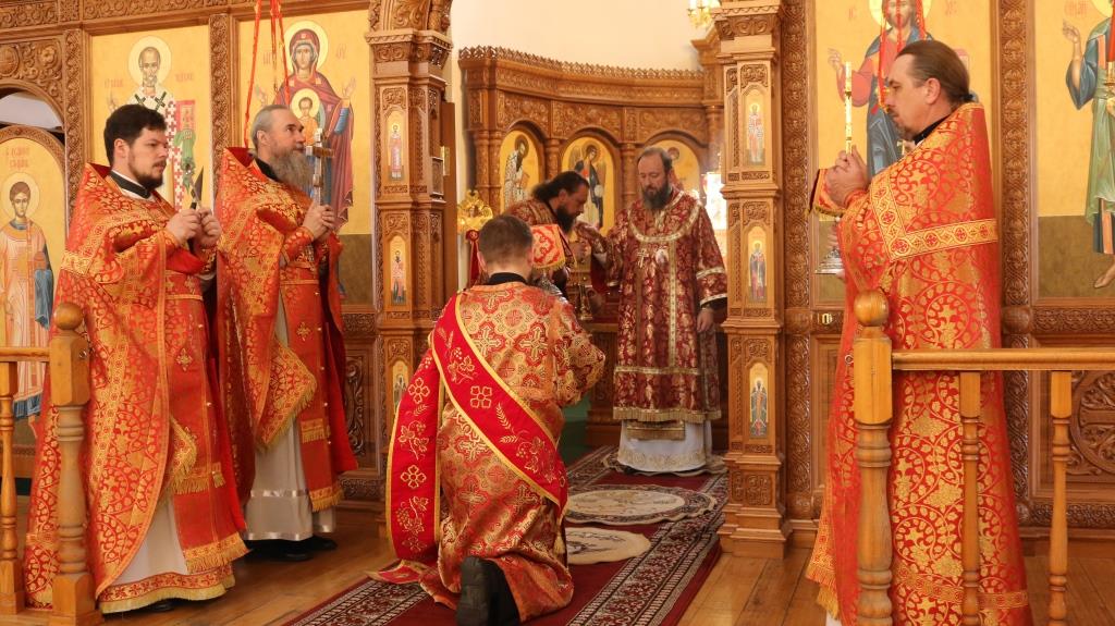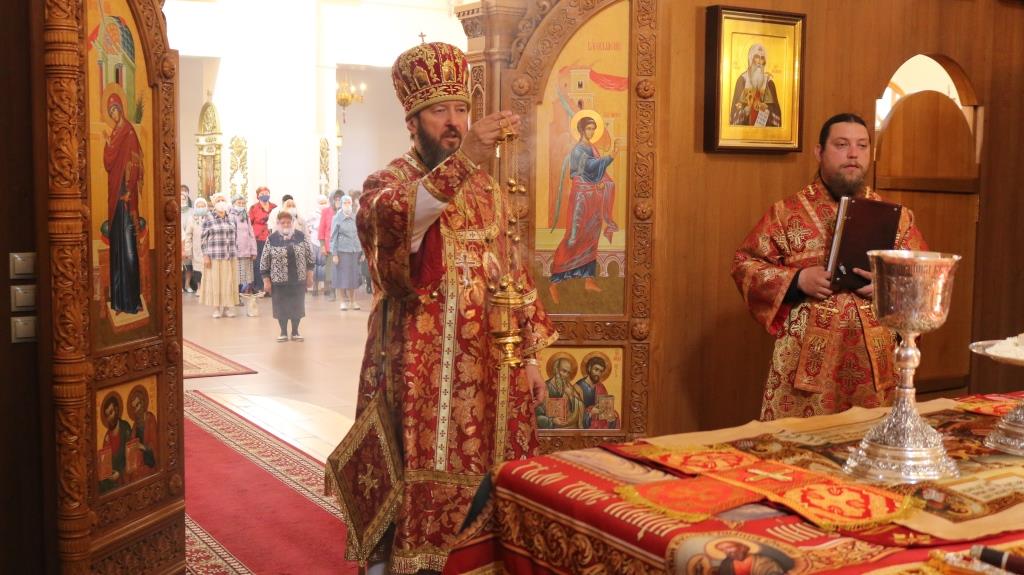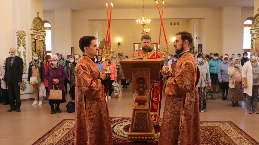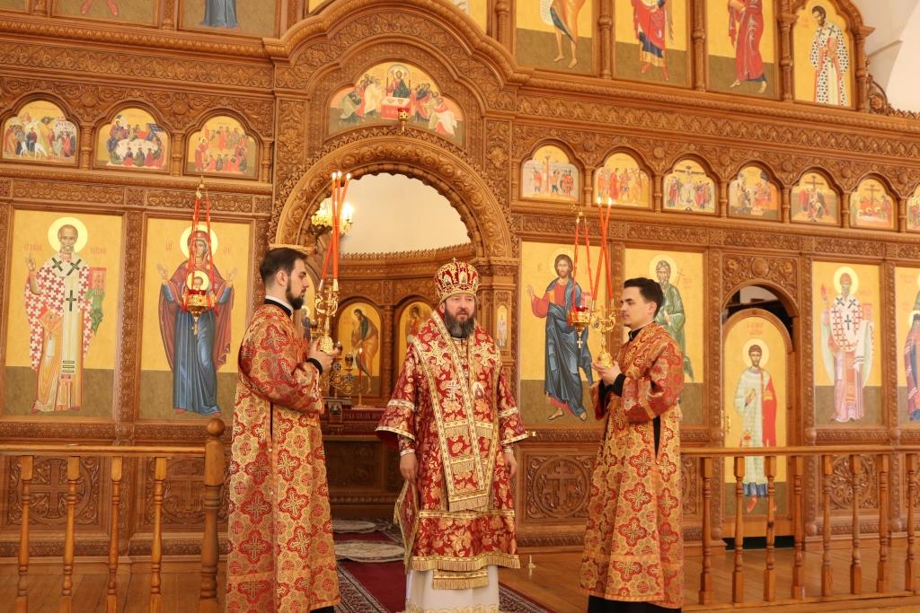 За богослужением молились прихожане Андреевского собора, сотрудники епархиального управления и насельники Свято-Троицкого мужского монастыря города Усть-Каменогорска. Хор под управлением регента Н. Романцовой исполнял песнопения Божественной Литургии. На запричастном стихе проповедовал иеромонах Силуан (Магилев).