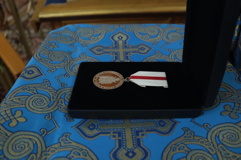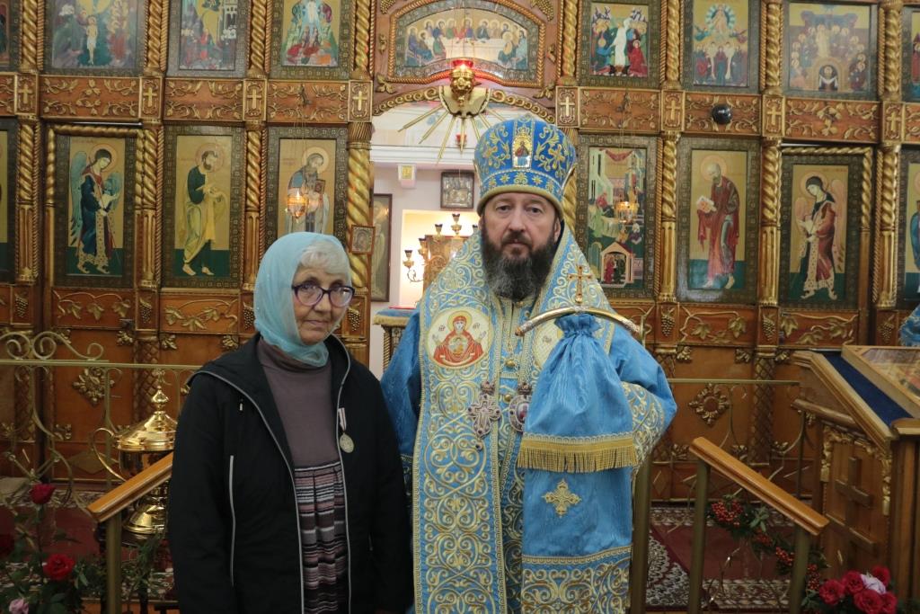 После богослужения епископ Амфилохий в ознаменование многолетних миссионерских трудов наградил медалью святых мучениц Веры, Надежды, Любви и матери их Софии прихожанку храма Надежду Васильевну Зенкову.
