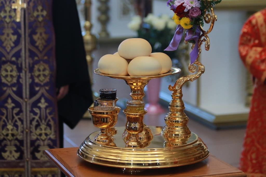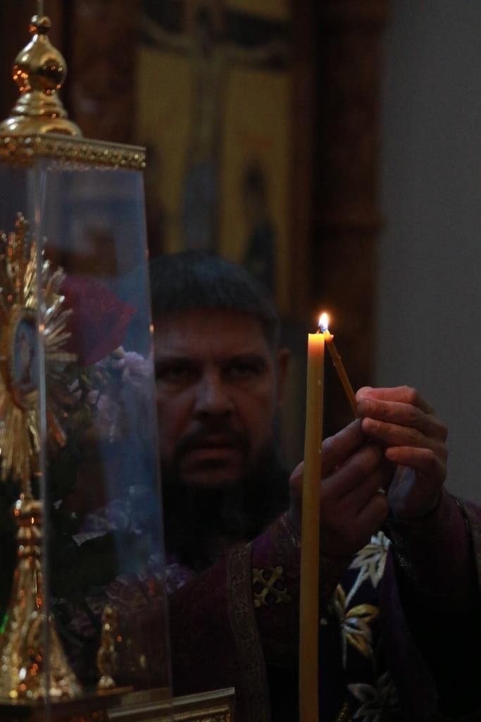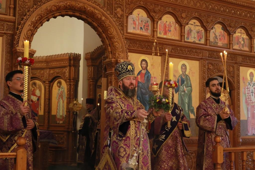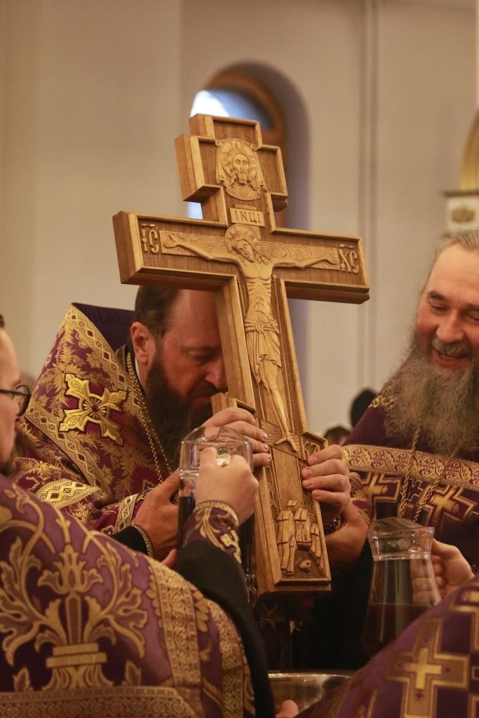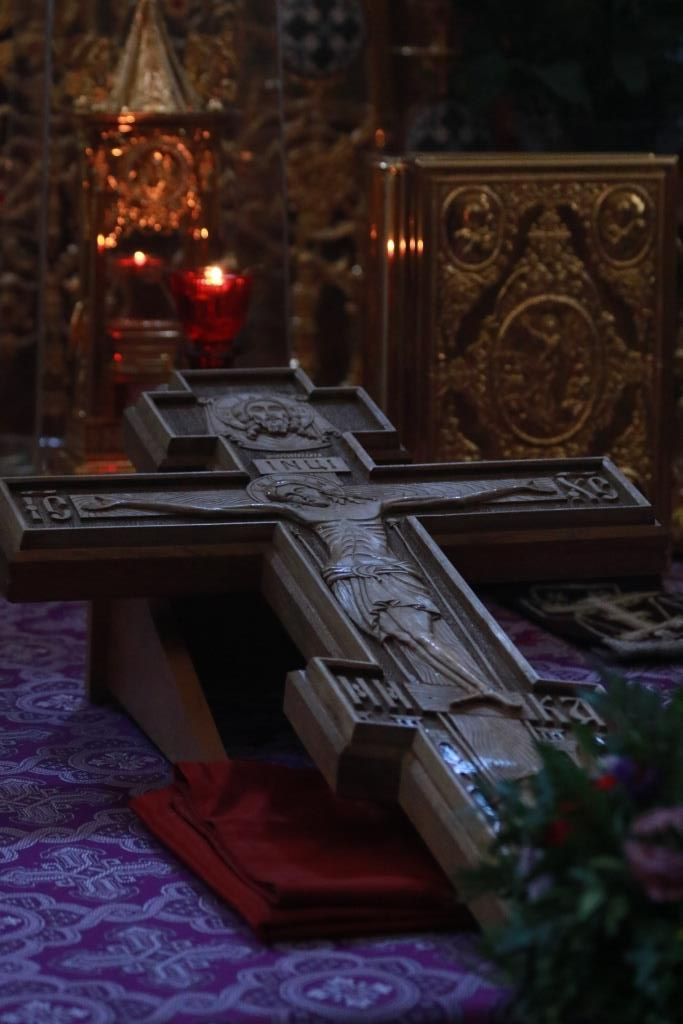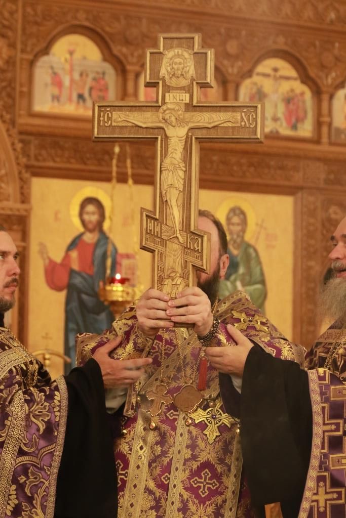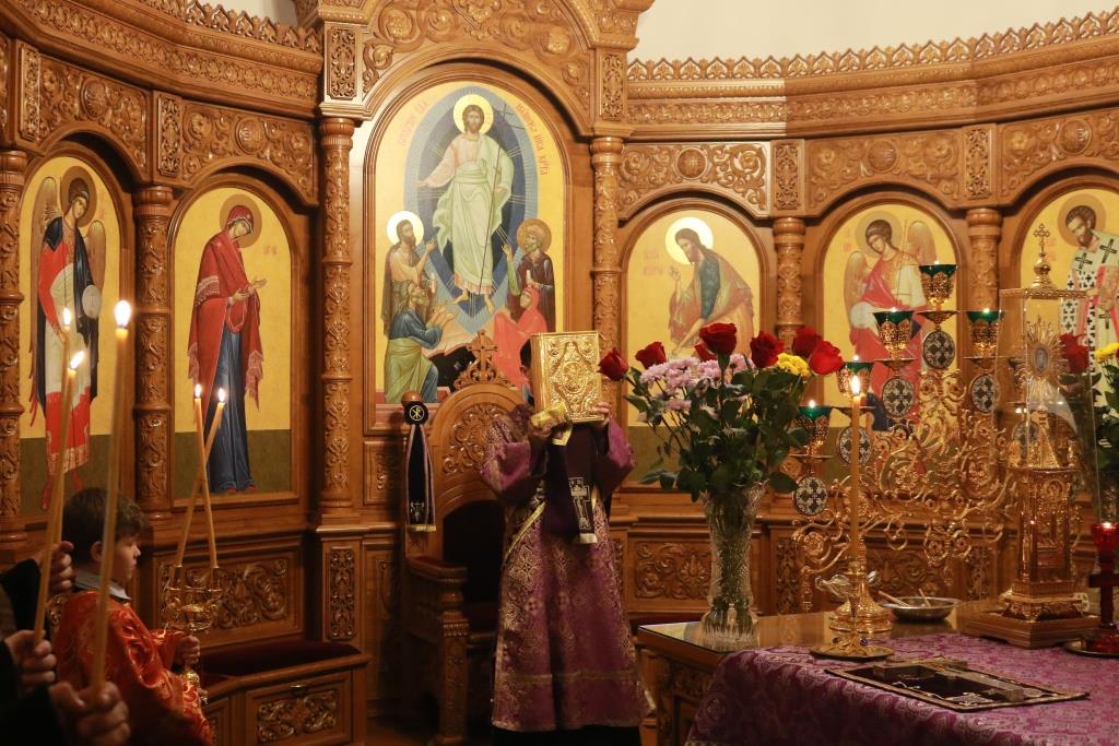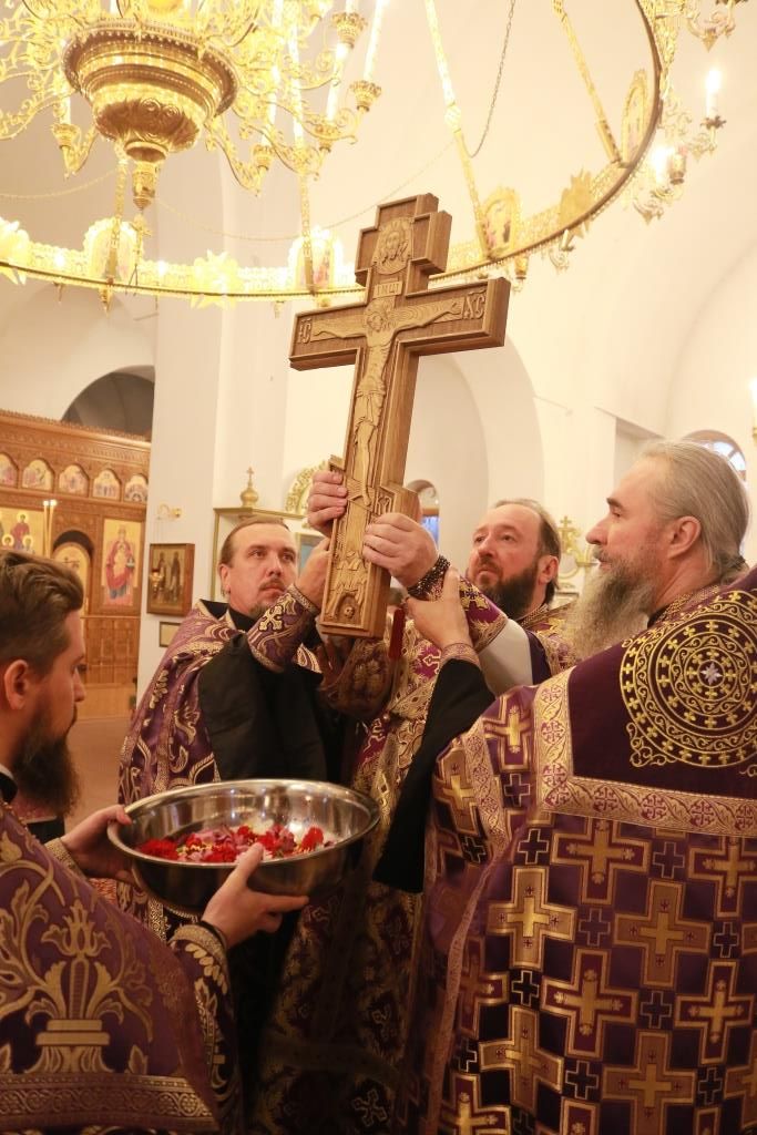 По уставу, полиелей совершался в алтаре. После великого славословия епископ Амфилохий совершил чин Воздвижения Креста. Воздвижение Креста совершается пять раз: на восток, на запад, на юг, на север, и в заключительный раз – вновь на восток. Каждое воздвижение сопровождается особым диаконским прошением. Воздвигаемый Крест, по древней традиции, священники омывают особым составом из благоуханного масла, вина и воды. После чина воздвижения Архипастырь помазал духовенство и прихожан освященным елеем.