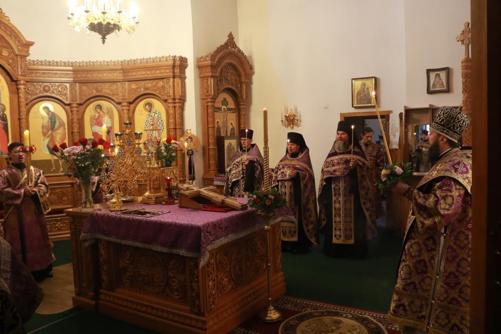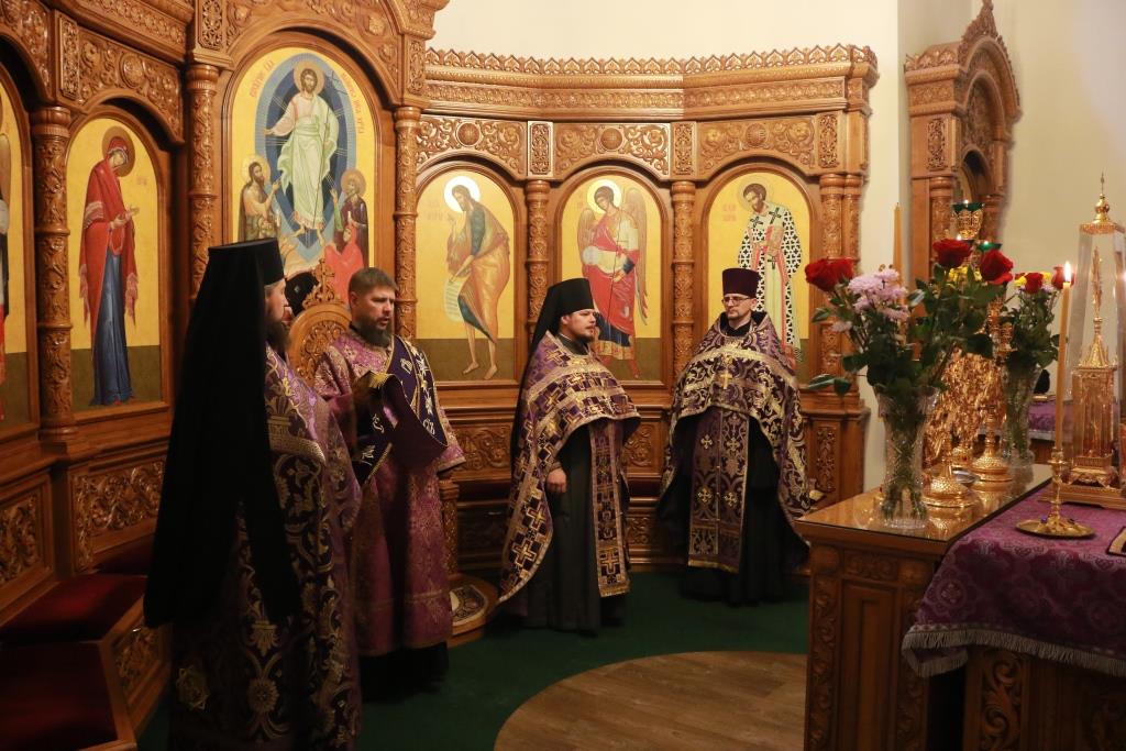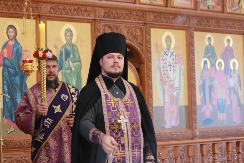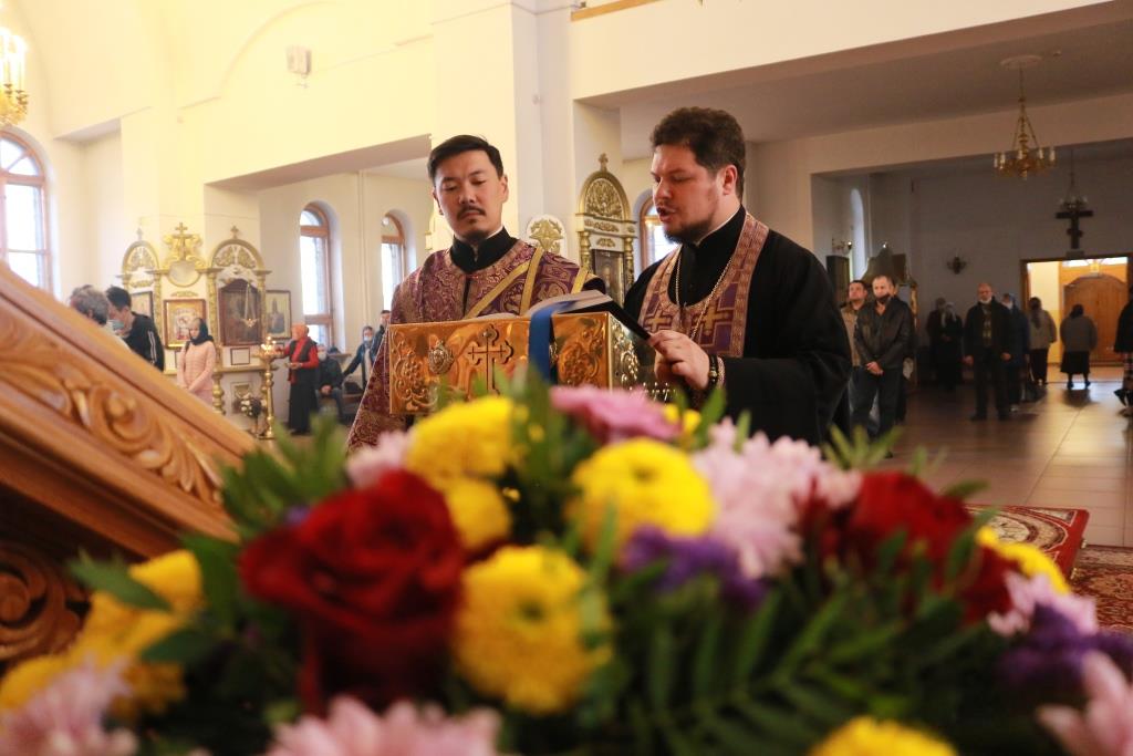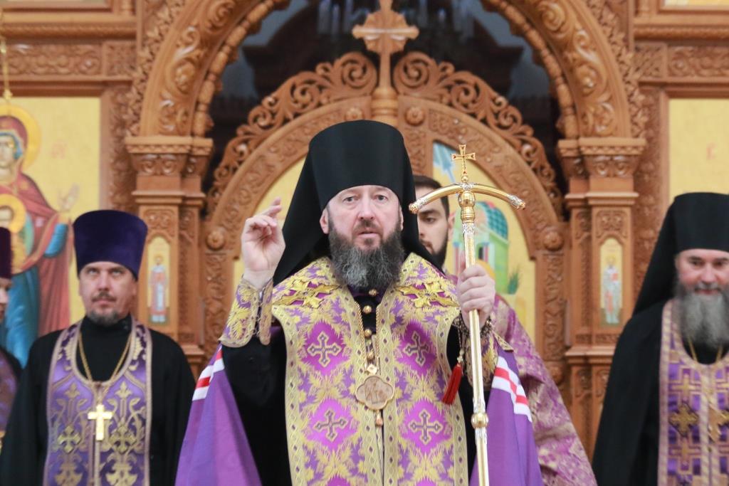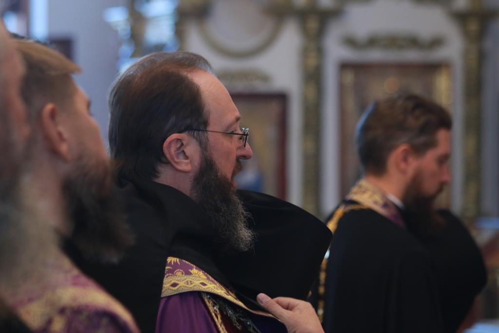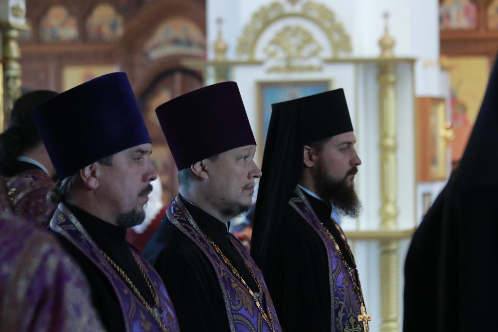 Владыке епископу сослужили ключарь собора иеромонах Никодим (Авдеев), клирики собора иерей Алексий Клепиков, иеромонах Силуан (Магилев), иерей Роман Подрезов, иерей Константин Дьяков, иеромонах Мефодий (Шевчук), секретарь епархии диакон Илия Кван и протодиакон Георгий Засыпкин.