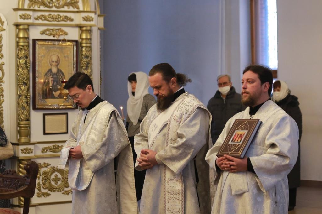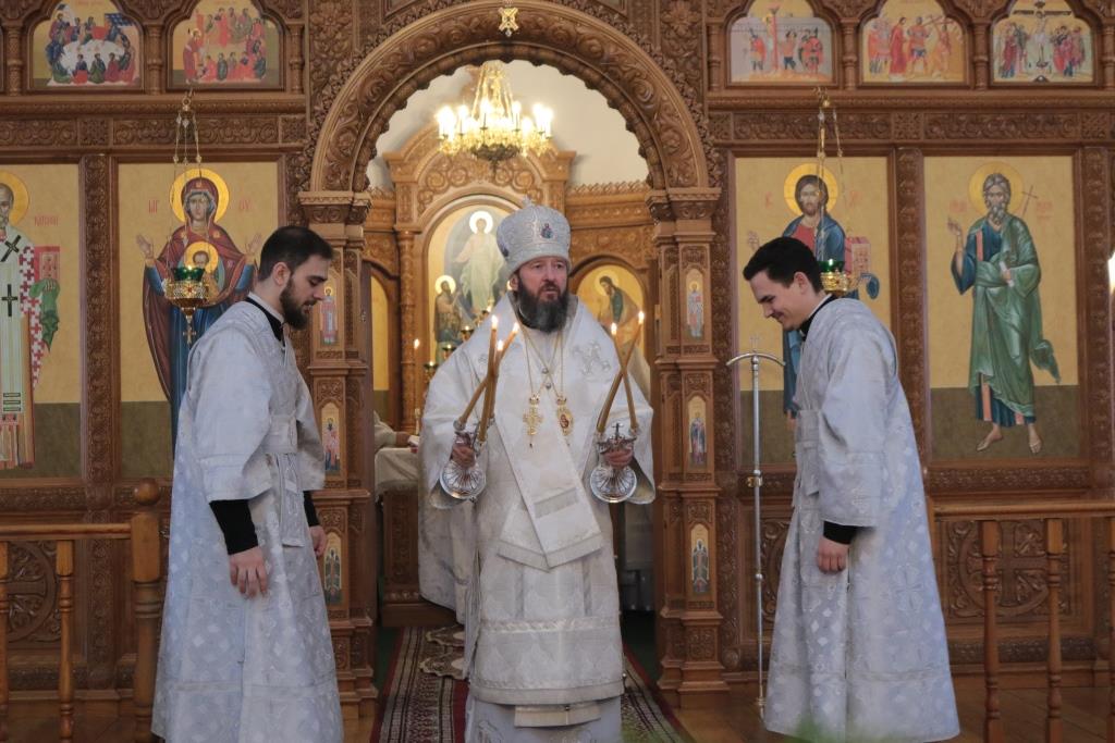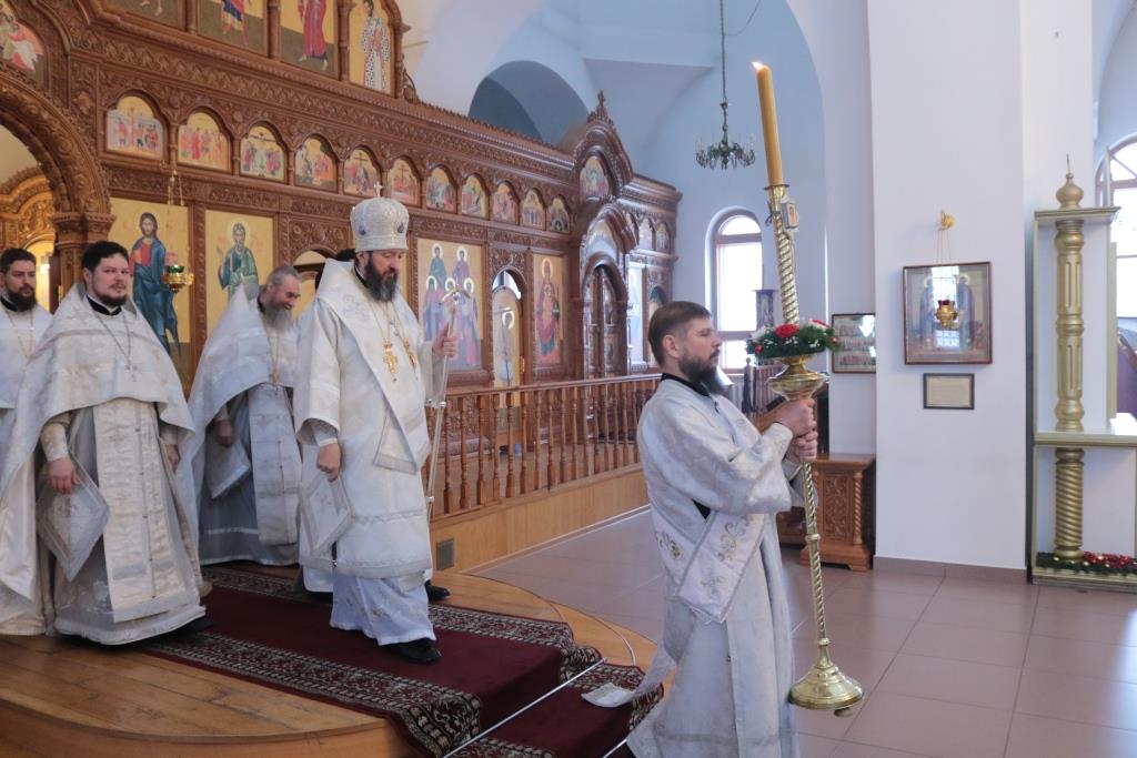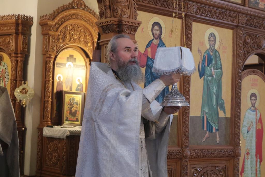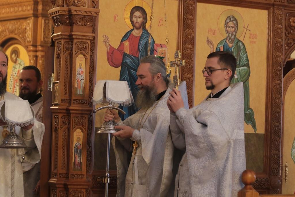 Его Преосвященству сослужили: ключарь Андреевского собора иеромонах Никодим (Авдеев), клирики собора иеромонах Силуан (Магилев), иерей Роман Подрезов, иерей Константин Дьяков, иеромонах Мефодий (Шевчук), секретарь епархии диакон Илия Кван, протодиакон Георгий Засыпкин и протодиакон Андрей Дудник.