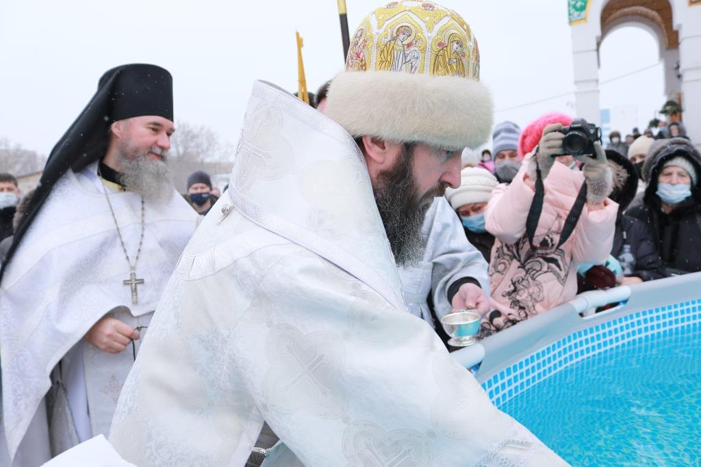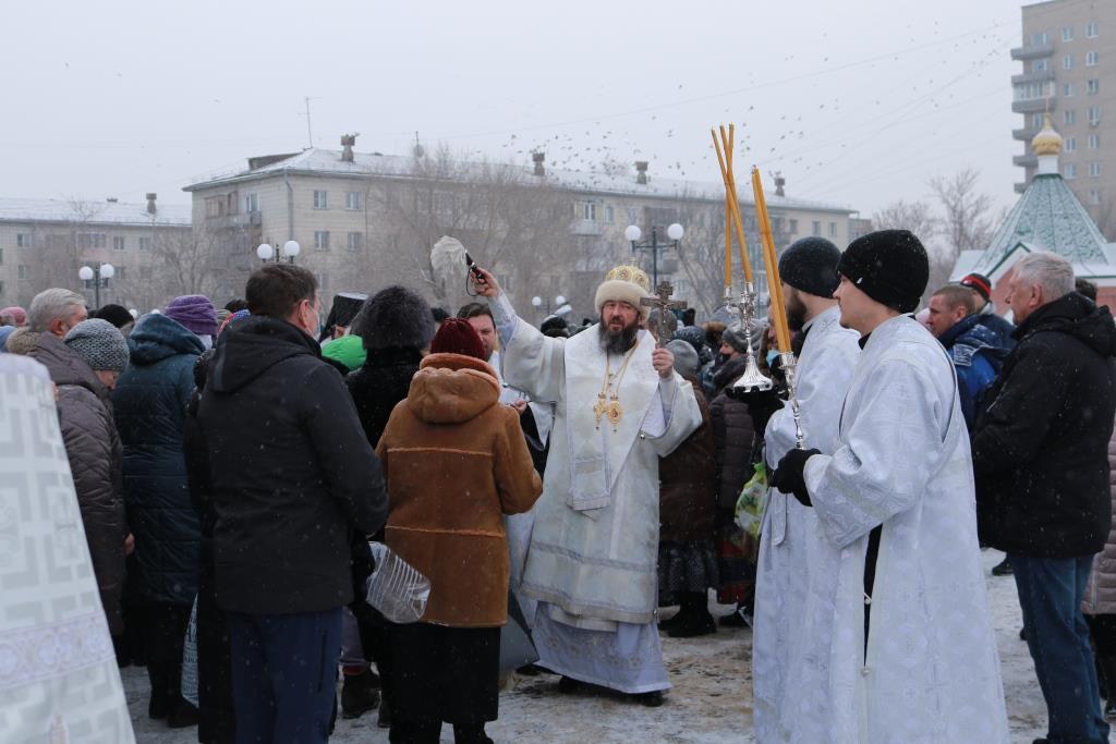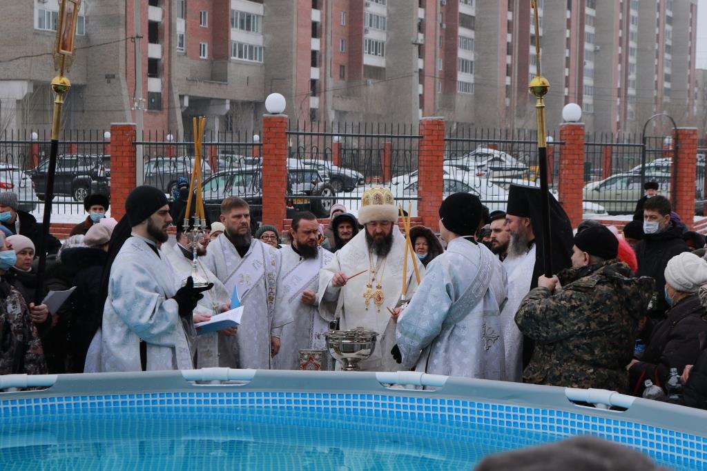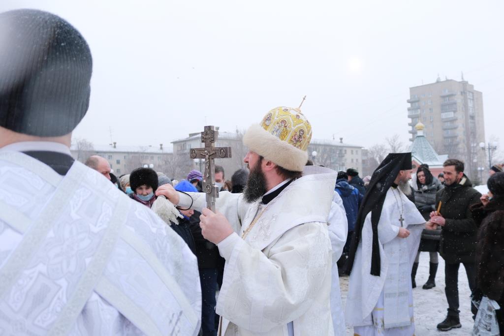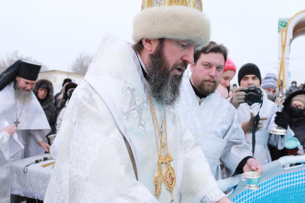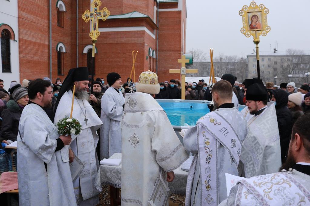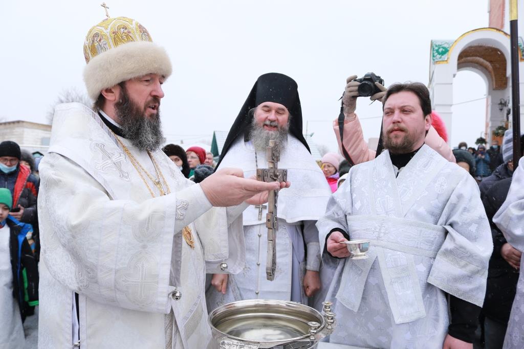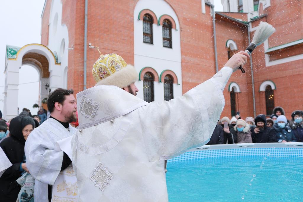 После заамвонной молитвы, при пении тропарей «Глас Господень на водах» епископ Амфилохий с клириками и молящимися крестным ходом вышли из храма на соборную площадь, где в специально устроенной купели было совершено великое освящение воды. В завершение праздничного богослужения Преосвященнейший Архипастырь поздравил народ Божий с великим торжеством Крещения Господня и обратился к христианам со словами наставления.