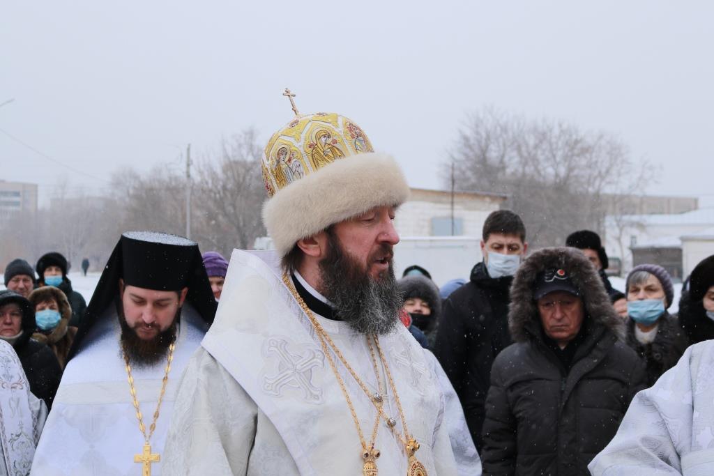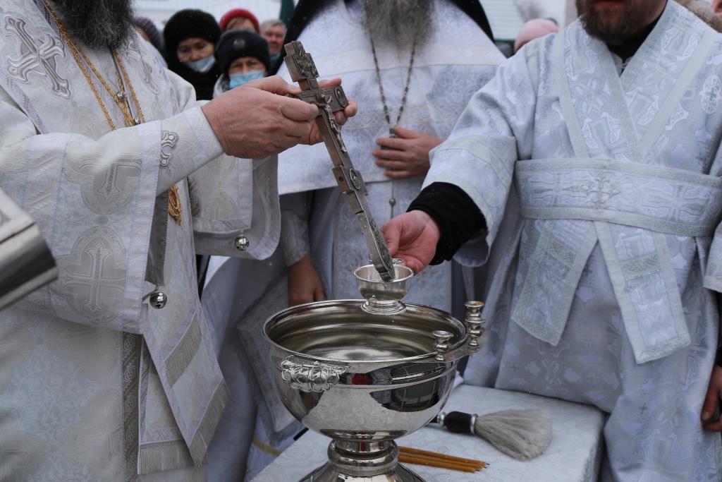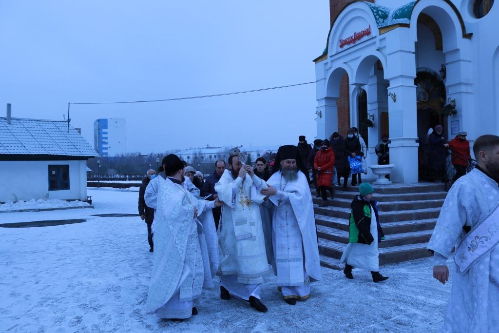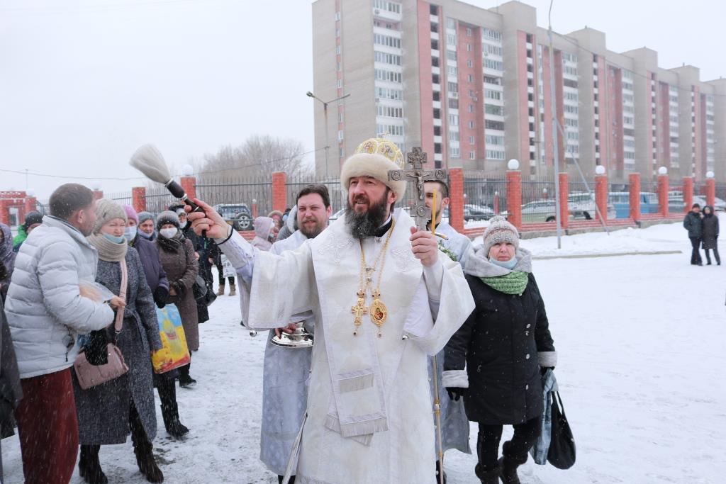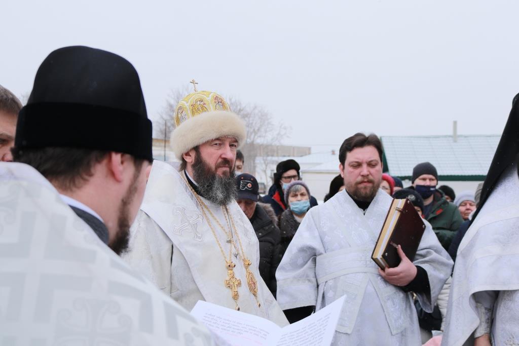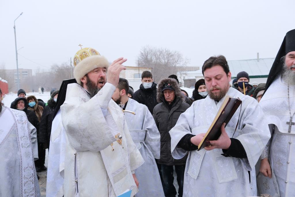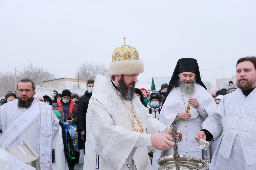 После заамвонной молитвы, при пении тропарей «Глас Господень на водах» епископ Амфилохий с клириками и молящимися крестным ходом вышли из храма на соборную площадь, где в специально устроенной купели было совершено великое освящение воды. В завершение праздничного богослужения Преосвященнейший Архипастырь поздравил народ Божий с великим торжеством Крещения Господня и обратился к христианам со словами наставления.