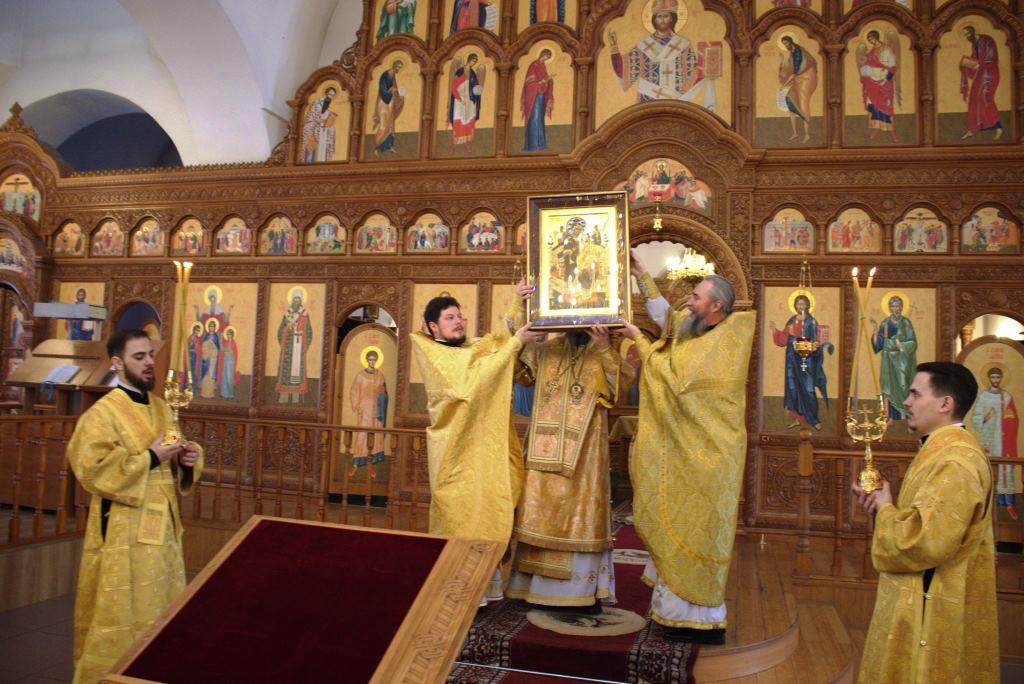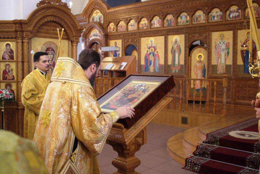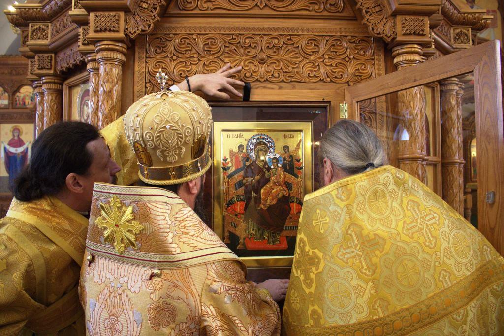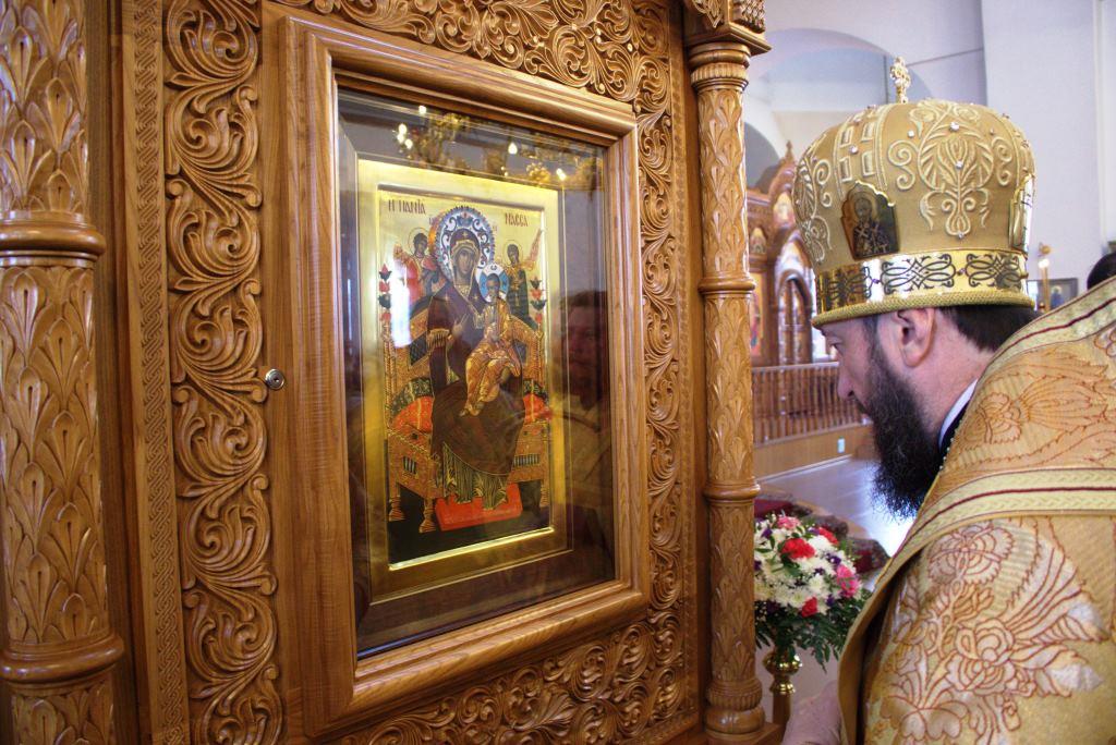 После выноса святыни из алтаря епископ Амфилохий в сослужении соборного духовенства совершил молебен перед чтимым образом. На молитве сугубо поминались православные христиане Рудного Алтая, благодетели и жертвователи православных храмов, и все «тяжкими недугами уязвленные». После величания Царице Небесной Архипастырь окропил духовенство и прихожан святой водой. Затем икона Божией Матери была помещена в специальный киот слева от царских врат главного придела, где и будет находиться для духовного укрепления и утешения православных христиан.